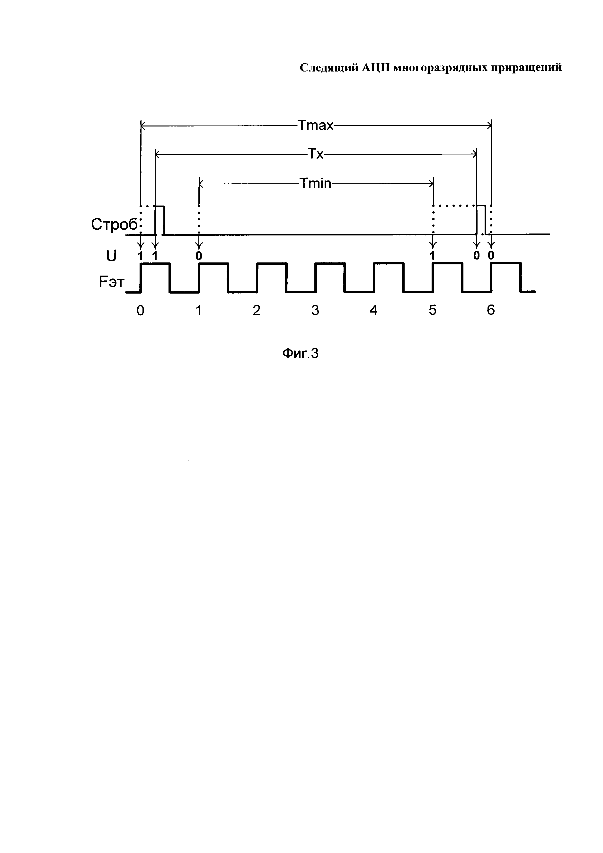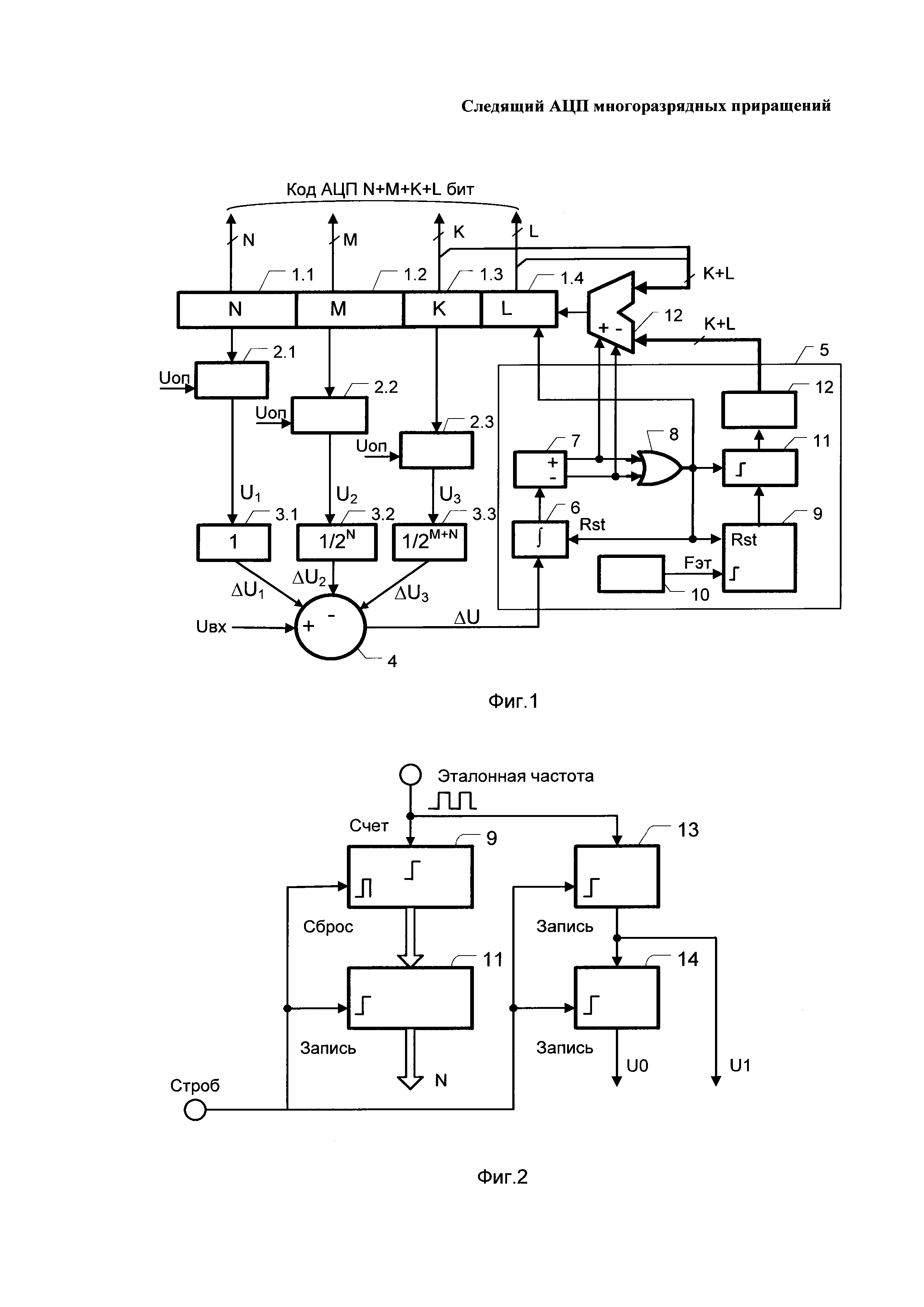 Следящий АЦП многоразрядных приращений, включающий в себя реверсивный счетчик, соединенный с ЦАП, вычитатель входного сигнала и выхода ЦАП, дополнительный АЦП разностного сигнала, вход которого соединен с выходом вычитателя, а старшие разряды выходного кода которого соединены со схемой приращения реверсивного счетчика, а младшие разряды которого образуют в совокупности с разрядами реверсивного счетчика выходной код следящего АЦП, отличающийся тем, что реверсивный счетчик разделен на несколько ступеней малой разрядности, каждая из которых содержит малоразрядный ЦАП, соединенный со ступенью реверсивного счетчика, выход которого соединен с делителем с коэффициентом деления, соответствующим разрядности предыдущих ступеней, выходы делителей соединены со схемой вычитателя входного напряжения, выход которой соединен с дополнительным АЦП разностного сигнала, который выполнен в виде преобразователя напряжения в частоту и содержит интегратор, выход которого соединен с компаратором, выходы сигналов положительного или отрицательного порога срабатывания которого через элемент ИЛИ соединены со входом сброса интегратора, а также со счетчиком выходного сигнала тактового генератора эталонной частоты в полутактах частоты, регистром-защелкой счетчика и входом сброса младших разрядов выходного кода, выход регистра-защелки соединен с адресным входом ПЗУ, выход ПЗУ соединен с первым входом сумматора-вычитателя приращения реверсивного счетчика, второй вход которого соединен с младшими разрядами выходного кода и младшими разрядами реверсивного счетчика, управляющие входы сумматора-вычитателя соединены с выходами компаратора.