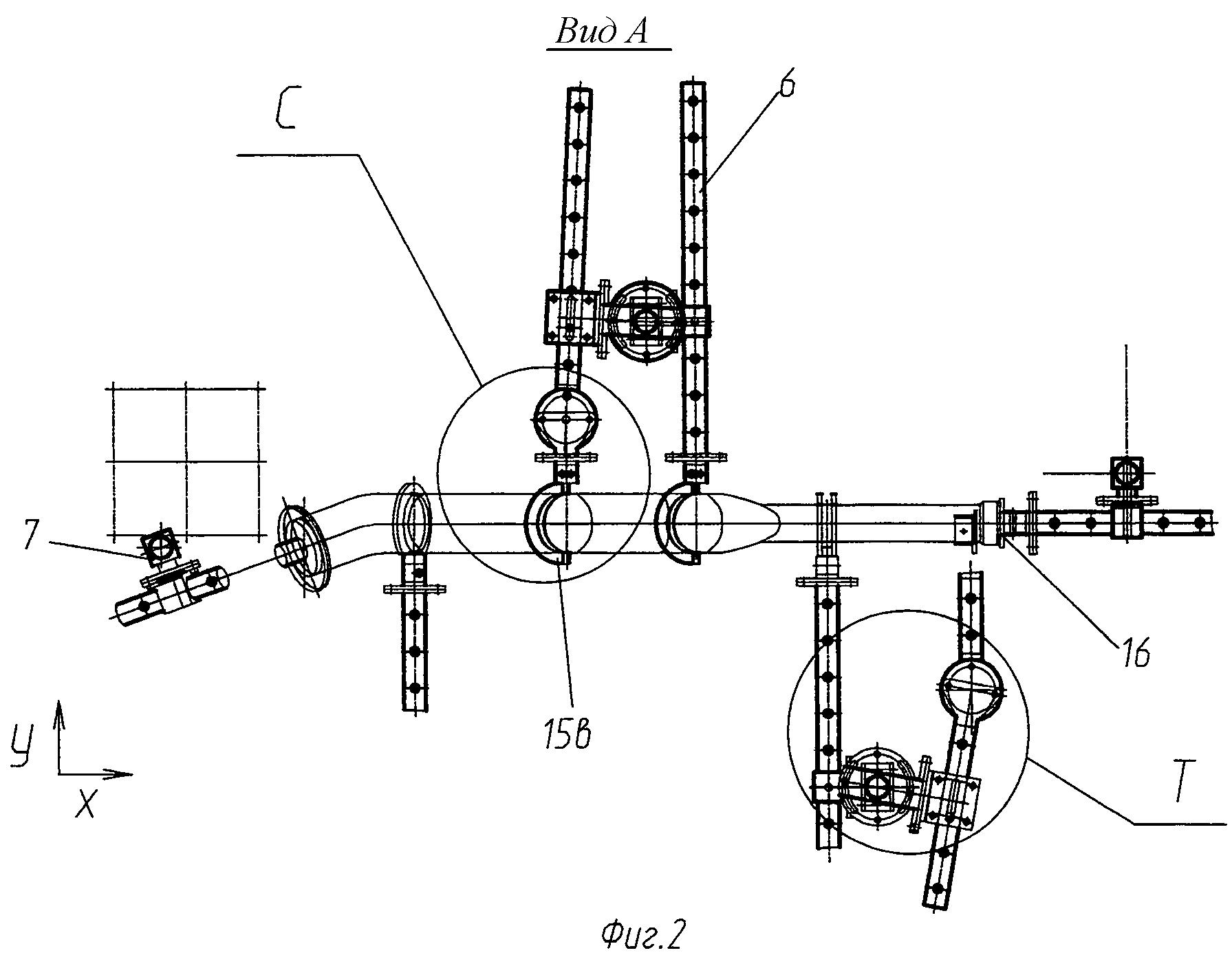 Изобретение относится к технологии машиностроения (а также самолето-, вертолето-, судо-, ракетостроения), в частности к способам получения сложных неразъемных конструкций деталей трубопроводов, систем: гидравлики, кондиционирования, обогрева, подачи топлива, антиобледенительной, противопожарной и др., и устройствам для их сборки и изготовления. Известен способ монтажа элементов стапельной оснастки, расположенных координатными осями в плоскостях, не параллельных системе координат инструментального стенда, содержащий каркас, в который вмонтированы дополнительные измерительные базы, а также группы фиксирующих элементов, закрепляемые с помощью переходных фитингов. (А.с. №1561434, кл. 6 B64F 5/00, 1987 г.) Недостатком данного способа является то, что все фиксирующие элементы оснастки преимущественно рамной конструкции монтируются (заливаются быстротвердеющей массой) на инструментальном стенде, и при необходимости изменения элементов оснастки или перемонтажа каркас оснастки необходимо вновь устанавливать на инструментальный стенд. Другим недостатком является то, что рамная конструкция оснастки не позволяет смонтировать сразу несколько элементов оснастки в одном или близко расположенных сечениях. Известно универсальное сборочное приспособление, состоящее из колонн, установленных на пол, горизонтальных балок, закрепленных на колоннах посредством координатно-базовых отверстий, узлов крепления ложементов, рубильников с пластинами, фиксаторов, выполненных в виде поворотных фитингов, вкладышей и вилок, имеющих пластины с расточенными отверстиями для фиксации угла поворота и необходимой дистанции. (Патент на ПМ №69019, кл. B64F 5/00, 2007 г.) Недостатком данного приспособления является то, что вертикальные колонны и горизонтальные балки предназначены для сборки объемных конструкций (узлов, агрегатов) и не подходят для сборки деталей трубопроводов, мелких узлов. Целью изобретения является создание устройства, позволяющего собирать детали трубопроводов сложных систем, для чего предусмотрена установка фиксаторов, упоров, ложементов (как универсальных, так и индивидуальных) по узлам сборочного устройства на любые необходимые дистанции, любые требуемые углы в пространстве по отношению к базовым дистанциям. Поставленная цель достигается тем, что в универсальном сборочном приспособлении (УСП) для предварительной и окончательной сборки деталей трубопроводов, состоящем из стола или балок, на которые крепятся кронштейны с основаниями, платформы с корпусами, в которые вставляются валы с закрепленными на них фиксаторами в виде дисков, втулок, кронштейнов, через которые можно присоединить ложементы разных типов и назначений, упоры для установки труб или патрубков на необходимые дистанции и углы, отличающемся тем, что столы, балки выполнены с сеткой взаимоперпендикулярных координатных Т-образных пазов; кронштейны с основаниями, платформы имеют возможность перемещения в продольном и поперечном направлениях основания на дистанцию от 0 до ±0,5 шага пазов стола (балок); валы выполнены в форме труб с координатным шагом взаимоперпендикулярных отверстий вдоль всей длины валов и с набором специальных пластин с отверстиями, выполненными по заданным размерам, устанавливающихся между кронштейнами, основаниями, платформами, корпусами, валами, фи