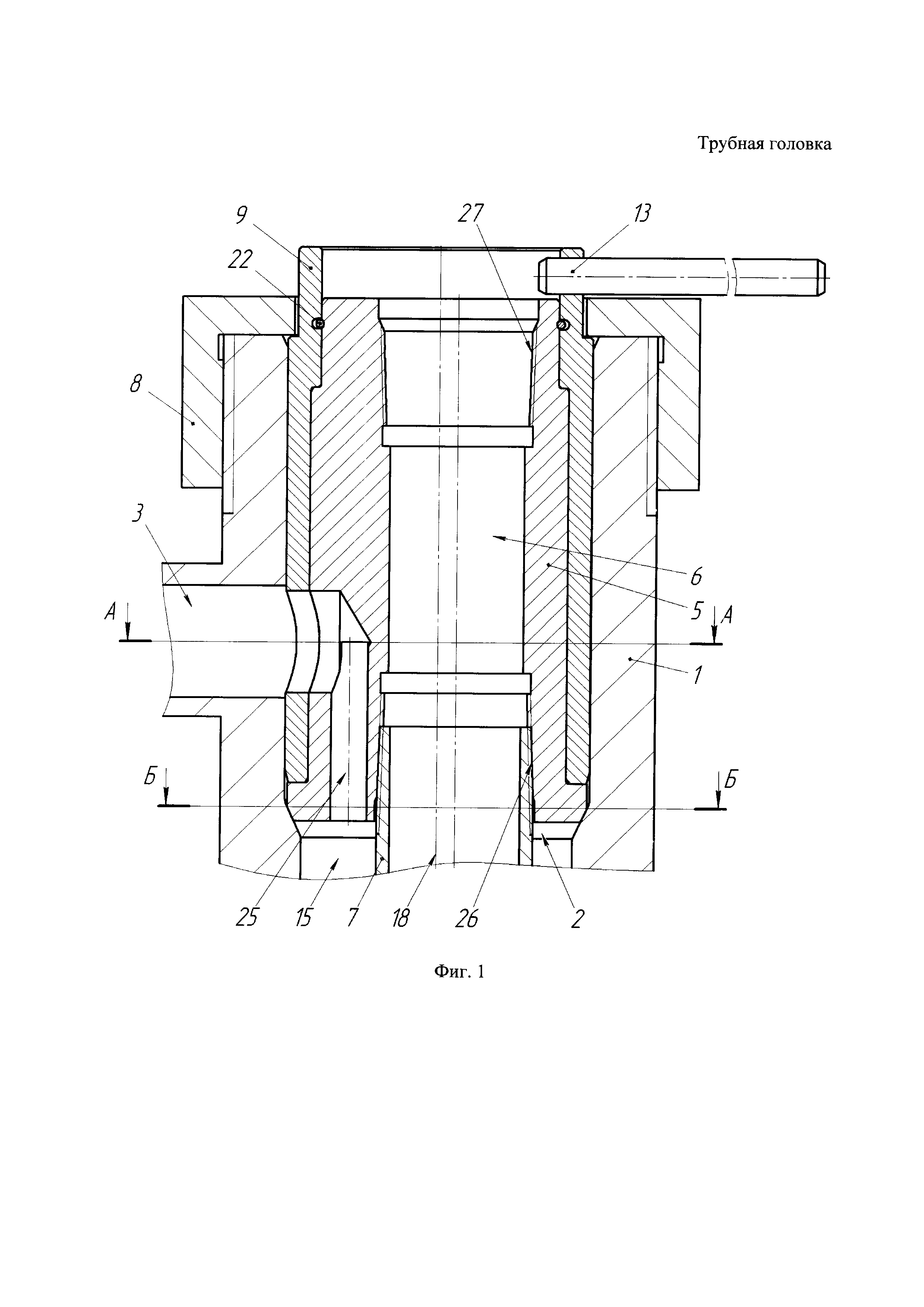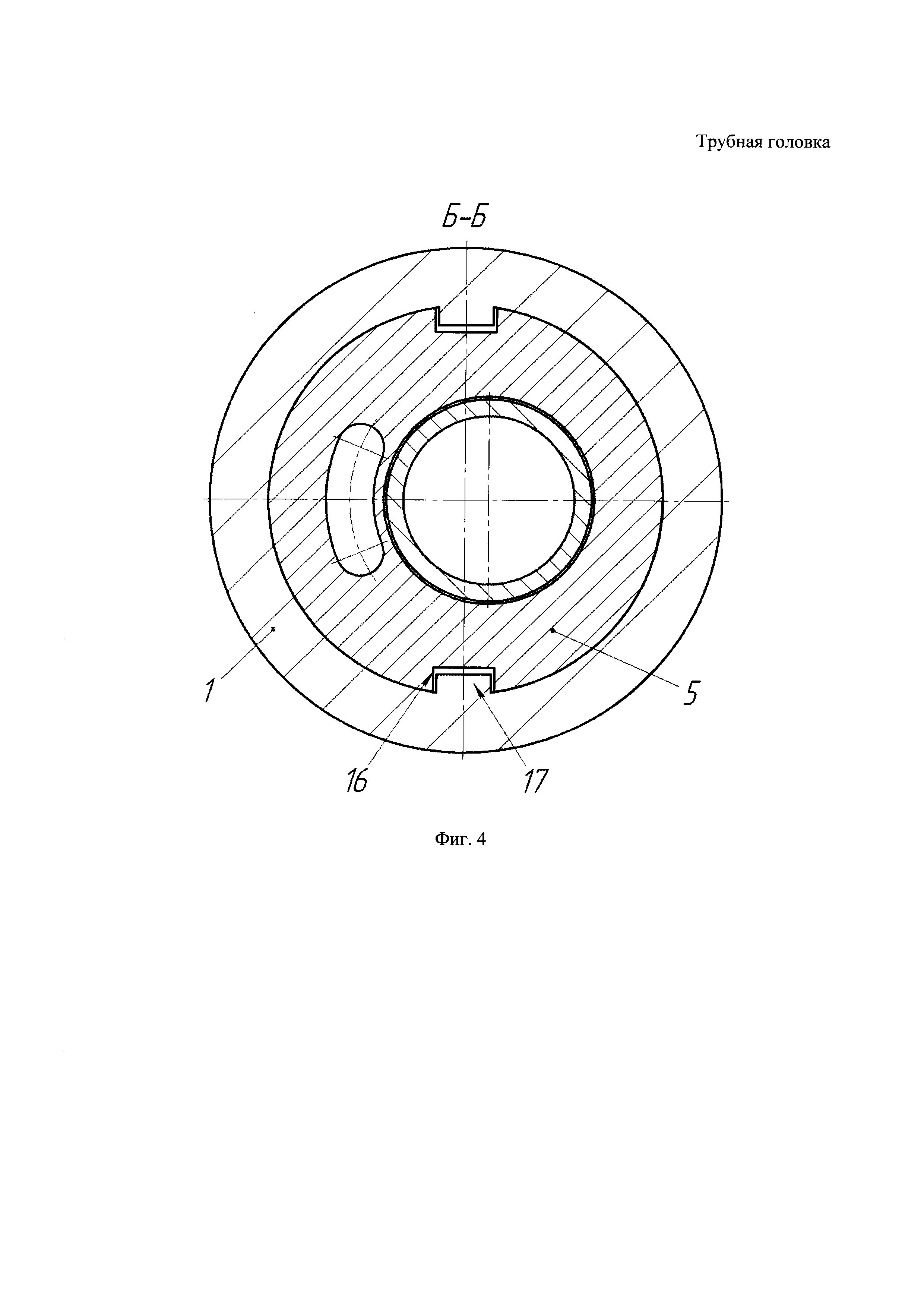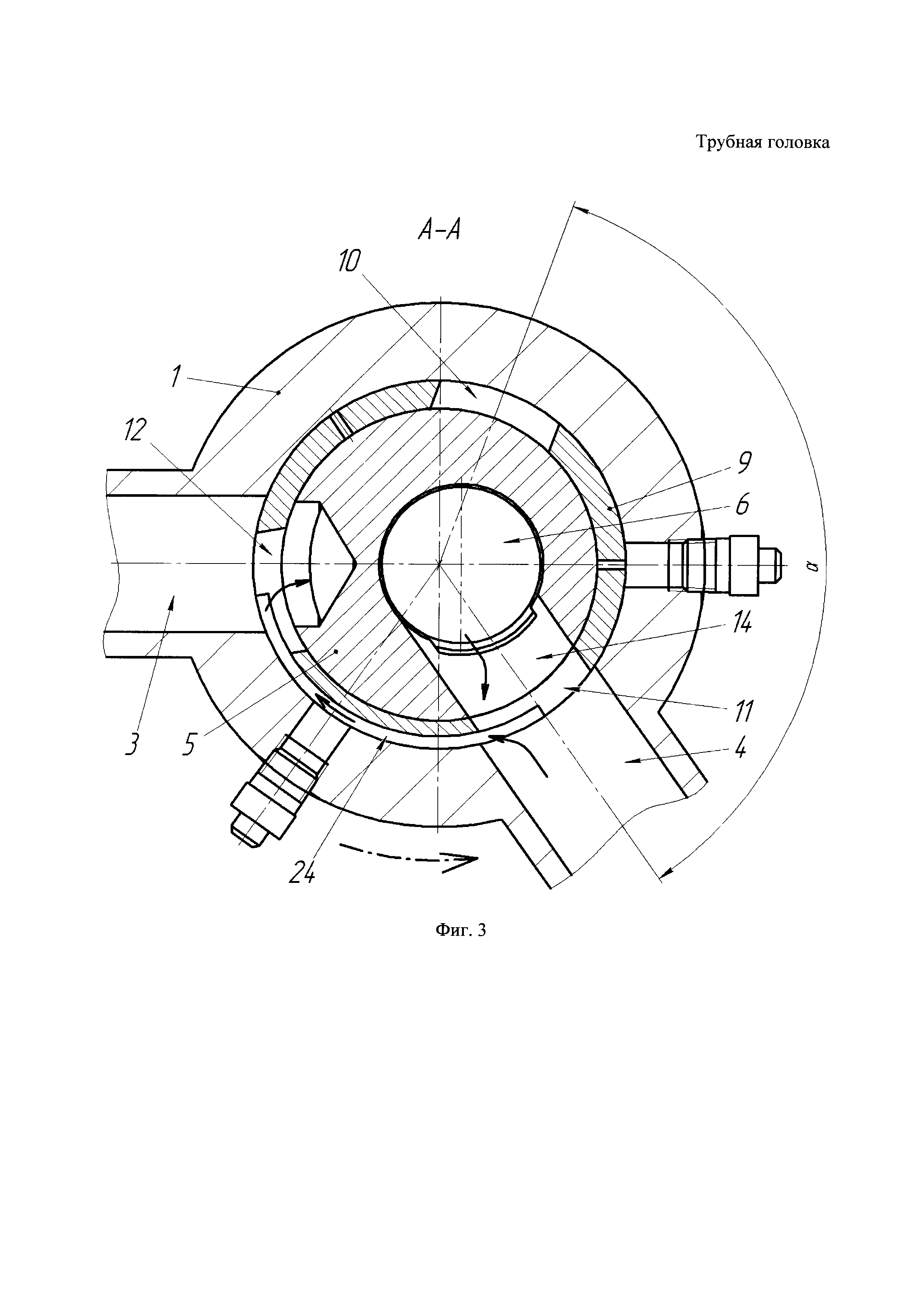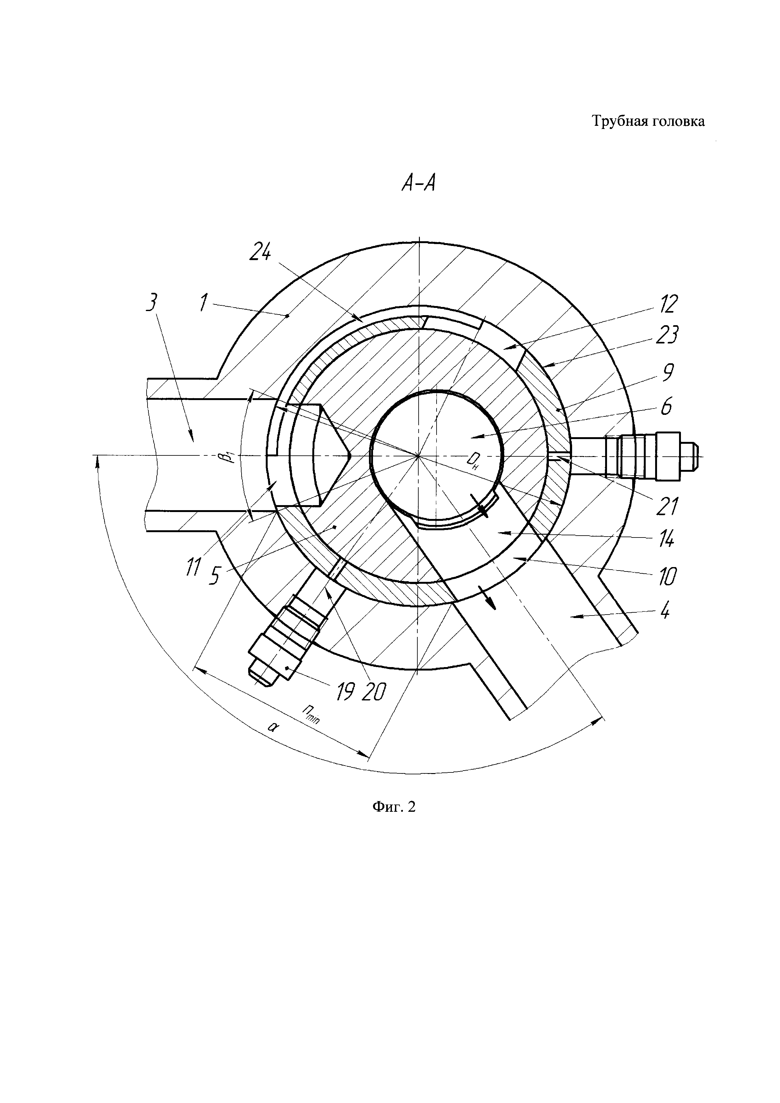Трубная головка, включающая корпус со ступенчатым осевым каналом, боковыми исследовательским каналом и линией сбора, трубодержатель, установленный в осевом канале корпуса, для подвески лифтовой колонны, крышку, втулку, размещенную снаружи трубодержателя, с радиальными каналами, узел поворота, причем трубодержатель и втулка установлены в корпусе так, что линия сбора корпуса при определенном повороте втулки выполнена с возможностью сообщения через радиальные каналы втулки с продольным каналом трубодержателя, а исследовательский канал корпуса выполнен с возможностью сообщения со скважинным пространством снаружи трубодержателя, причем снизу трубодержателя выполнены выступы или пазы, взаимодействующие с соответствующими внутренними пазами или выступами корпуса для исключения поворота, при этом втулка размещена в верхнем кольцевом расширении ступенчатого осевого канала корпуса, отличающаяся тем, что исследовательский канал и линия сбора размещены на одном уровне перпендикулярно оси корпуса под углом по его периметру, определяемым по формуле: где α - угол между исследовательским каналом и линией сбора, град.; nmin - минимально допустимое расстояние между каналами, позволяющее сохранить герметичность (величина перекрытия), мм; Dн - наружный диаметр втулки, мм; β1 - угол между диаметрально противоположными точками канала в корпусе относительно центральной оси корпуса, град.; β2 - угол между диаметрально противоположными точками отверстия во втулке относительно центральной оси втулки, град., причем втулка установлена герметично между корпусом и трубодержателем с возможностью поворота при помощи узла поворота, расположенного сверху втулки и выше крышки, три канала во втулке выполнены на одном уровне под одинаковым углом от среднего канала, соответствующим углу между исследовательским каналом и линией сбора, на внутренней или наружной поверхности втулки выполнена проточка, сообщающая средний канал с каналом, не совмещенным с линией сбора, при этом каналы во втулке выполнены с возможностью последовательного сообщения с каналами в корпусе при повороте втулки внутри корпуса, а трубодержатель оснащен дополнительным продольным каналом, выполненным с возможностью сообщения с исследовательским каналом корпуса через один из радиальных каналов втулки.
