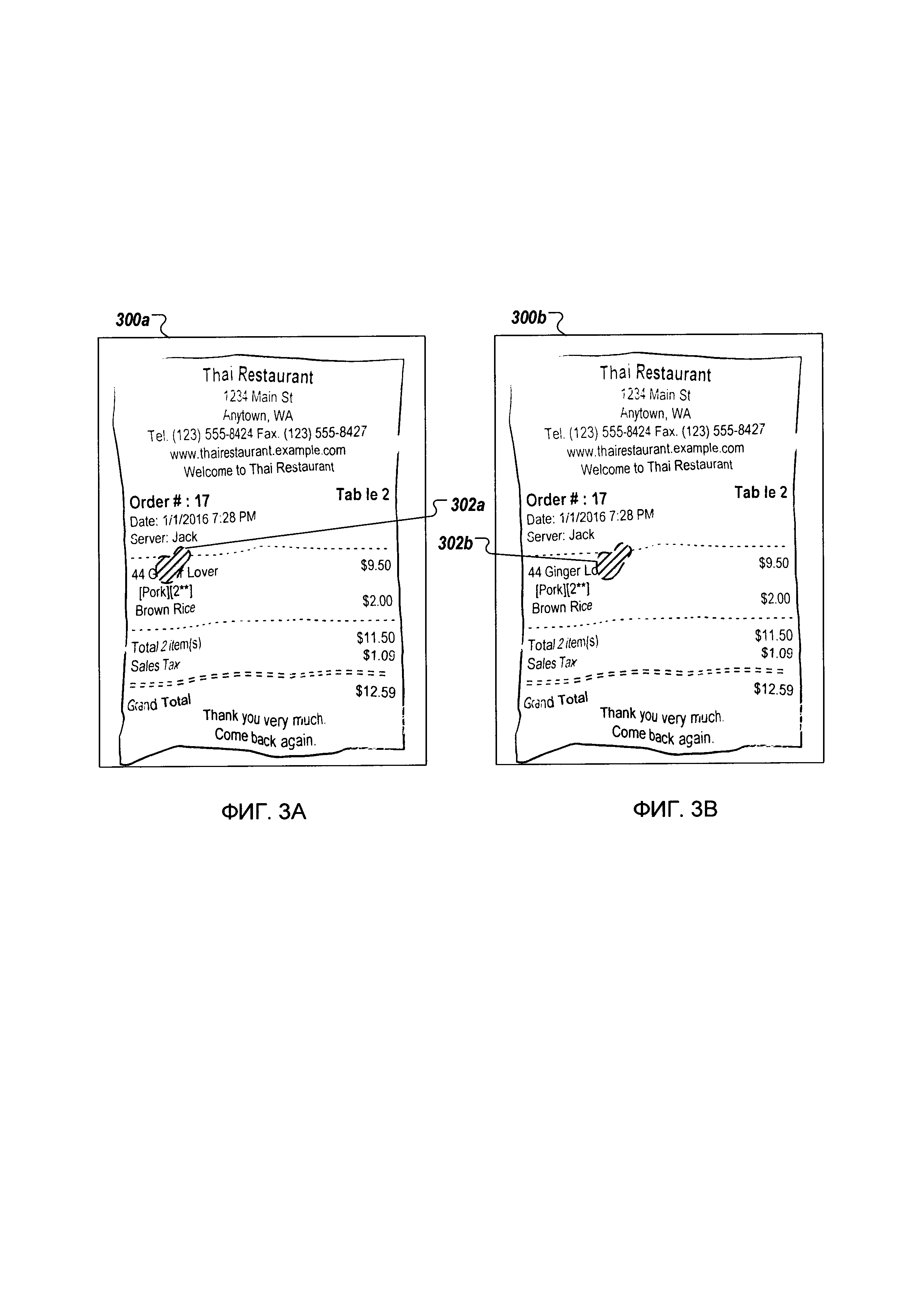 ). Система распознавания 108 может объединять символы, выявляя медианную строку кластера совпадающих последовательностей символов, полученных при оптическом распознавании символов с изображений 300a-b, или определяя факт наличия у наборов символов предельного количества общих символов (например, «44 G» в начале, «Lo» в середине и(или) «9,50 долл.» в конце наборов символов). Вместо этого или в дополнение к этому система распознавания 108 может устанавливать соответствие позиций первых символов с первой разметкой и позиций вторых символов со второй разметкой друг другу, используя преобразование, основанное на опорном объекте, который присутствует как на первом изображении 300а, так и на втором изображении 300b.