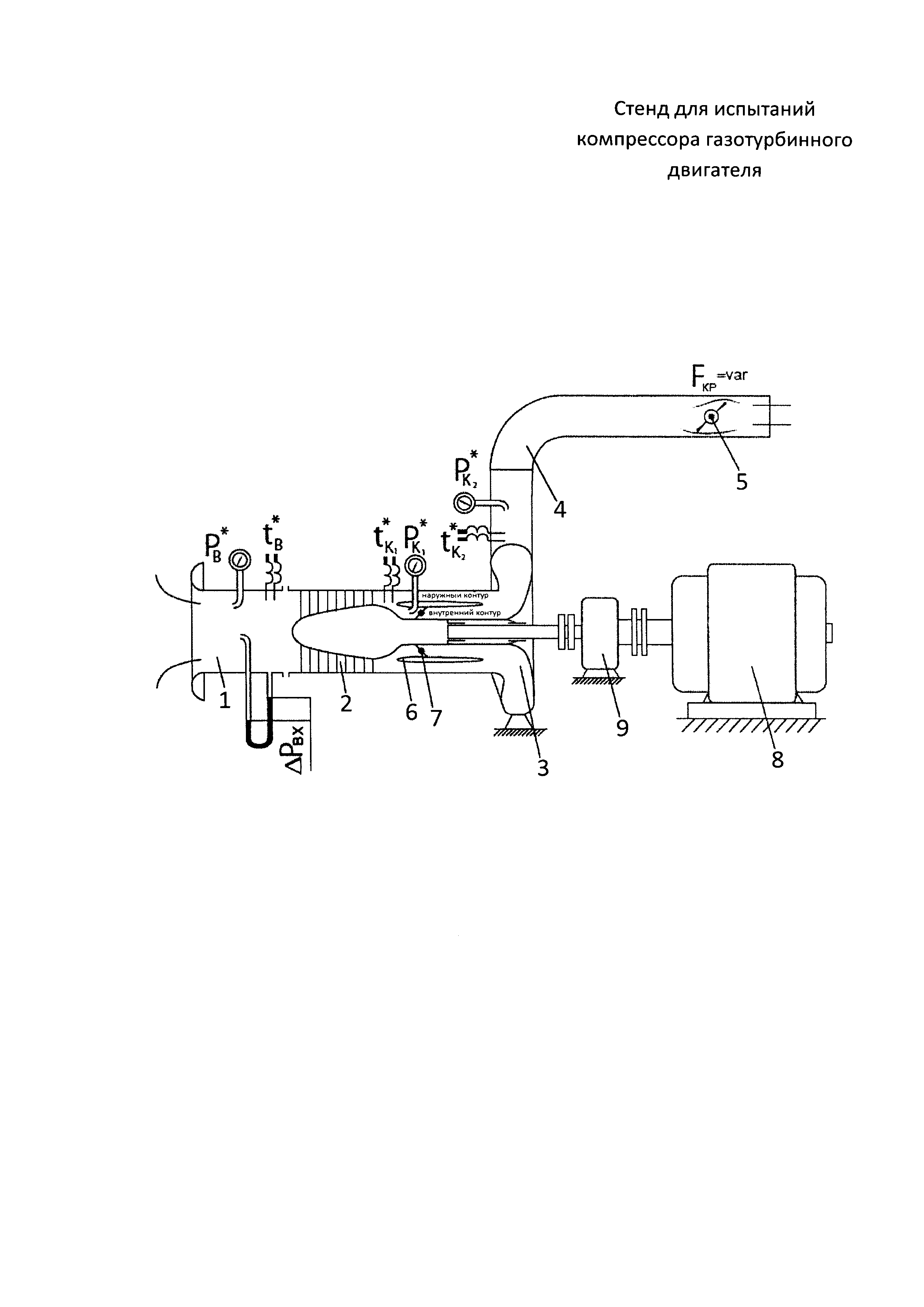 Предлагаемое изобретение относится к стендам для испытаний осевых компрессоров низкого давления двух-(много)контурного газотурбинного двигателя и может быть использовано при изучении характеристик компрессоров низкого давления, а также их параметрической доводки в процессе выполнения работ по разработке новых газотурбинных двигателей. Техническим результатом, достигаемым при использовании заявленного изобретения, является возможность имитации условий различных режимов работы испытуемого компрессора в составе двухконтурного двигателя в реальных условиях. 1 ил.