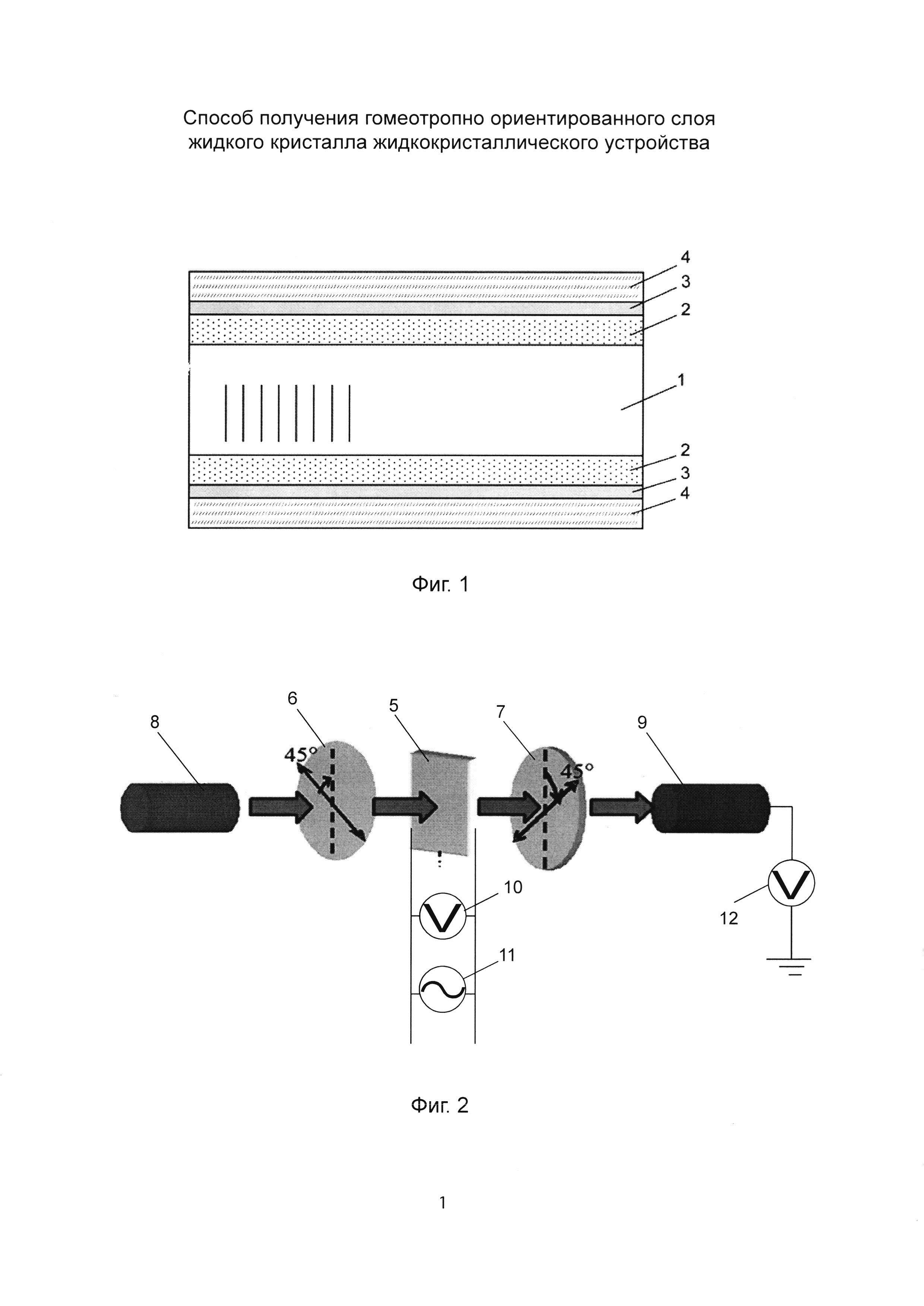 Изобретение относится к изготовлению жидкокристаллических ячеек для жидкокристаллических приборов различных информационных систем. Описывается способ получения гомеотропно ориентированного слоя жидкого кристалла жидкокристаллического устройства (ЖК). Способ включает нанесение на подложку ЖК ячейки ориентанта формулы (1)или,где R= R= СFO-,,,,Q = CO или CS; Z = -NHRили -N(R), где Rалкил С-С, Z = -NHRили -N(R), где Rалкил CH, k = 1-8, в растворителе, например в хладоне 112. Подложку вымачивают в растворе ориентанта (1), осуществляют обдув, центрифугирование, закрепление слоя ориентанта (1) и смывание незакрепленного покрытия. Изобретение обеспечивает максимально точную гомеотропную ориентацию жидкого кристалла ЖК устройства: вне зависимости от структуры ориентанта (1), значений Q и Z угол ориентации не изменяется и составляет 90°. 3 з.п. ф-лы, 2 ил., 1 табл., 1 пр.