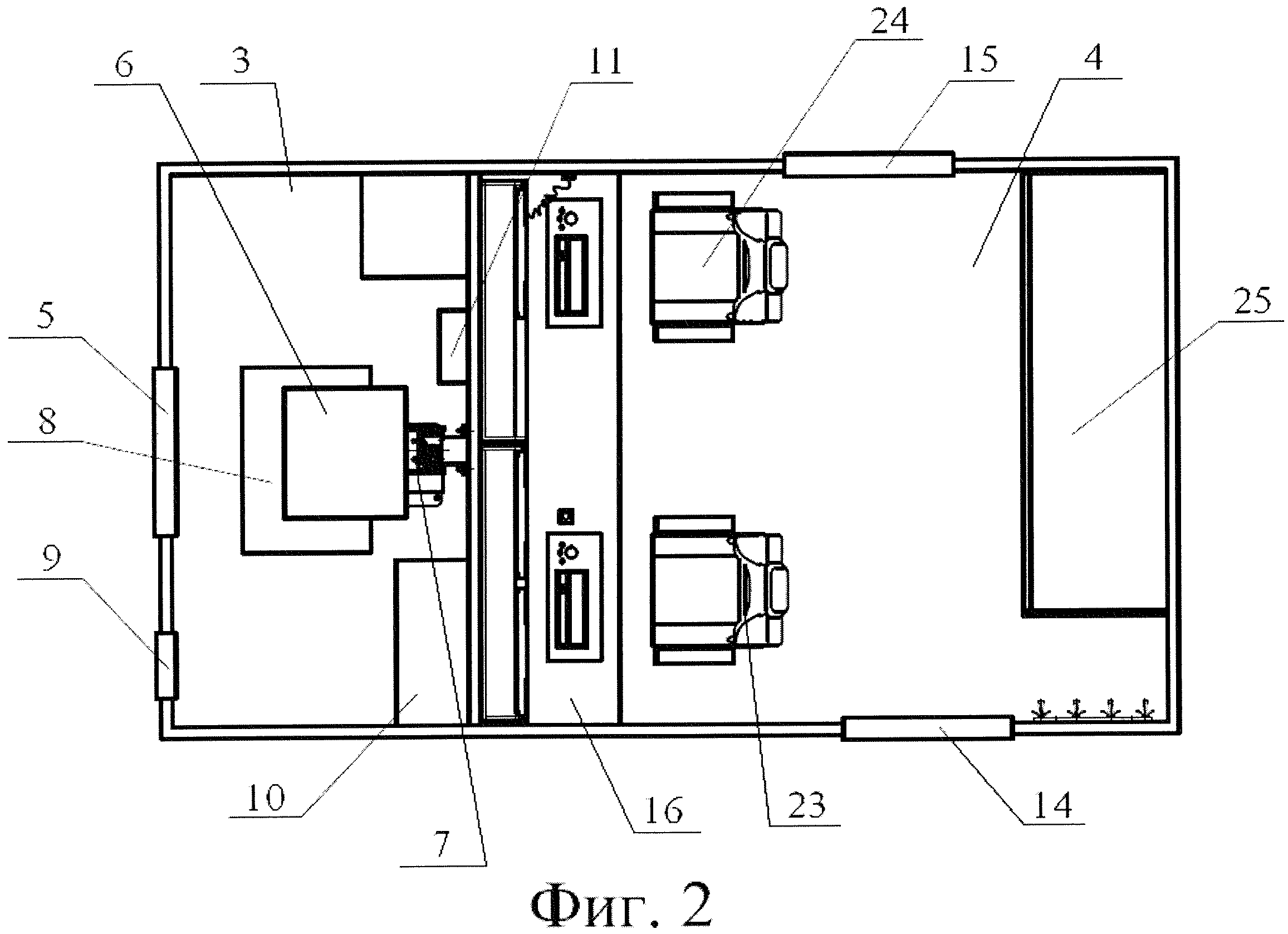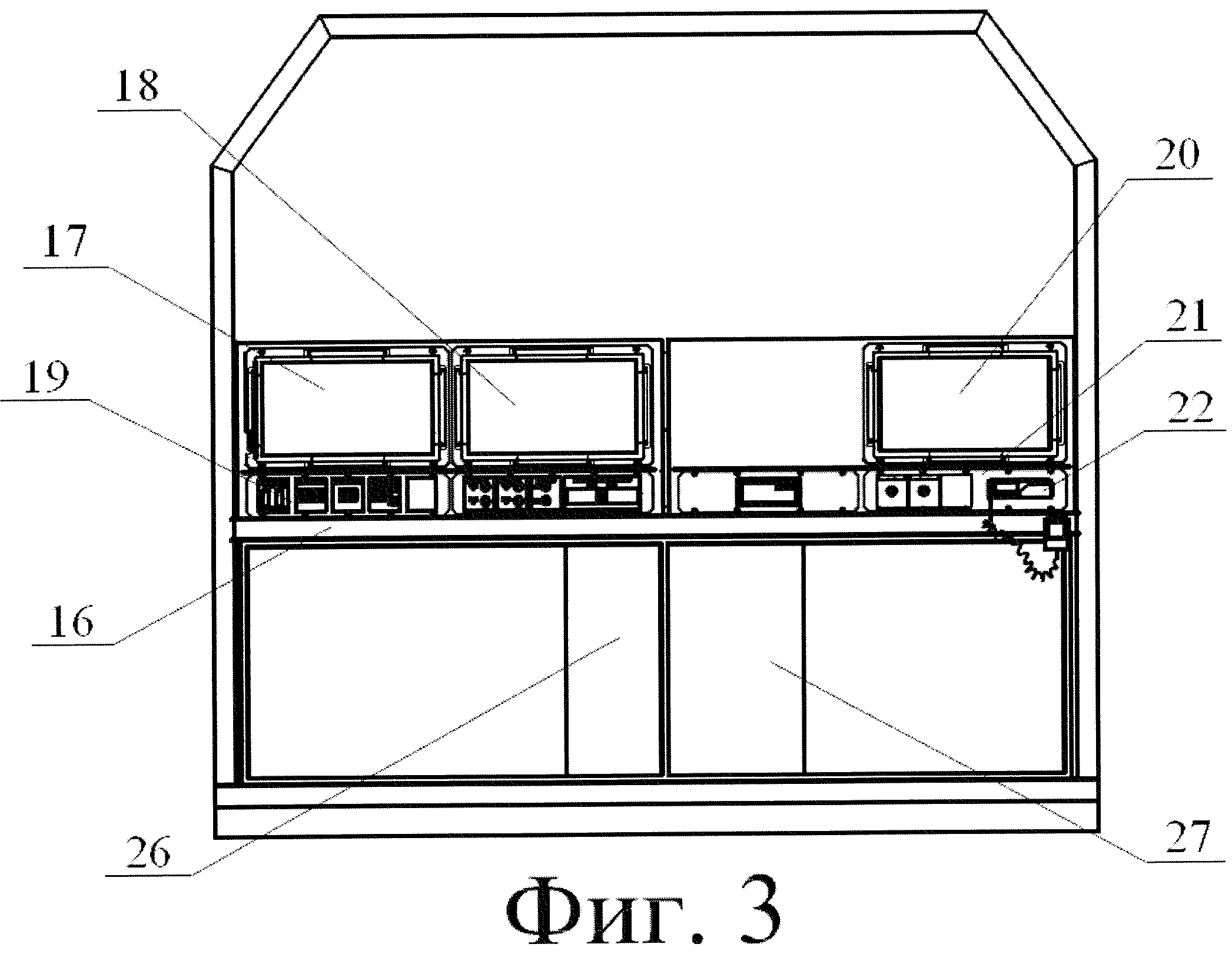 1. Подвижной пост технического наблюдения, содержащий транспортное средство в виде грузового автомобиля повышенной проходимости с кузовом-фургоном, разделенным на два отсека: приборный и аппаратный, при этом в приборном отсеке размещен установленный на мачте оптико-электронный модуль, объединяющий в себе видеокамеру и охлаждаемый тепловизор большой дальности действия, а снаружи на передней стенке кузова-фургона закреплено подъемное устройство с радиолокационным модулем, включающим когерентную радиолокационную станцию обнаружения движущихся наземных и надводных целей, при этом подъемное устройство выполнено с возможностью установки радиолокационной станции выше оптико-электронного модуля в рабочем положении поста, а в аппаратном отсеке размещены система связи и передачи данных, места для отдыха, а также два рабочих места, при этом одно рабочее место выполнено с возможностью управления радиолокационным и оптико-электронными модулями, а второе с возможностью сбора информации от модулей с выдачей информации внешним потребителям через систему связи и передачи данных; система электропитания выполнена в виде дизельной электростанции с резервированием от аккумуляторных батарей; на крыше кузова-фургона и на капоте транспортного средства размещены антенны системы связи и передачи данных, а для скрытного выдвижения на позицию пост оборудован оптико-электронной системой ночного вождения. 2. Подвижной пост по п.1, отличающийся тем, что на крыше кузова-фургона размещена система спутниковой навигации. 3. Подвижной пост по п.1, отличающийся тем, что аппаратный отсек оборудован системами принудительной вентиляции и кондиционирования воздуха.