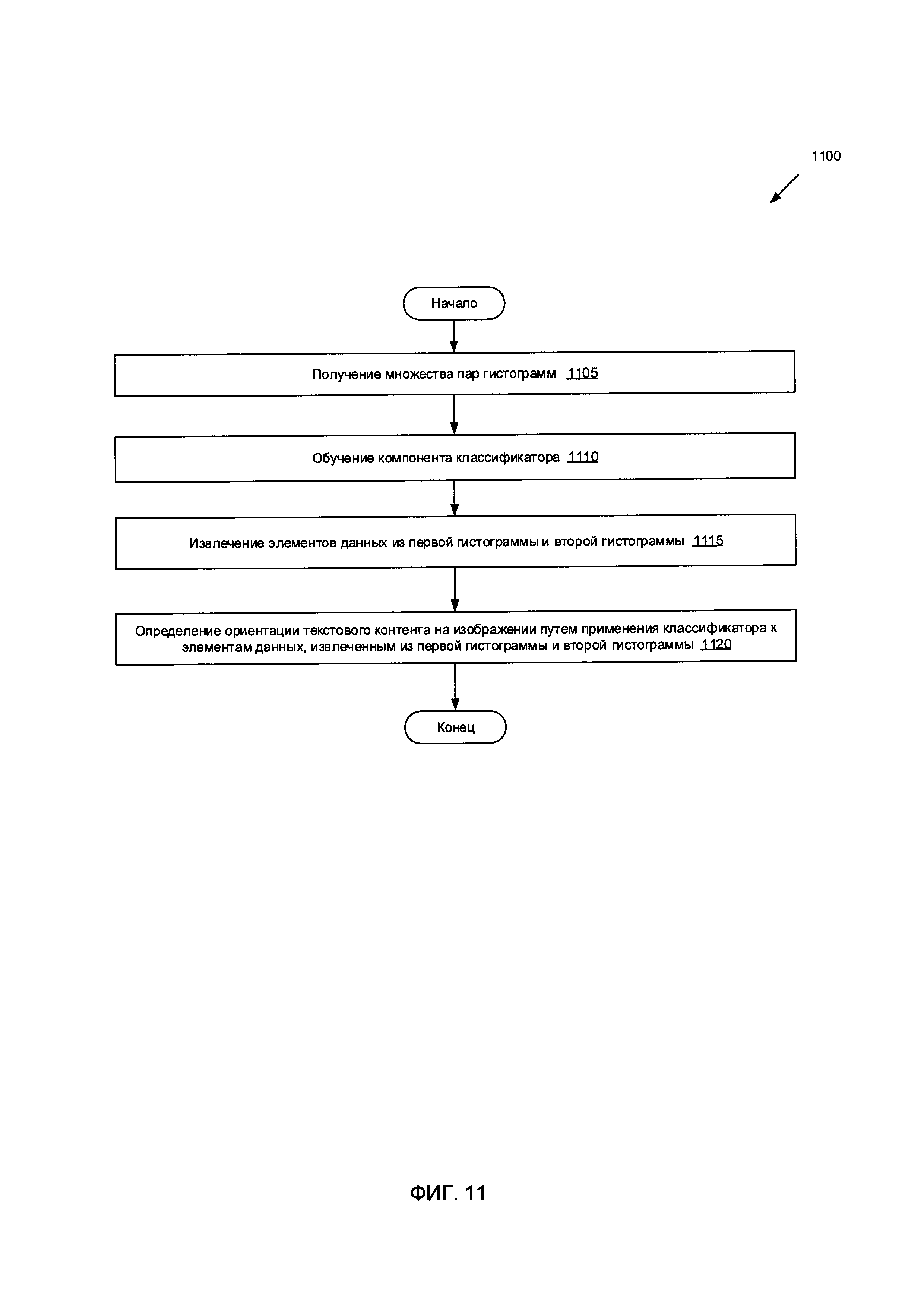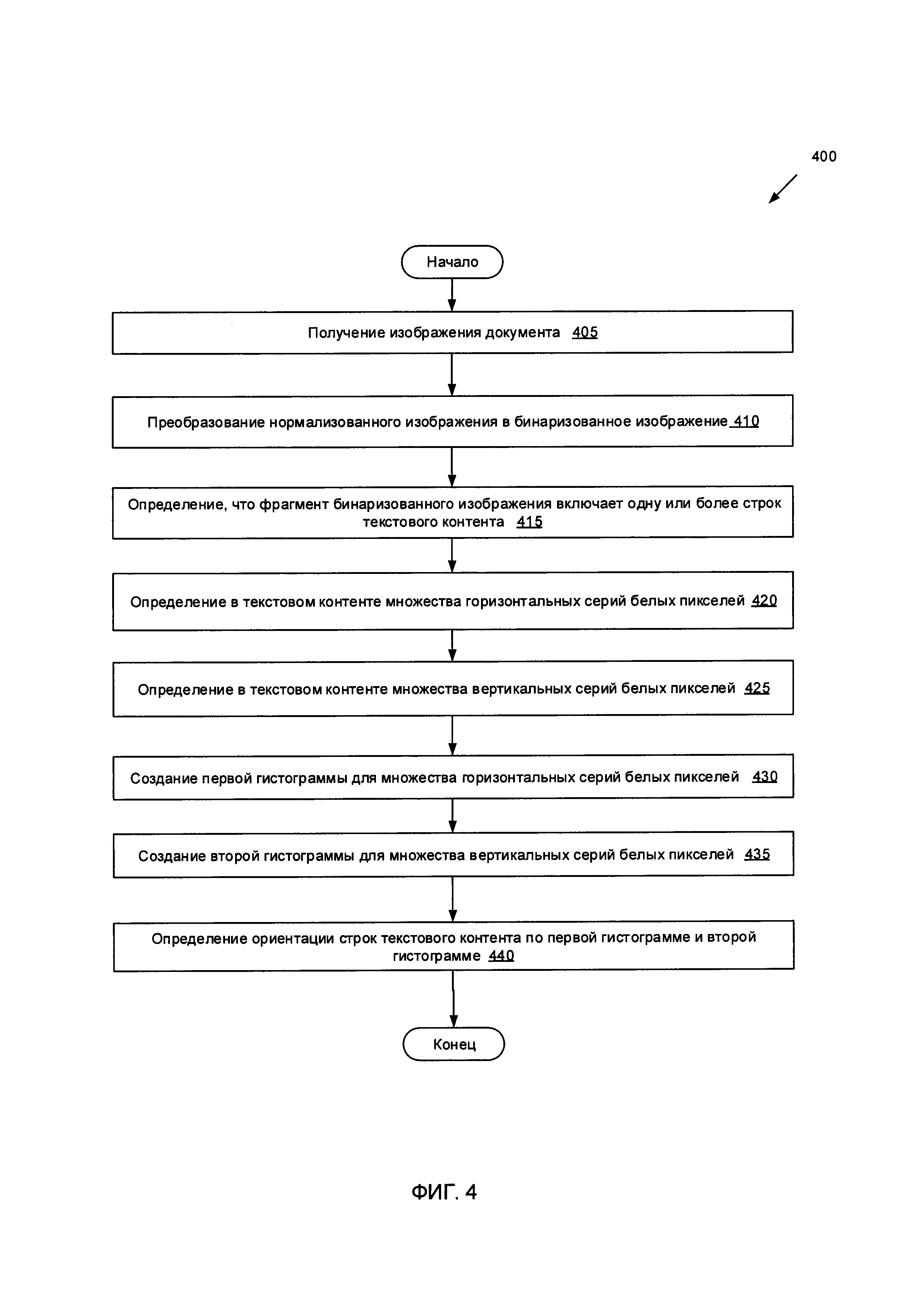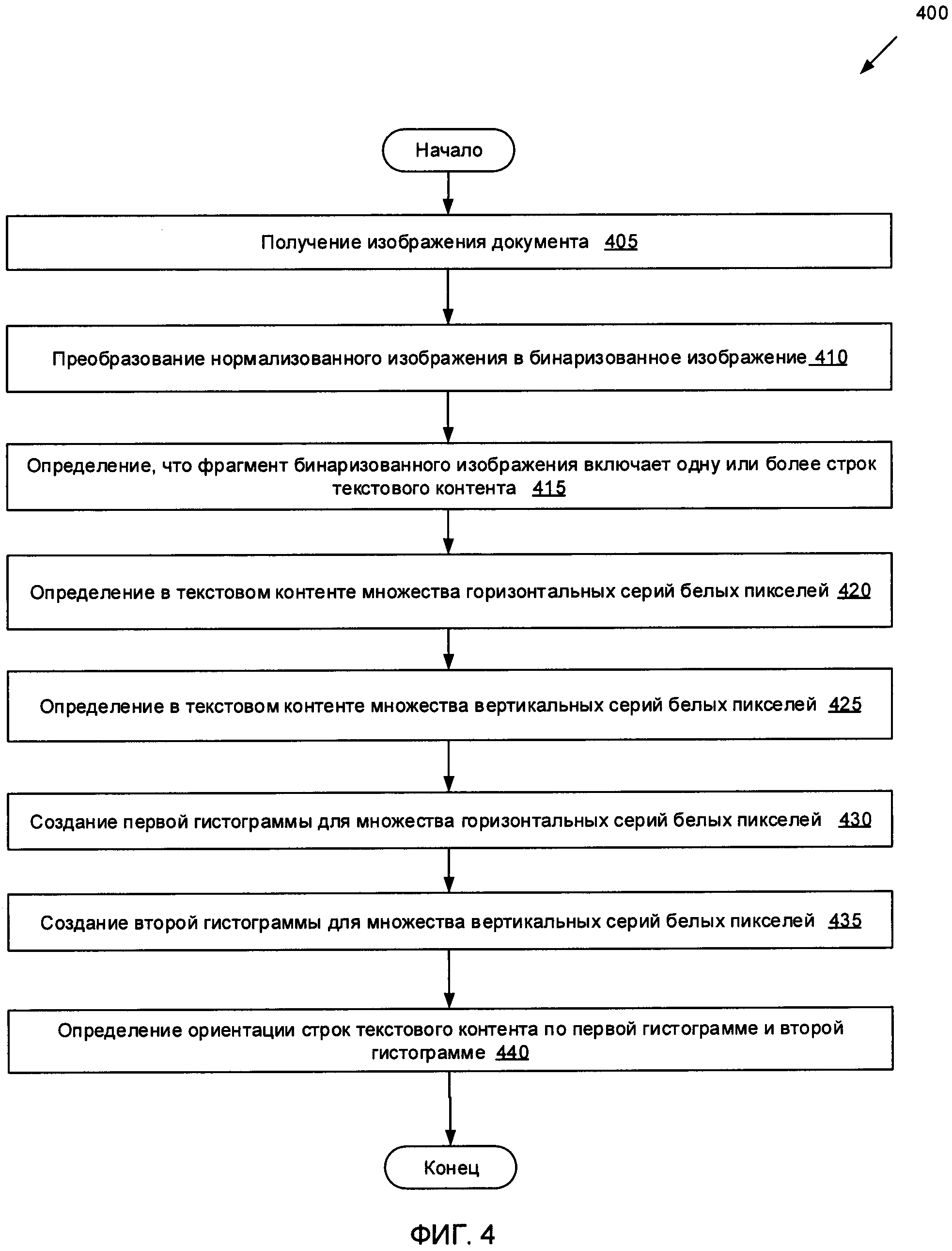 1. Способ определения ориентации строк текстового контента на изображении документа, включающий: получение изображения документа устройством обработки; преобразование данного изображения в бинаризованное изображение путем выполнения в отношении данного изображения операции бинаризации; определение фрагмента бинаризованного изображения, который включает одну или более строк текстового контента; определение множества горизонтальных серий белых пикселей в одной или более строк текстового контента в данном фрагменте бинаризованного изображения и множество вертикальных серий белых пикселей в одной или более строк текстового контента в данном фрагменте бинаризованного изображения; создание первой гистограммы для множества горизонтальных серий белых пикселей и второй гистограммы для множества вертикальных серий белых пикселей; а также определение устройством обработки ориентации одной или более строк текстового контента на изображении на основе первой гистограммы и второй гистограммы. 2. Способ по п. 1, дополнительно включающий: преобразование изображения в нормализованное изображение путем уменьшения размера данного изображения до предопределенного размера. 3. Способ по п. 1, отличающийся тем, что первая гистограмма включает первое множество столбцов гистограммы, каждый из которых соответствует длине одной или более из множества горизонтальных серий белых пикселей, и отличающийся тем, что вторая гистограмма включает второе множество столбцов гистограммы, каждый из которых соответствует длине одного или более из множества вертикальных серий белых пикселей. 4. Способ по п. 3, отличающийся тем, что определение ориентации одной или более строк текстового контента включает: выбор первого набора столбцов гистограммы из первого множества столбцов гистограммы, при этом первый набор столбцов гистограммы включает горизонтальные серии белых пикселей, которые не превышают пороговую длину; расчет первой площади первого набора столбцов гистограммы из первой гистограммы; выбор второго набора столбцов гистограммы из второго множества столбцов гистограммы, при этом второй набор столбцов гистограммы включает вертикальные серии белых пикселей, которые не превышают данную пороговую длину; а также расчет второй площади второго набора столбцов гистограммы из второй гистограммы. 5. Способ по п. 4, дополнительно включающий: сравнение первой площади со второй площадью; в ответ на решение о том, что первая площадь больше второй площади, установка максимальной площади на значение первой площади и минимальной площади на значение второй площади; в ответ на решение о том, что вторая площадь больше первой, установка максимальной площади на значение второй площади и минимальной площади на значение первой площади; расчет отношения площадей путем деления максимальной площади на минимальную площадь; а также в ответ на решение о том, что отношение площадей превышает заданное пороговое значение, определение ориентации одной или более строк текстового контента на изображении на основе максимальной площади. 6. Способ по п. 5, отличающийся тем, что определение ориентации одной или более строк текстового контента на изображении по максимальной площади включает: в ответ на решение о том, что первая площадь больше второй площади, опре