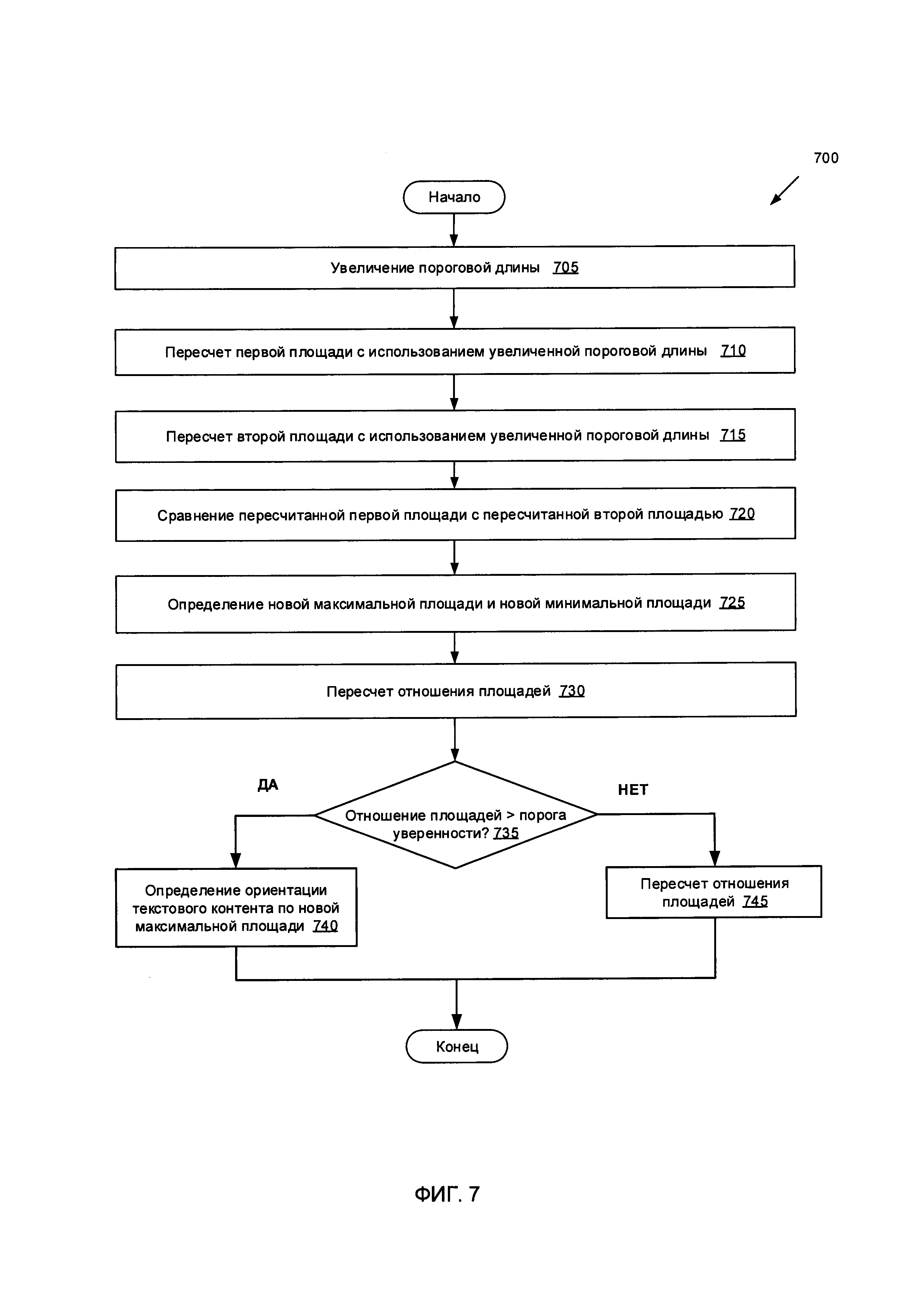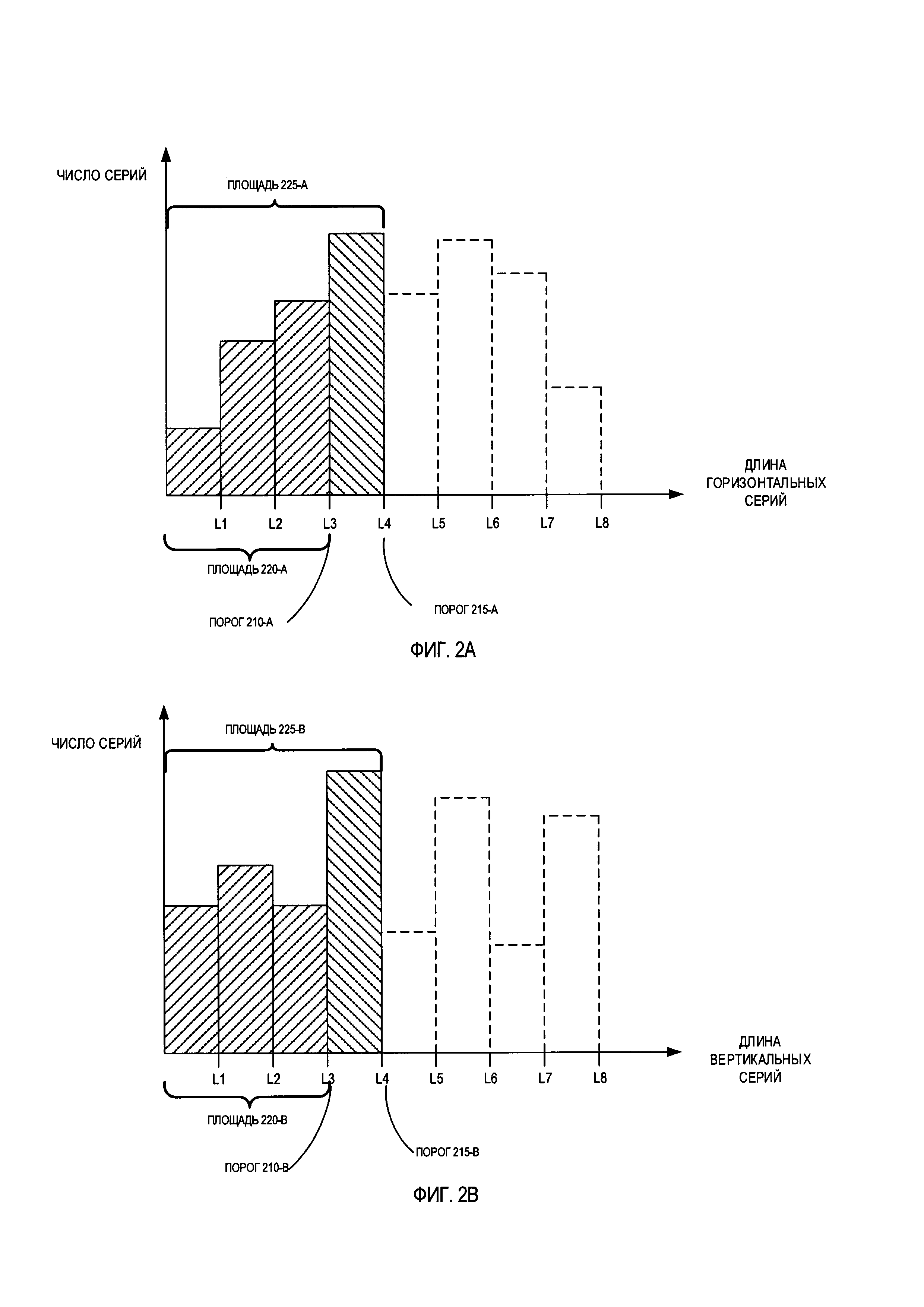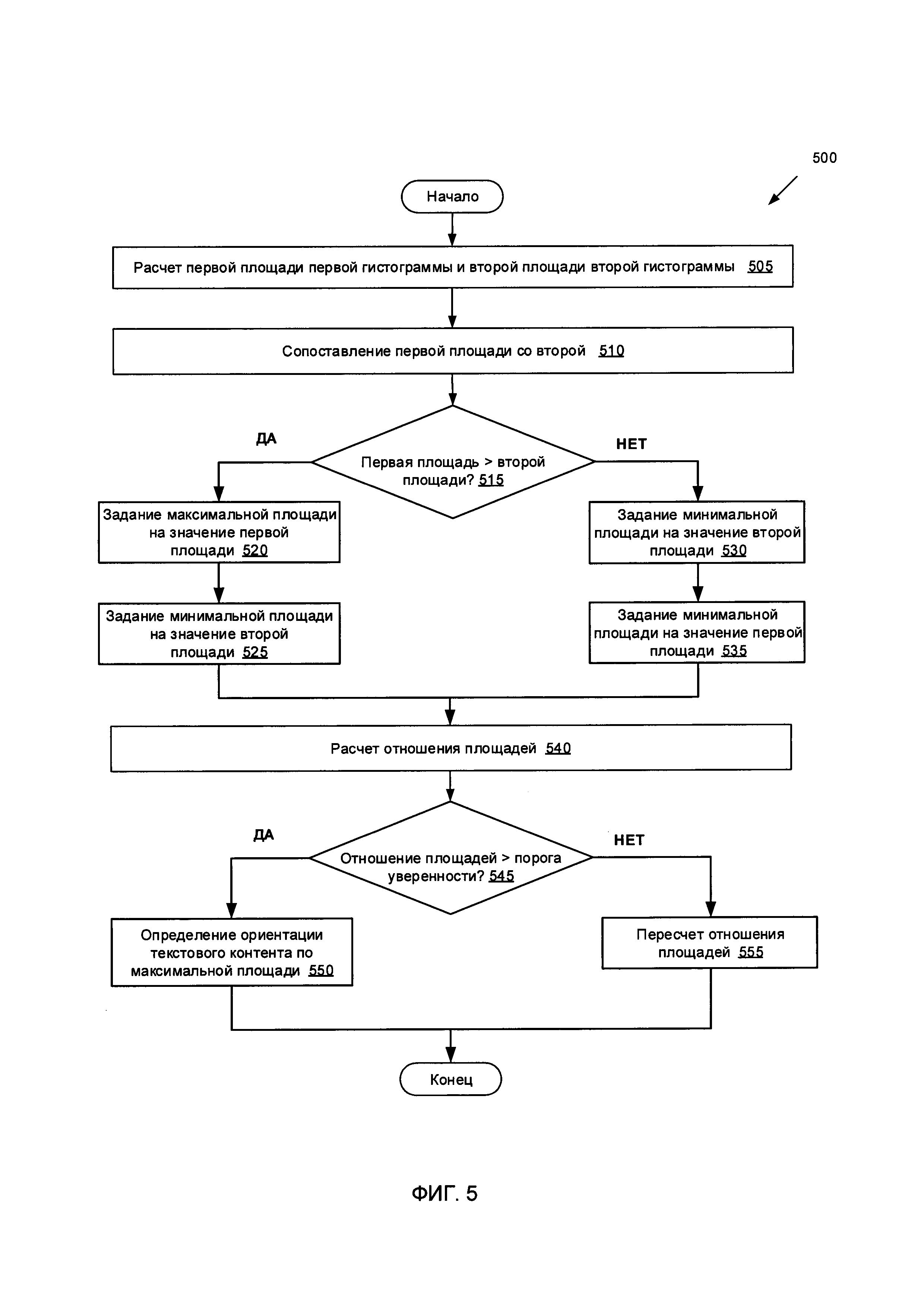 ОБЛАСТЬ ТЕХНИКИ [001] Настоящее изобретение в целом относится к вычислительным системам - в частности, к определению ориентации страницы на изображениях. УРОВЕНЬ ТЕХНИКИ [002] Оптическое распознавание символов (OCR) представляет собой электронное преобразование отсканированных или сфотографированных изображений машинописного или печатного текста в машиночитаемый текст. OCR является общепринятым методом оцифровки печатных текстов, чтобы их можно было редактировать в электронном виде, производить в них поиск, отображать их в режиме онлайн, и используется в таких процессах, как преобразование текста в речь, извлечение данных и интеллектуальный анализ текста. В результате постраничной фотосъемки документа могут возникнуть перспективные или геометрические искажения отснятых страниц документа. Для правильной обработки методом OCR может потребоваться определить ориентацию строк текста на изображении документа, с тем чтобы исправить искаженную перспективу перед проведением OCR-обработки. КРАТКОЕ ОПИСАНИЕ ЧЕРТЕЖЕЙ [003] Для более полного понимания настоящего изобретения ниже приводится подробное описание, в котором для примера, а не способом ограничения, оно иллюстрируется со ссылкой на чертежи, на которых: [004] На Фиг. 1 изображена схема компонентов верхнего уровня для примера архитектуры вычислительного устройства в соответствии с одним или более аспектами настоящего изобретения. [005] На Фиг. 2А показан пример гистограммы горизонтальных серий белых пикселей на изображении документа в соответствии с одним или более аспектами настоящего изобретения. [006] На Фиг. 2В показан пример гистограммы вертикальных серий белых пикселей на изображении документа в соответствии с одним или более аспектами настоящего изобретения. [007] На Фиг. 3А показан пример графика распределения коэффициентов зависимости, указывающего на вертикальную ориентацию текста в соответствии с одним или более аспектами настоящего изобретения. [008] На Фиг. 3В показан пример графика распределения коэффициентов зависимости, указывающего на горизонтальную ориентацию текста в соответствии с одним или более аспектами настоящего изобретения. [009] На Фиг. 4 приведена блок-схема способа определения ориентации строк текстового контента на изображении в соответствии с одним или более аспектами настоящего изобретения. [0010] На Фиг. 5 приведена блок-схема способа определения ориентации строк текстового контента путем сопоставления площадей гистограмм в соответствии с одним или более аспектами настоящего изобретения. [0011] На Фиг. 6 приведена блок-схема способа расчета площадей гистограмм в соответствии с одним или более аспектами настоящего изобретения. [0012] На Фиг. 7 приведена блок-схема способа перерасчета отношения площадей в соответствии с одним или более аспектами настоящего изобретения. [0013] На Фиг. 8 приведена блок-схема способа расчета коэффициентов зависимости в соответствии с одним или более аспектами настоящего изобретения. [0014] На Фиг. 9 приведена блок-схема способа определения горизонтальной ориентации строк текстового контента с использованием коэффициентов зависимости в соответствии с одним или более аспектами настоящего изобретения. [0015] На Фиг. 10 приведена блок-схема способа определения вертикальной ориентации строк текстового контента с использование