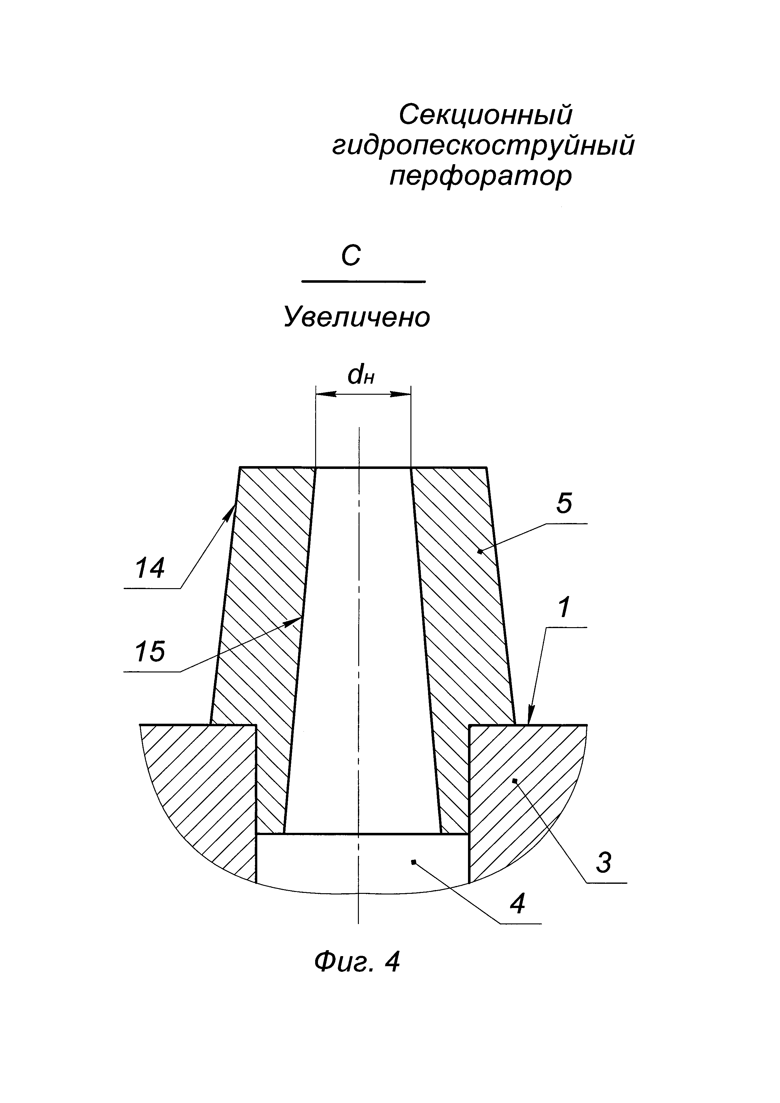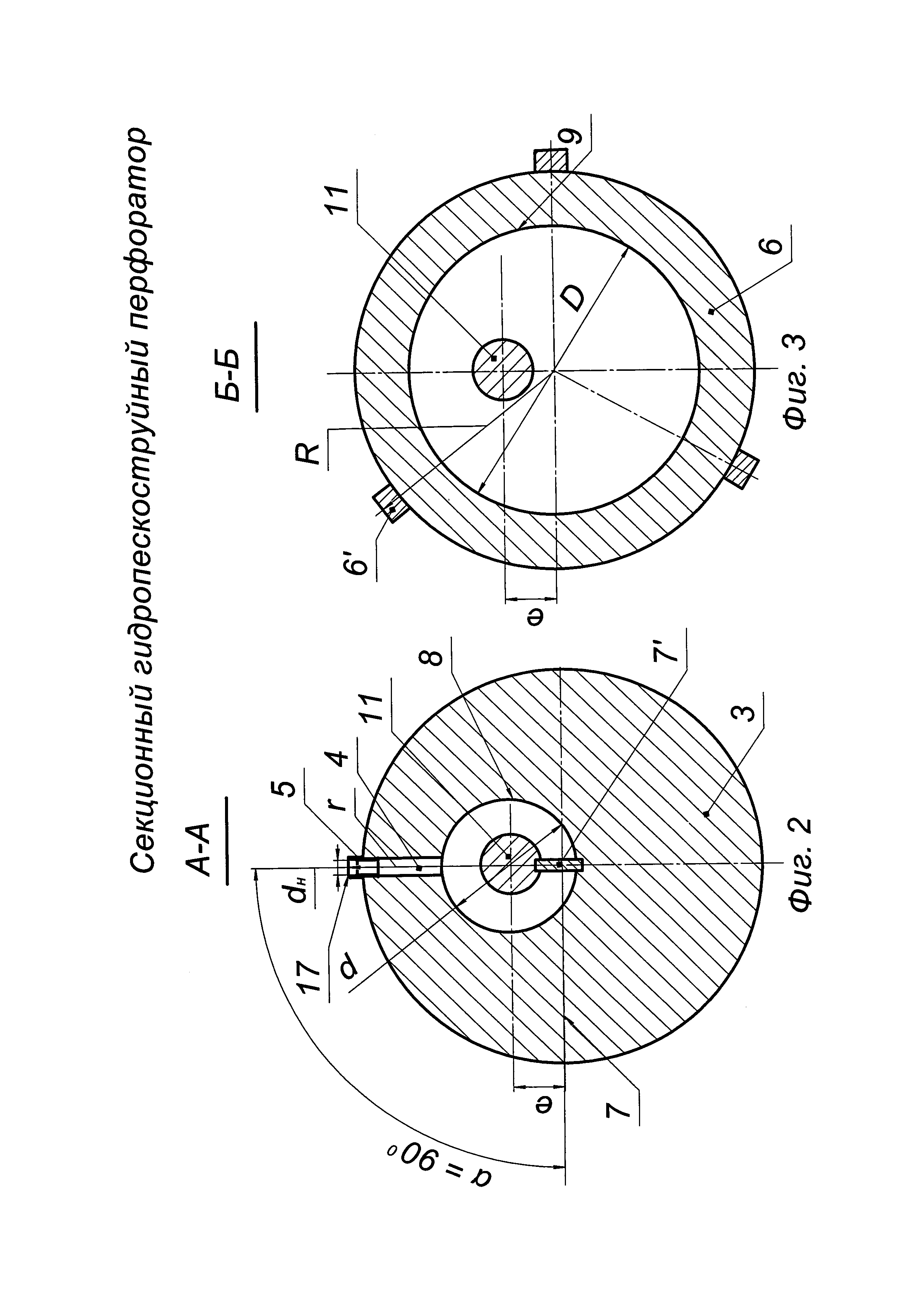 Секционный гидропескоструйный перфоратор содержит полый корпус, состоящий из муфты, отдельных секций с радиальными отверстиями и установленными в них струйными насадками, центраторов, отдельные секции соединены между собой проставками, отличающийся тем, что в секциях радиальные отверстия выполнены под заданным углом относительно оси корпуса, при этом в секциях отверстия выполнены со смещением вверх от оси корпуса, причем диаметр отверстий в секциях меньше, чем диаметр отверстий в муфте и в проставках, снабженных снаружи жесткими центраторами, при этом муфта, секции и проставки разделены между собой подшипниками и стянуты валом с навернутыми на него с двух сторон гайками, причем вал установлен эксцентрично относительно оси корпуса и жестко соединен с отдельными секциями, а гайки контактируют с муфтой и последней заглушенной подшипниками секцией, при этом муфта, отдельные секции и проставки герметично разделены между собой уплотнительными элементами, а отдельные секции имеют возможность совместного вращения с валом относительно неподвижных муфты и проставок, причем струйные насадки запрессованы в отдельные секции, выполнены из твердосплавного материала под конус, оснащены наружной и внутренней коническими поверхностями, сужающимися наружу от отдельной секции полого корпуса, при этом радиальный вылет запрессованной в отдельную секцию струйной насадки меньше радиального вылета центраторов муфты и проставки, а диаметр струйной насадки соответствует шести диаметрам зерен фракции проппанта.