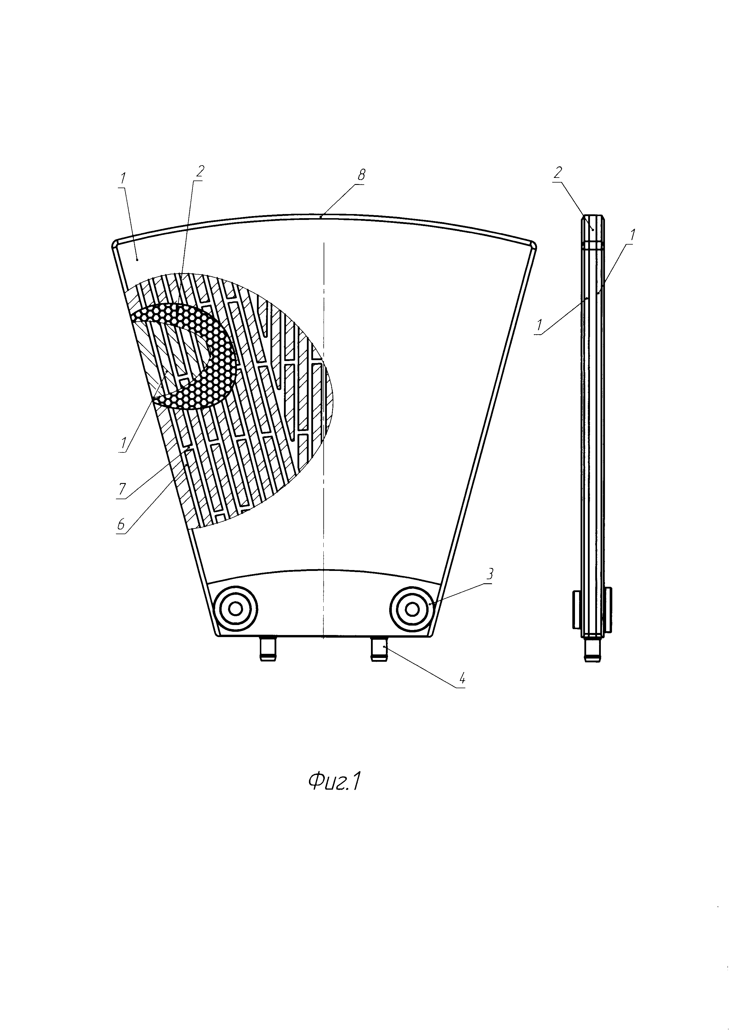 Изобретение относится к области вакуумных дисковых фильтров, предназначенных для разделения жидкости и взвешенных в ней частиц, и может быть использовано в процессах по обогащению руды. Дисковый фильтр, принцип действия которого широко известен, содержит ряд установленных на вращающемся валу фильтровальных дисков, каждый из которых образован несколькими секторными элементами, при этом каждый секторный элемент выполнен в предпочтительном случае из пористой проницаемой керамики с образованием внутренней полости. При прохождении секторного элемента через ванну с пульпой внутри него создается вакуум, который в совокупности с капиллярным эффектом, характерным для пористой керамики, побуждает жидкость просачиваться в полость секторного элемента, откуда она попадает в полость вала и удаляется. Во время подъема секторного элемента из ванны на его боковых поверхностях остается слой налипших частиц, представляющий собой обезвоженный концентрат - кек, который счищается при помощи специальных скребков, после чего в полость секторного элемента подают избыточное давление воздуха или воды с целью прочистки пор. В патентной публикации RU 2405615 (C1), B01D 33/23, 10.12.2010 раскрыт секторный элемент дискового фильтра, образованный двумя керамическими пластинами, которые имеют внутренние полости для создания вакуума и отсоса воды в направлении полого вала. Недостатком известного решения, выбранного в качестве прототипа изобретения, является то, что при прочих равных условиях, таких, например, как вид используемой керамики или проходное сечение внутренних полостей, механическая прочность секторного элемента может быть обеспечена только за счет увеличения толщины пластин. Следовательно, в случае необходимости использования фильтровального диска большого диаметра, требующего выполнения секторных элементов с большим радиальным размером, а значит, обладающих и большей прочностью, толщина пластин должна быть существенно увеличена. Данное обстоятельство приводит к значительному возрастанию массы даже сухого изделия, которая еще больше увеличивается при пропитывании керамики водой, что, во-первых, вызывает повышенное напряжение в области крепления секторного элемента к валу, которое отрицательно сказывается на прочности секторного элемента в целом, во-вторых, создает существенные нагрузки на вал, снижающие ресурс всего дискового фильтра, а в- третьих, приводит к росту энергетических затрат фильтровального процесса. Следует отметить, что еще одним следствием увеличения толщины пластин является значительное возрастание гидравлического сопротивления в порах керамики, вызывающее уменьшение перепада давления на границе раздела сред, что, в свою очередь, снижает эффективность как фильтрации, так и прочистки пор. Задачей изобретения является повышение прочности секторного элемента без увеличения толщины керамических пластин и вызванных этим отрицательных эффектов. Для решения поставленной задачи предложен секторный элемент дискового фильтра, предназначенного для отделения жидкости от взвешенных в ней частиц путем ее всасывания через проницаемый материал. Секторный элемент содержит две боковые пластины, каждая из которых выполнена из пористой керамики, и центральную пластину, выполненную из полимерного материала. Боковые пл