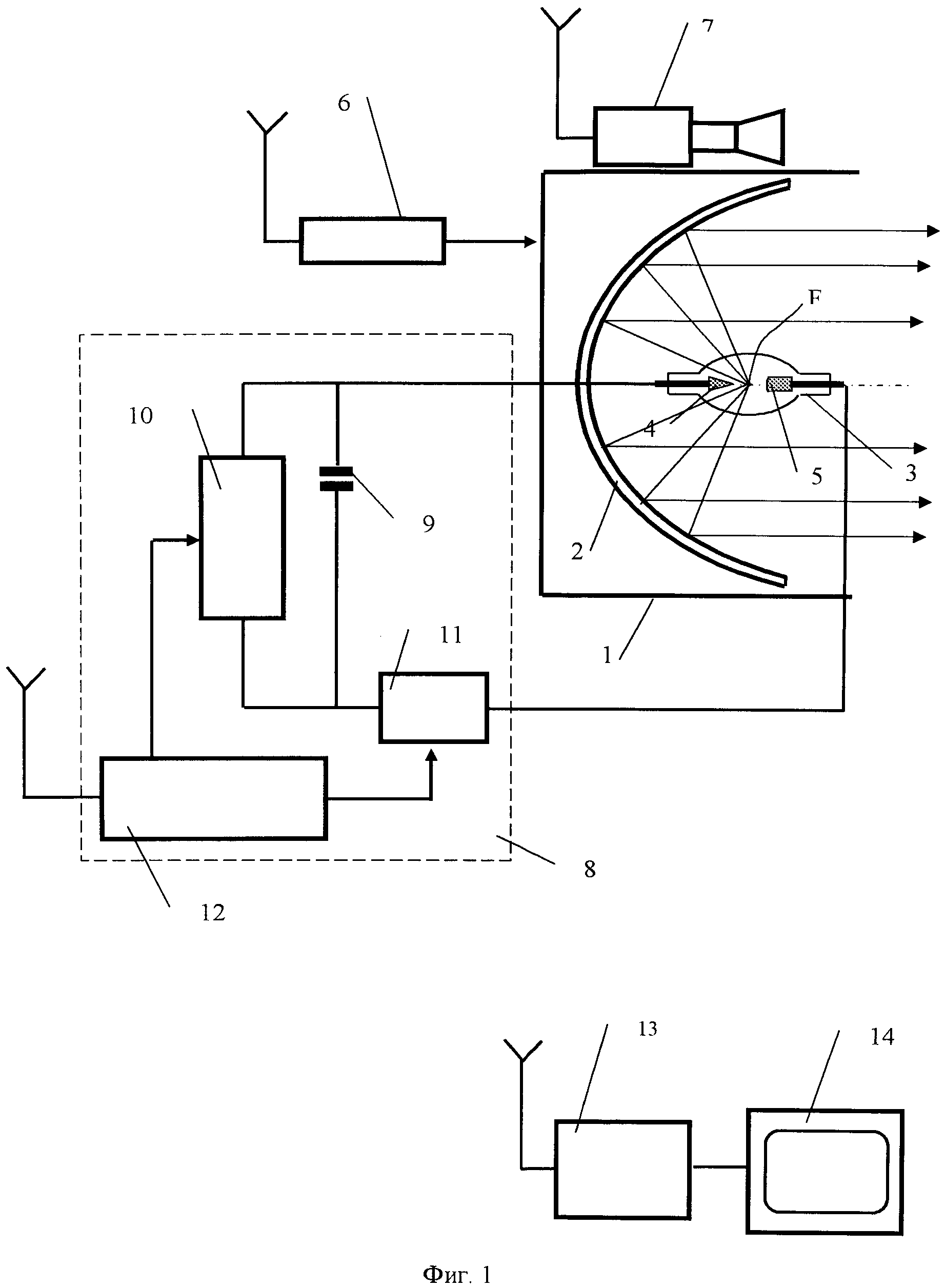 Область техники Изобретение относится к методам репеллентного отпугивания птиц в районе взлетно-посадочной полосы аэродромов и ее окрестностей. Предложение может быть использовано в зонах повышенной опасности для летательных аппаратов (аэродромы, авианосные суда, зоны пусковых установок), а также при защите зданий и сооружений, представляющих архитектурную и градостроительную ценность. Уровень техники Птицы, пролетающие в воздухе или гнездящиеся непосредственно в районе взлетно-посадочной полосы аэродромов, представляют собой потенциальную угрозу для безопасности воздушных судов и летательных аппаратов. Поэтому задача обеспечения орнитологической безопасности указанных зон путем репеллентного воздействия на птиц с целью их удаления из опасных зон является весьма актуальной. Известен репеллентный биоакустический способ, предусматривающий трансляцию криков «бедствия» птиц, пойманных хищником. Эти крики могут подкрепляться записями ружейных выстрелов и отдельными холостыми выстрелами из охотничьего ружья. Реализация такого способа отпугивания птиц может быть осуществлена, например, с помощью набора пиротехнических патронов, которые поддерживают биоакустическую трансляцию или применяются отдельно (Рыжов С.Е. Эффективное воздействие на птиц. Аэропорт Партнер (журнал), 2003, №1). Для патронов такого типа характерны звук выстрела и полет горящих пироэлементов. Помимо этого в патроне мог формироваться импульсный звук с давлением порядка 90 дБ на расстоянии до 50 метров от точки разрыва. Кроме этого формировался дымный след оранжевого цвета. Разлет пироэлементов в разные стороны сопровождался появлением красного пламени. Таким образом, в разработанной системе использовались различные методы воздействия на рецепторные системы птицы. Недостаток этого способа заключается в том, что в силу ненаправленного распространения звуков одновременно осуществляется нежелательное воздействие на окружающую среду (люди, домашние животные и т.д.). Известен также способ воздействия на птиц для из отпугивания микроволнового излучения, реализованный при работе устройства по патенту US 6250255. Микроволновое излучение в полосе частот 0,9…4,0 ГГц оказывает эффективное воздействие на слуховой аппарат птиц, имеет свойство проникновения в ткани мозга птиц и их разогревания. В этом случае отпугивающий эффект является следствием термоупругих волн, возникающих в мозговых тканях птиц, которые оказывают сильное воздействие на механорецепторы волосковых ячеек, что в свою очередь вызывает устойчивое головокружение, потерю ориентации птиц. Недостаток известного способа заключается в том, что его эффективность существенно зависит от размеров птиц, что на практике приводит к необходимости частой перестройки частоты микроволнового излучения. Известен также способ обеспечения орнитологической безопасности аэропорта, включающий воздействие на птиц и их гнездовья электромагнитным излучением в оптическом диапазоне частот на нескольких длинах волн, и устройство для его осуществления, содержащее излучатель с источником излучения, генерирующий оптическое излучение с набором длин волн, и блок питания, подключенный к излучателю (патент RU 2426310). Это техническое решение принято за прототип. В известном устройстве в качестве источника электр