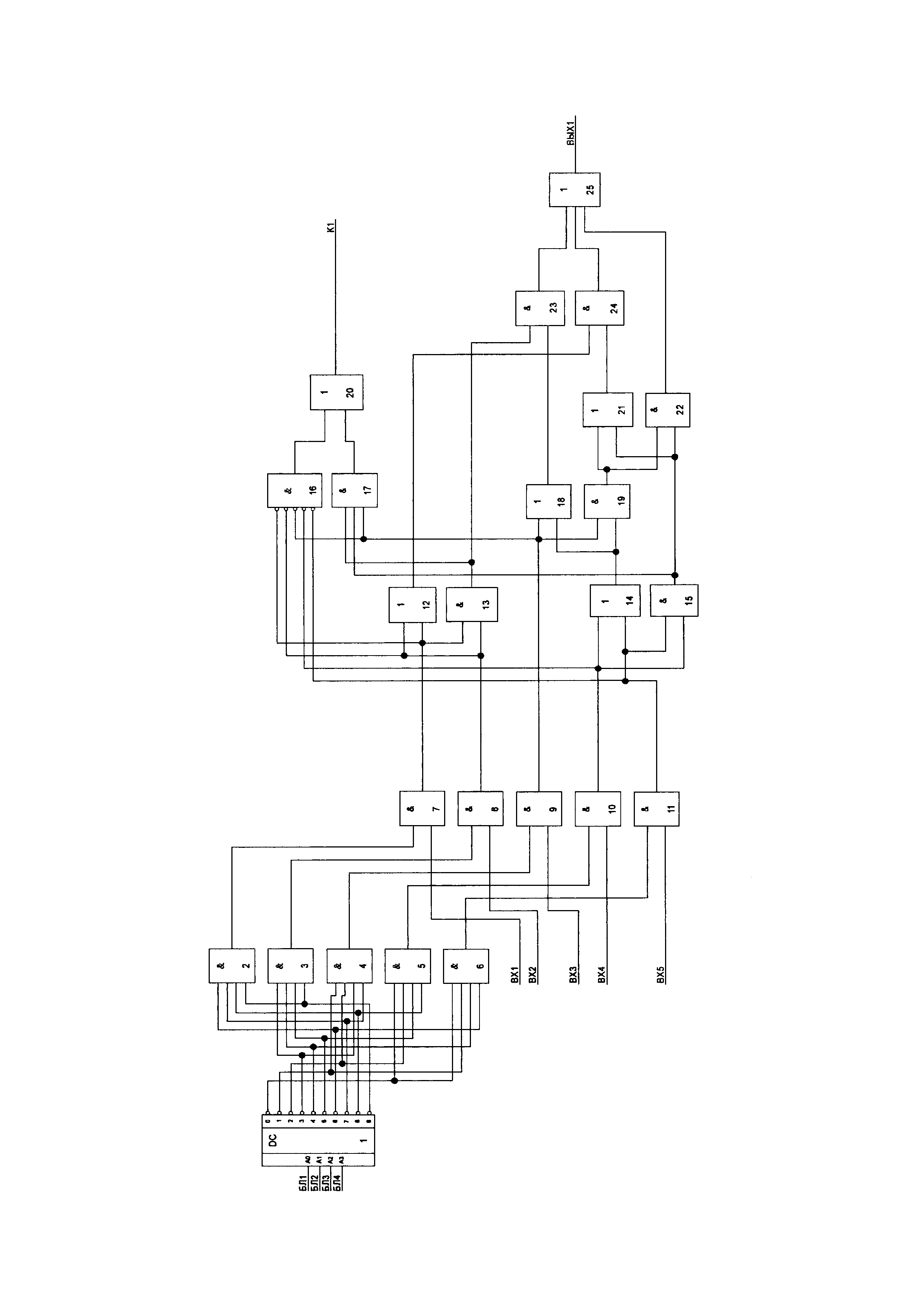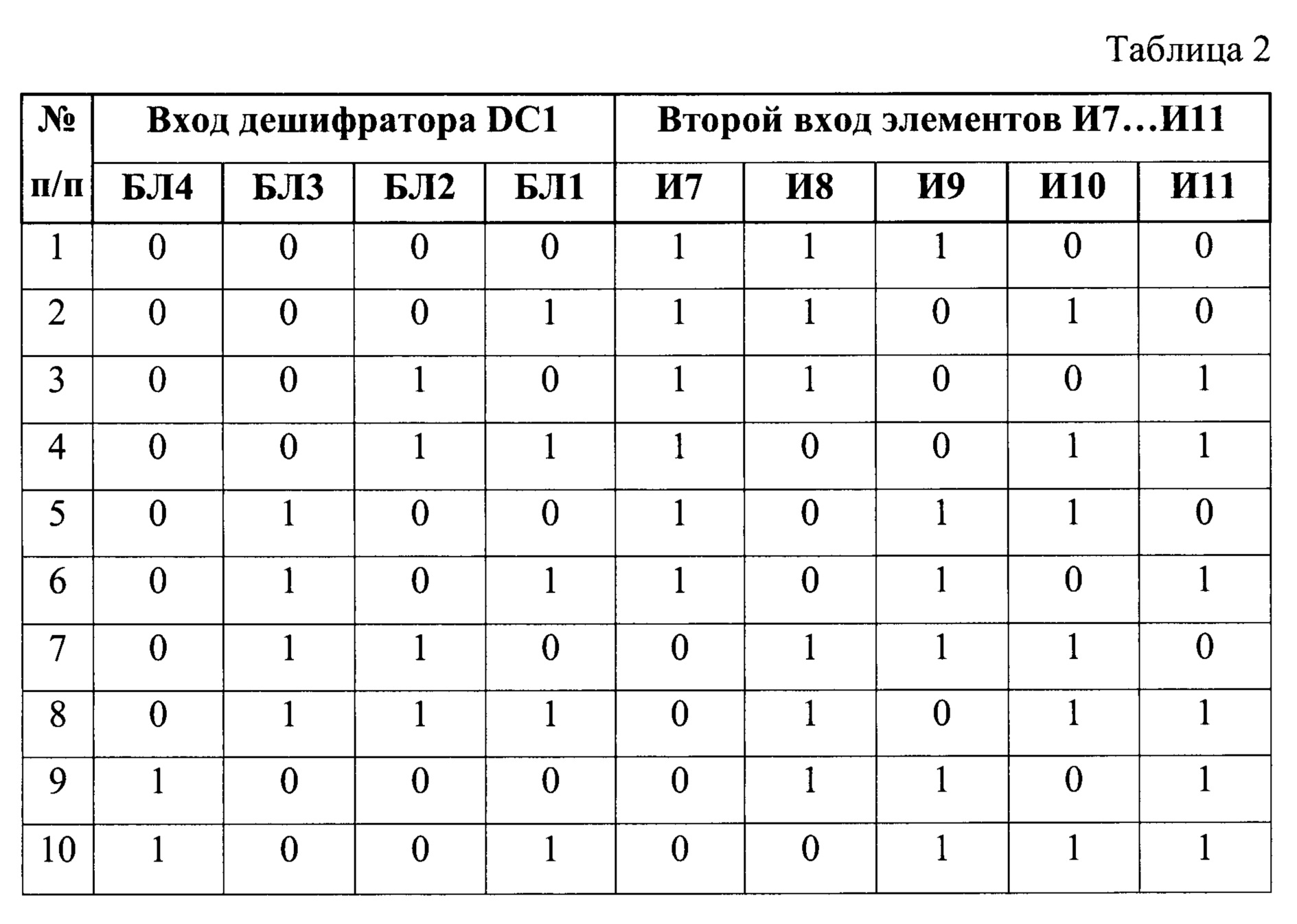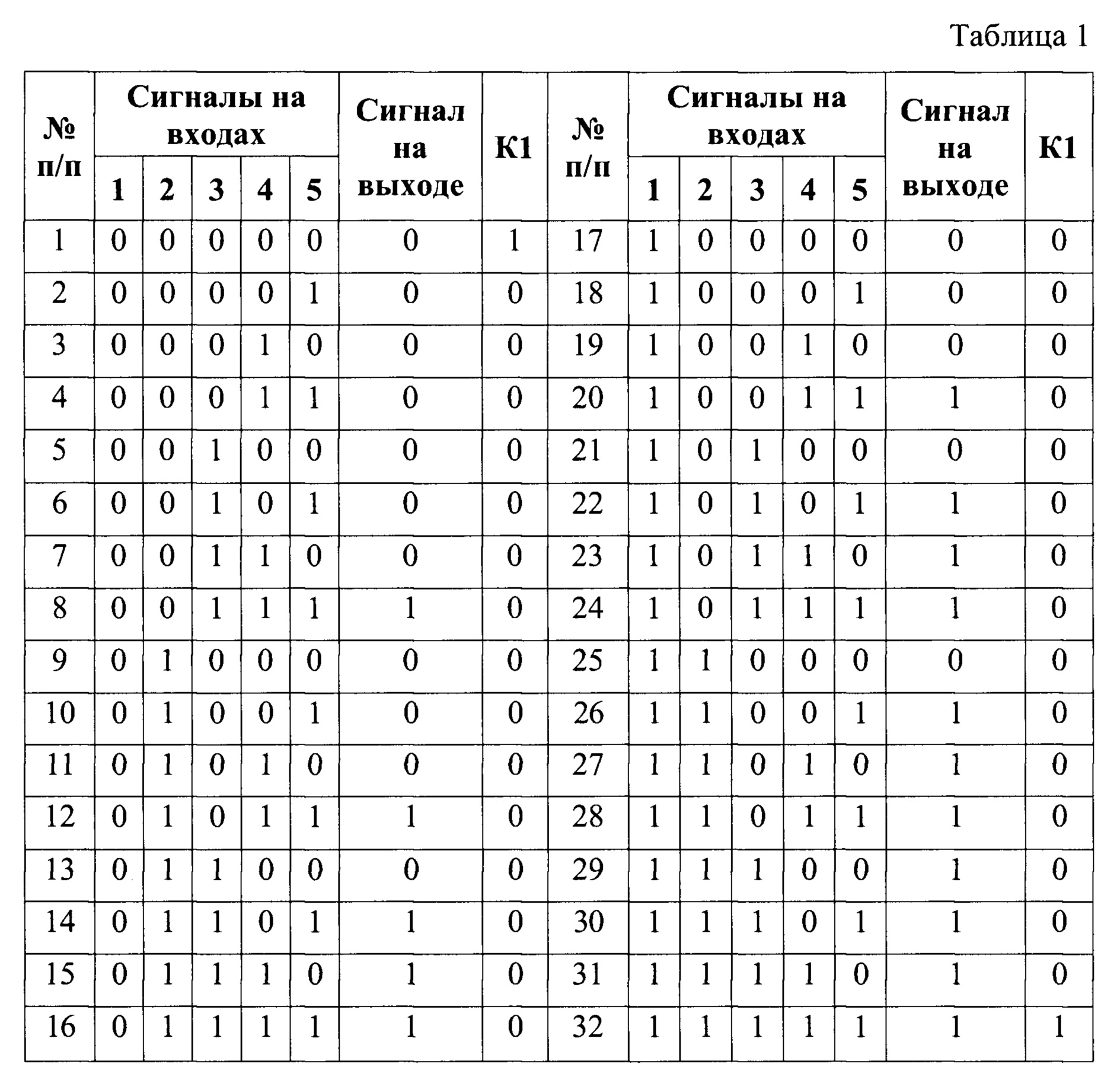 Изобретение относится к автоматике и вычислительной технике и может быть использовано при разработке высоконадежных устройств и систем, применяющих мажоритарное резервирование, например, для достоверной передачи данных в исполнительные устройства автоматики по нескольким каналам связи. Известен мажоритарный элемент «три из пяти», содержащий десять трехвходовых элементов И и элемент ИЛИ, причем входы устройства подключены к входам элементов И, выходы которых соединены с входами элемента ИЛИ, выход которого является выходом устройства (Доманицкий С.М. Построение надежных логических устройств. - М.: Энергия, 1971, с. 74, рис. 3-3а). Недостатками этого мажоритарного элемента является сложность устройства, выражающаяся в большом числе связей, а также недостаточные функциональные возможности, так как он не позволяет определить в случае неисправности все ли сигналы на входе мажоритарного элемента являются исправными и отсутствует схема определения неисправного канала. В качестве наиболее близкого аналога может быть принят пятивходовый мажоритарный элемент «три из пяти» (полезная модель №81018 от 06.10.2008 г.), содержащий двенадцать элементов И, шесть элементов ИЛИ. При поступлении на вход 1,2,…,5 логических сигналов с помощью элементов ИЛИ и элементов И выполняется операция мажорирования. С помощью элементов И, инверторов НЕ, элементов И фиксируется неисправность резервируемых объектов, выходные сигналы которых обрабатываются данным мажоритарным элементом [1]. При поступлении на три, четыре и на пять входов мажоритарного элемента сигналов «1» на его рабочем выходе появляется сигнал «1», то есть он выполняет функцию мажорирования «три из пяти». На контрольном выходе мажоритарного элемента сигнал «1» появится только в том случае, если выходные сигналы всех пяти входов совпадают, что свидетельствует об исправности всех входных сигналов. Недостаток данного устройства заключается в том, что возникновение отказа в канале приводит к возникновению сигнала контроля, информирующего о наличии неисправности входного/входных сигналов, но схема контроля не позволяет вычислить какой из каналов является неисправным. Основной задачей предлагаемого изобретения является повышение функционала схемы контроля, а именно определение неисправного канала с помощью дополнительных управляющих воздействий и организация возможности введения «имитации» неисправности для отладки реакции схемы при разработке. Сущность изобретения заключается в том, что в пятивходовый мажоритарный элемент (МЭ), состоящий из двухвходовых элементов И и ИЛИ, причем выход первого двухвходового элемента И соединен с входом пятого двухвходового элемента И, выход первого двухвходового элемента ИЛИ соединен с входом шестого двухвходового элемента И, выход второго двухвходового элемента ИЛИ соединен с входом пятого двухвходового элемента И, выходы второго двухвходового элемента И соединены с четвертыми двухвходовыми элементами ИЛИ и И, выход третьего двухвходового элемента ИЛИ соединен с входами вторых двухвходовых элементов ИЛИ и И, выход третьего двухвходового элемента И соединен с входами четвертых двухвходовых элементов ИЛИ и И, выход четвертого двухвходового элемента ИЛИ соединен с входом шестого двухвходового элемента И, выходы четвертого, пятого и шестого 