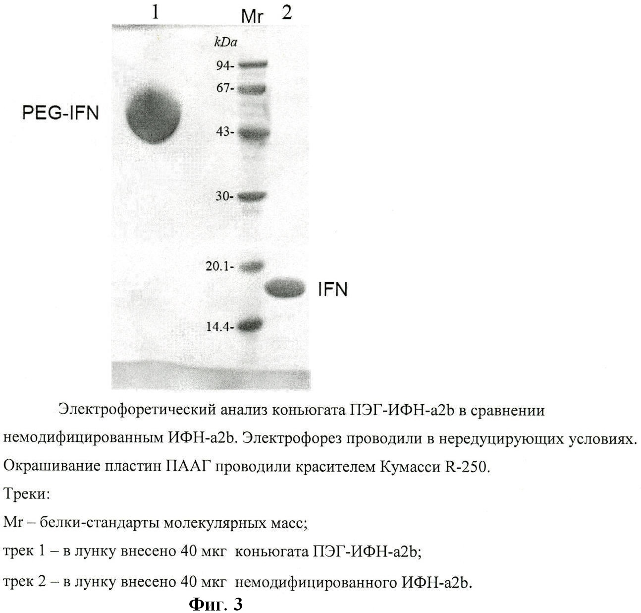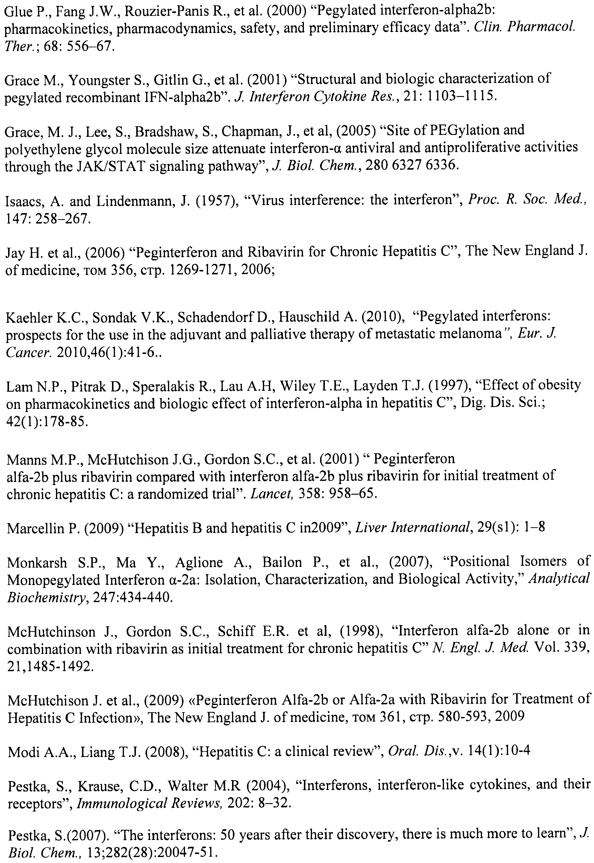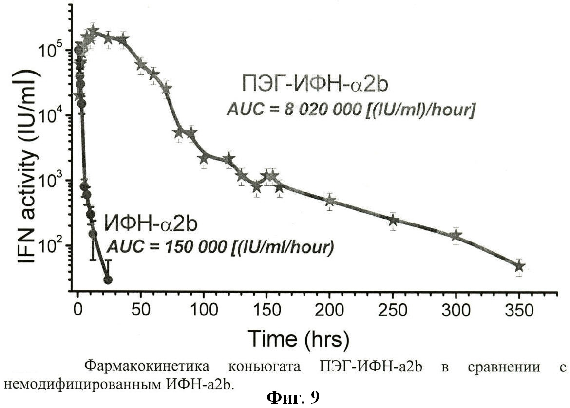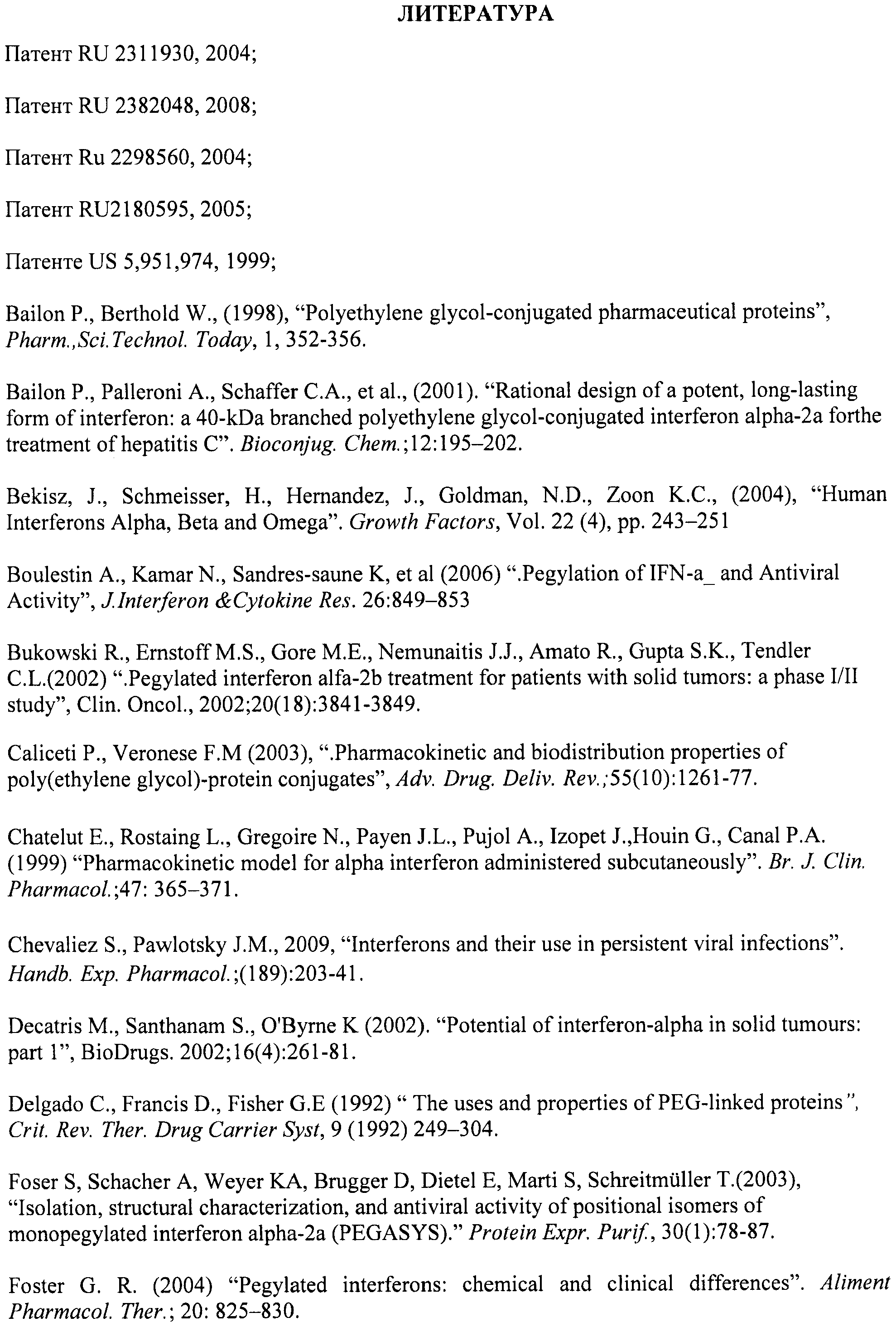 Настоящее изобретение относится к фармацевтике и медицине, а именно к новым физиологически активным конъюгатам интерферона, в частности к новым коньюгатам интерферона с полиэтиленгликолем, которые могут быть использованы в медицине, например, для лечения вирусных, иммунных и онкологических заболеваний. Интерфероны (ИФН) - это группа биологически активных белков или гликопротеидов, продуцируемых различными клетками в ответ на вирусную инфекцию или при воздействии на клетки некоторых химических и биологических веществ (Isaacs&Lindeman, 1957; Pestka et al., 2007). Связывание ИФН с клеточными рецепторами приводит к индукции синтеза целого ряда внутриклеточных белков, которые опосредуют противовирусное, иммуномодулирующее и антипролиферативное действие ИФН (Pestka et al., 2004; Bekisz, 2004). Гены различных ИФН человека были клонированы и экспрессированы в бактериальных и животных клетках, в результате были получены и очищены многие рекомбинантные ИФН (Pestka et al., 2004; Pestka, 2007). Лекарственные препараты, содержащие рекомбинантные ИФН, применяются в клинической практике для лечения целого ряда вирусных, онкологических и иммунных заболеваний (Pestka et al., 2004; Chevaliez&Pawlotsky, 2009). В настоящее время препараты на основе ИФН применяются в клинической практике для лечения целого ряда вирусных, онкологических и иммунных заболеваний (Pestka et al., 2004). Наиболее широкое использование препараты ИФН получили для лечения вирусных гепатитов (Chevaliez&Pawlotsky, 2009), представляющих одну из наиболее серьезных социальных проблем. В настоящее время в мире насчитывается около 350 млн хронически больных гепатитом В и 170 млн больных гепатитом С (Marcellin, 2009). Заболевание гепатитом С в большинстве случаев приобретает хроническое течение с формированием тяжелых исходов - цирроза печени и гепатоцеллюлярной карциномы (Modi&Liang, 2008). По данным ВОЗ, с 1961 года в США и странах Западной Европы хронические гепатиты и циррозы печени, как причина смерти, переместились с 10 на 5 место (Marcellin, 2009). Известно также применение препаратов, содержащих ИФН-α, для лечения ряда лейкозов и солидных опухолей, в том числе рецедивирующей меланомы (Bukowski et al., 2002; Decantris et al., 2002; Qintas-Cardama et al., 2006). Эффективность действия препаратов нативных ИФН ограничена быстрым всасыванием из подкожных тканей, большим объемом распределения, относительно низкой стабильностью, коротким периодом полувыведения, высокой иммуногенностью и токсичностью (Wills, 1990). В результате, в течение нескольких часов после введения наблюдается быстрое падение концентрации ИФН в плазме крови, при этом интерферон не определяется в плазме уже через 24 ч после инъекции (Chatelut et al., 1999). Снижение концентрации интерферона создает условия для возобновления репликации вируса и увеличения концентрации вирусных частиц (Lam et al., 1997). Поэтому возникает необходимость частых введений препарата для достижения эффективных терапевтических концентраций в плазме крови, что приводит к возникновению дозозависимых побочных эффектов. Вследствие указанных особенностей монотерапия хронического гепатита С (ХГС) ИФН-α2b в течение 12 мес приводила к устойчивому вирусологическому ответу всего у 15-20% пациентов, у больных с генотипом Iв и высокой вирусологической нагрузкой эффективность препарата не наблюдалась вовсе (Mc Hutchinson et al., 1998). Терапевтическая эффективность ИФН может быть повышена при использован