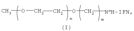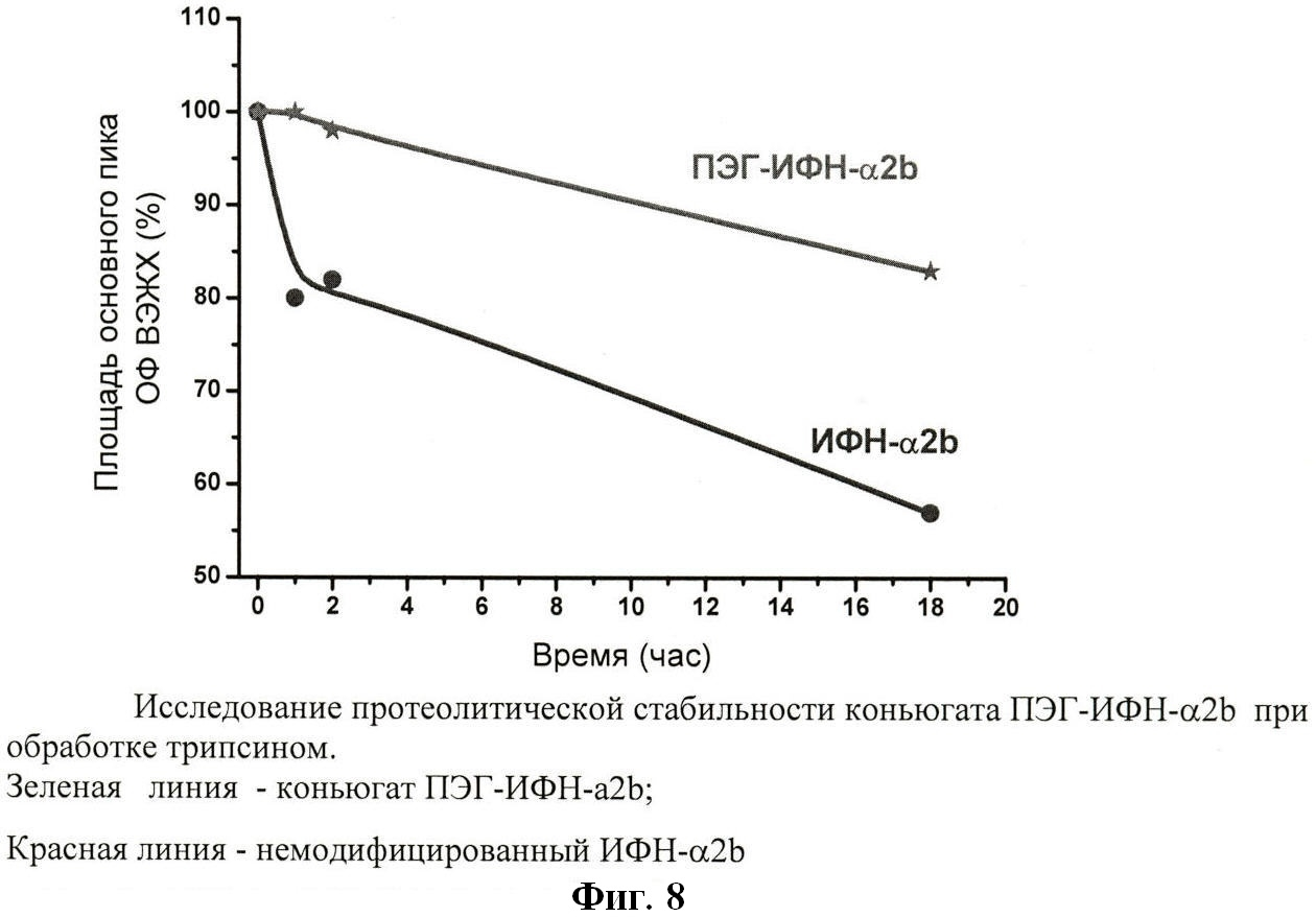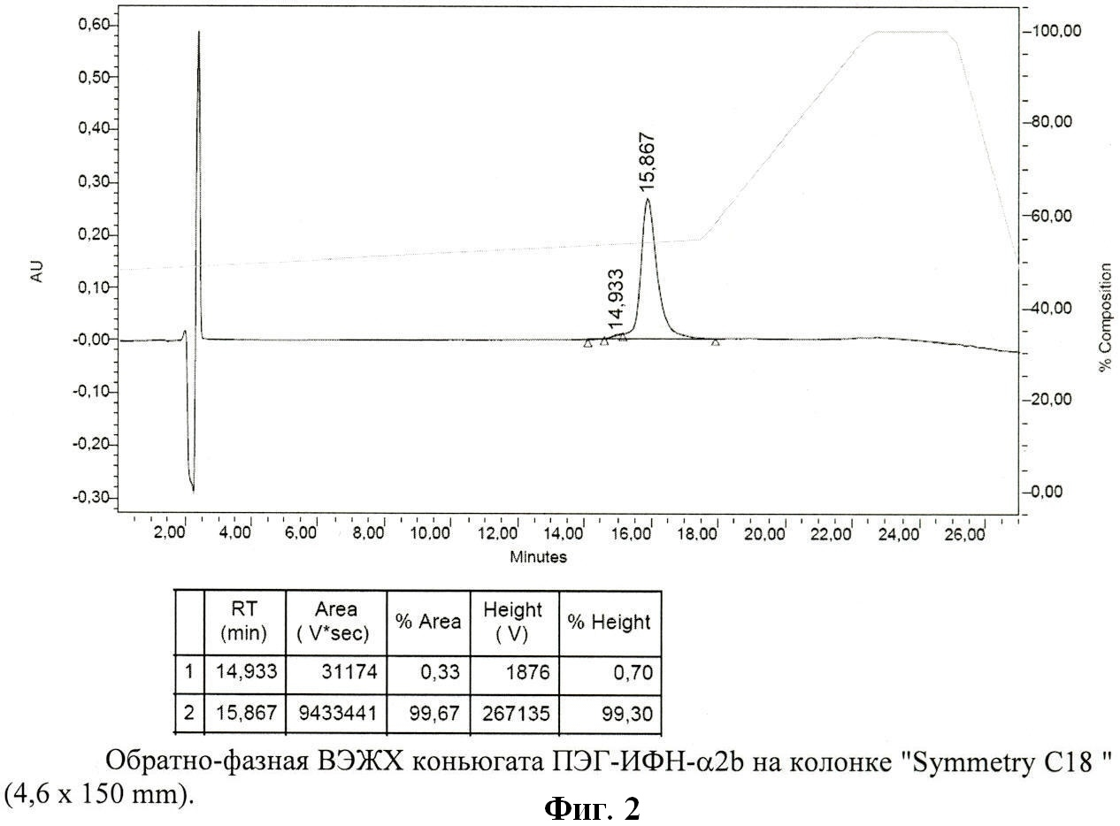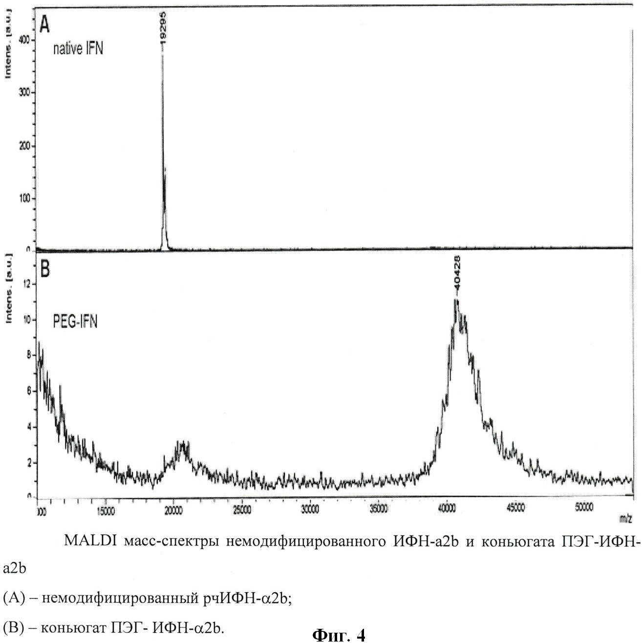 Настоящее изобретение относится к фармацевтике и медицине, а именно к новым физиологически активным конъюгатам интерферона, в частности к новым коньюгатам интерферона с полиэтиленгликолем, которые могут быть использованы в медицине, например, для лечения вирусных, иммунных и онкологических заболеваний. Интерфероны (ИФН) - это группа биологически активных белков или гликопротеидов, продуцируемых различными клетками в ответ на вирусную инфекцию или при воздействии на клетки некоторых химических и биологических веществ (Isaacs&Lindeman, 1957; Pestka et al., 2007). Связывание ИФН с клеточными рецепторами приводит к индукции синтеза целого ряда внутриклеточных белков, которые опосредуют противовирусное, иммуномодулирующее и антипролиферативное действие ИФН (Pestka et al., 2004; Bekisz, 2004). Гены различных ИФН человека были клонированы и экспрессированы в бактериальных и животных клетках, в результате были получены и очищены многие рекомбинантные ИФН (Pestka et al., 2004; Pestka, 2007). Лекарственные препараты, содержащие рекомбинантные ИФН, применяются в клинической практике для лечения целого ряда вирусных, онкологических и иммунных заболеваний (Pestka et al., 2004; Chevaliez&Pawlotsky, 2009). В настоящее время препараты на основе ИФН применяются в клинической практике для лечения целого ряда вирусных, онкологических и иммунных заболеваний (Pestka et al., 2004). Наиболее широкое использование препараты ИФН получили для лечения вирусных гепатитов (Chevaliez&Pawlotsky, 2009), представляющих одну из наиболее серьезных социальных проблем. В настоящее время в мире насчитывается около 350 млн хронически больных гепатитом В и 170 млн больных гепатитом С (Marcellin, 2009). Заболевание гепатитом С в большинстве случаев приобретает хроническое течение с формированием тяжелых исходов - цирроза печени и гепатоцеллюлярной карциномы (Modi&Liang, 2008). По данным ВОЗ, с 1961 года в США и странах Западной Европы хронические гепатиты и циррозы печени, как причина смерти, переместились с 10 на 5 место (Marcellin, 2009). Известно также применение препаратов, содержащих ИФН-α, для лечения ряда лейкозов и солидных опухолей, в том числе рецедивирующей меланомы (Bukowski et al., 2002; Decantris et al., 2002; Qintas-Cardama et al., 2006). Эффективность действия препаратов нативных ИФН ограничена быстрым всасыванием из подкожных тканей, большим объемом распределения, относительно низкой стабильностью, коротким периодом полувыведения, высокой иммуногенностью и токсичностью (Wills, 1990). В результате, в течение нескольких часов после введения наблюдается быстрое падение концентрации ИФН в плазме крови, при этом интерферон не определяется в плазме уже через 24 ч после инъекции (Chatelut et al., 1999). Снижение концентрации интерферона создает условия для возобновления репликации вируса и увеличения концентрации вирусных частиц (Lam et al., 1997). Поэтому возникает необходимость частых введений препарата для достижения эффективных терапевтических концентраций в плазме крови, что приводит к возникновению дозозависимых побочных эффектов. Вследствие указанных особенностей монотерапия хронического гепатита С (ХГС) ИФН-α2b в течение 12 мес приводила к устойчивому вирусологическому ответу всего у 15-20% пациентов, у больных с генотипом Iв и высокой вирусологической нагрузкой эффективность препарата не наблюдалась вовсе (Mc Hutchinson et al., 1998). Терапевтическая эффективность ИФН может быть повышена при использован