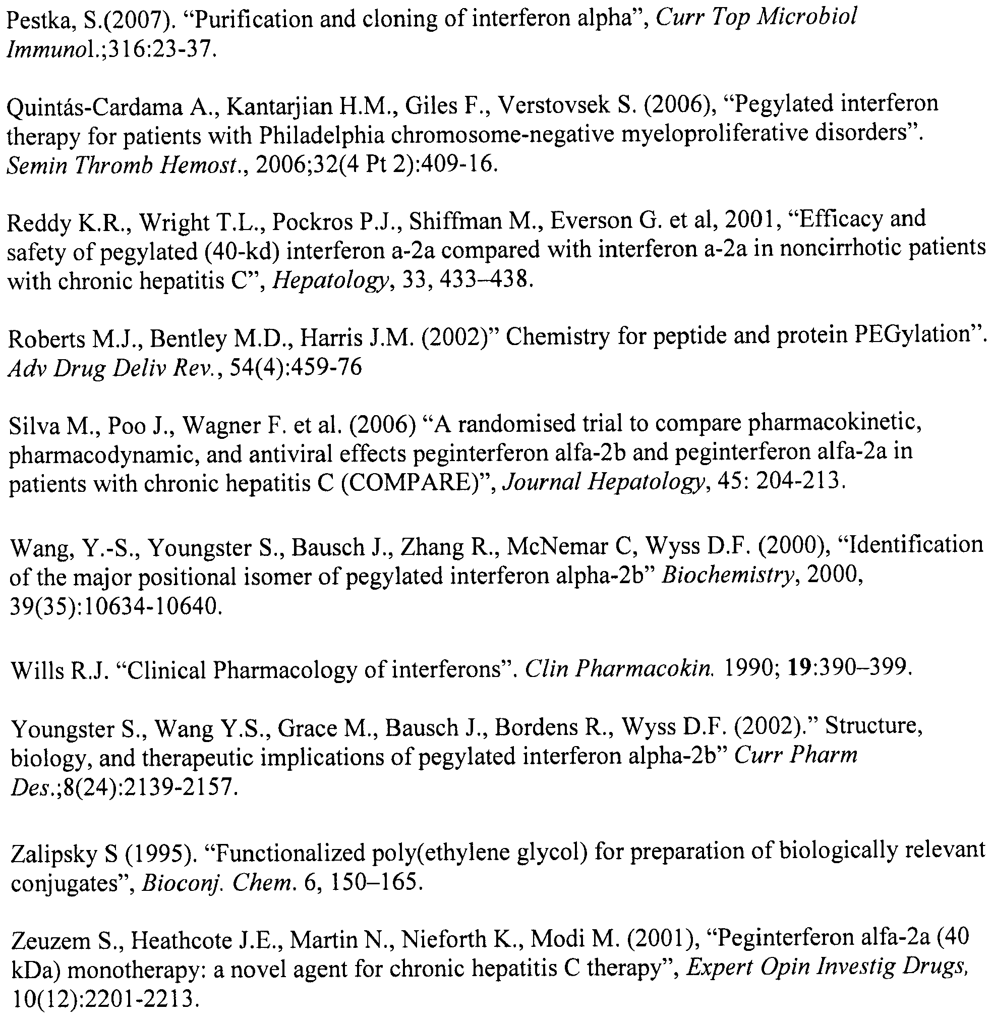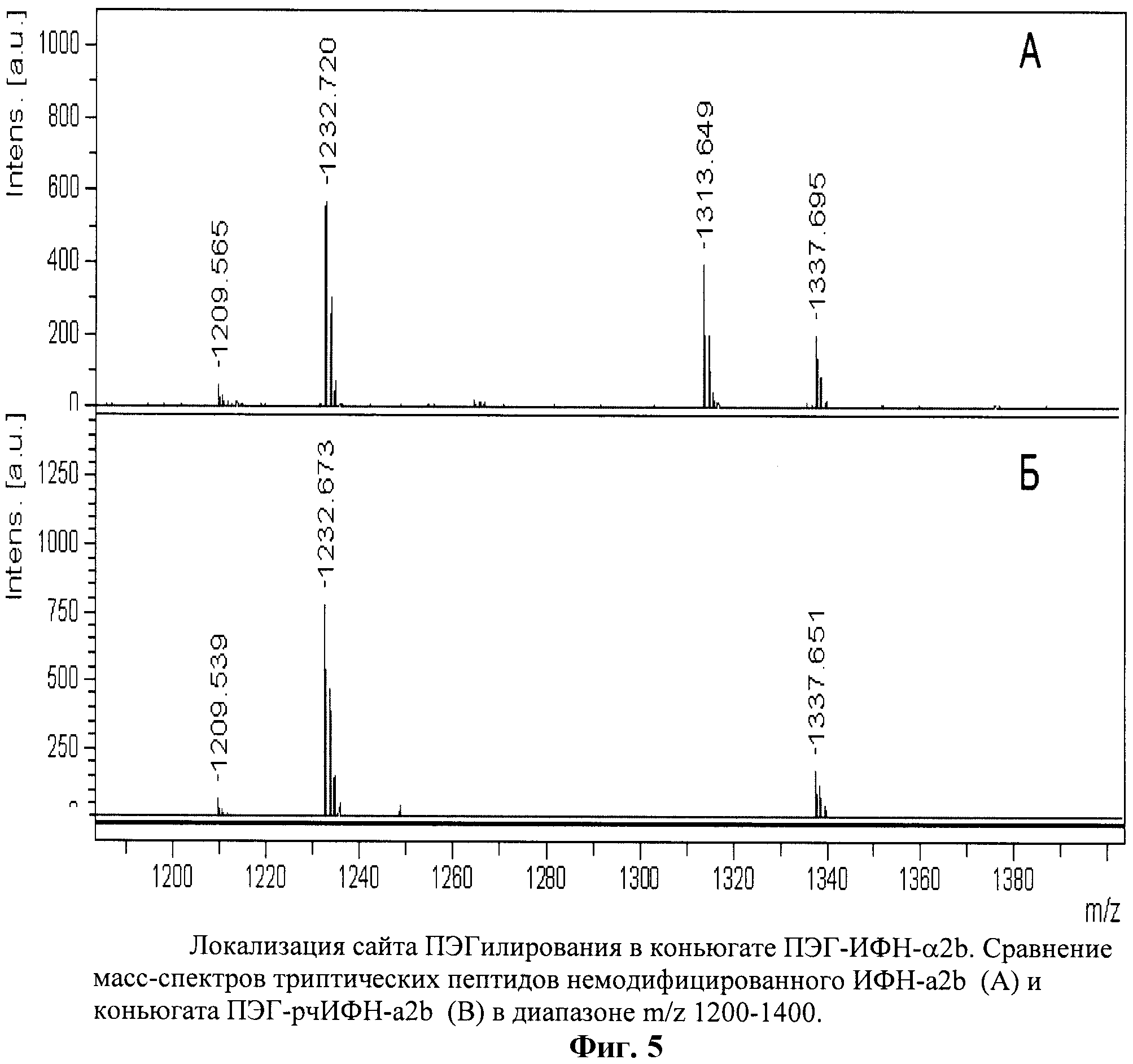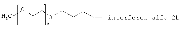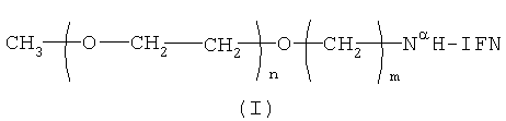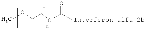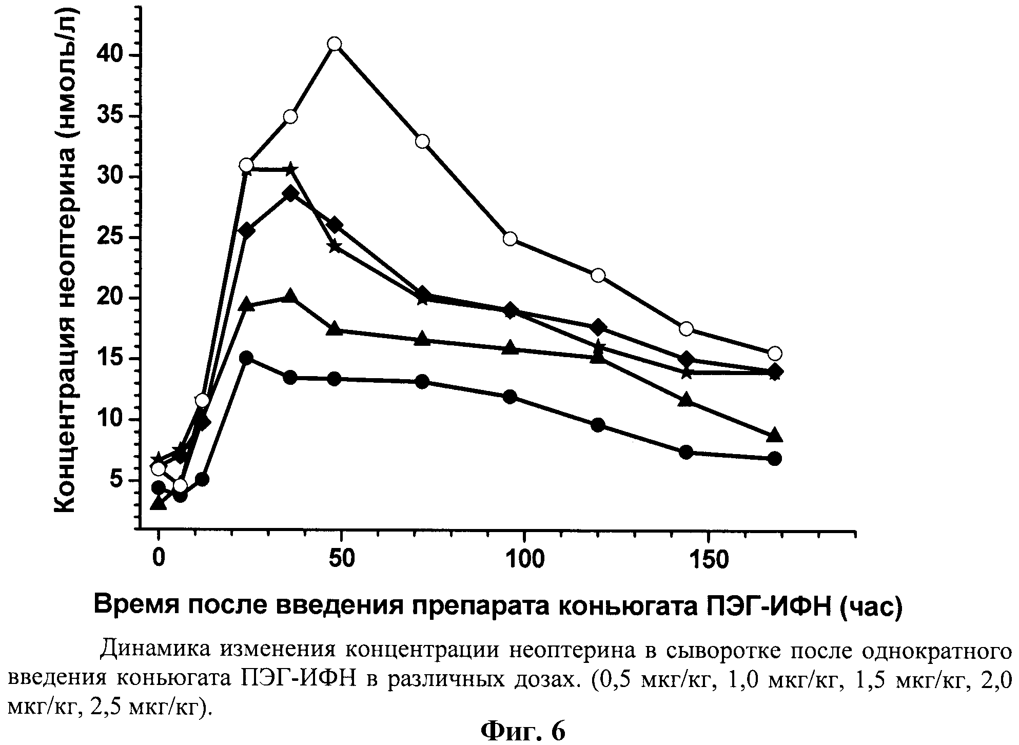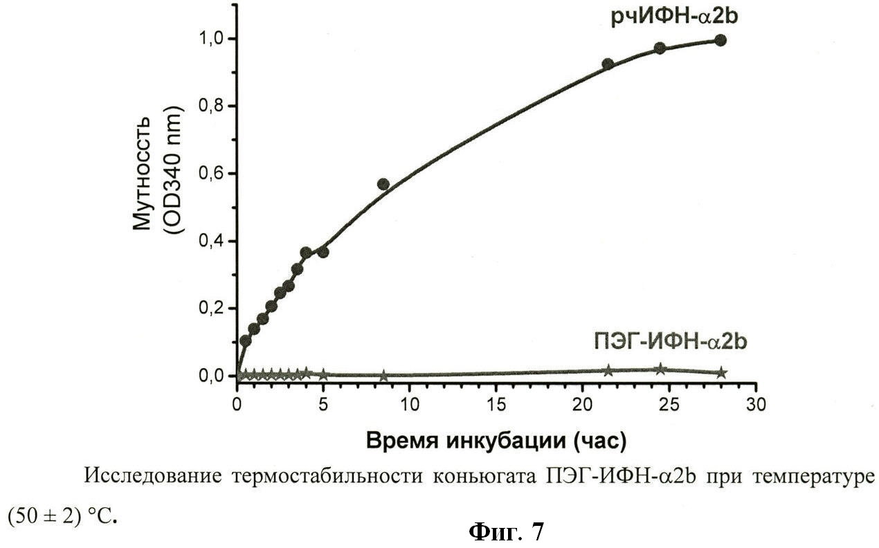 Настоящее изобретение относится к фармацевтике и медицине, а именно к новым физиологически активным конъюгатам интерферона, в частности к новым коньюгатам интерферона с полиэтиленгликолем, которые могут быть использованы в медицине, например, для лечения вирусных, иммунных и онкологических заболеваний. Интерфероны (ИФН) - это группа биологически активных белков или гликопротеидов, продуцируемых различными клетками в ответ на вирусную инфекцию или при воздействии на клетки некоторых химических и биологических веществ (Isaacs&Lindeman, 1957; Pestka et al., 2007). Связывание ИФН с клеточными рецепторами приводит к индукции синтеза целого ряда внутриклеточных белков, которые опосредуют противовирусное, иммуномодулирующее и антипролиферативное действие ИФН (Pestka et al., 2004; Bekisz, 2004). Гены различных ИФН человека были клонированы и экспрессированы в бактериальных и животных клетках, в результате были получены и очищены многие рекомбинантные ИФН (Pestka et al., 2004; Pestka, 2007). Лекарственные препараты, содержащие рекомбинантные ИФН, применяются в клинической практике для лечения целого ряда вирусных, онкологических и иммунных заболеваний (Pestka et al., 2004; Chevaliez&Pawlotsky, 2009). В настоящее время препараты на основе ИФН применяются в клинической практике для лечения целого ряда вирусных, онкологических и иммунных заболеваний (Pestka et al., 2004). Наиболее широкое использование препараты ИФН получили для лечения вирусных гепатитов (Chevaliez&Pawlotsky, 2009), представляющих одну из наиболее серьезных социальных проблем. В настоящее время в мире насчитывается около 350 млн хронически больных гепатитом В и 170 млн больных гепатитом С (Marcellin, 2009). Заболевание гепатитом С в большинстве случаев приобретает хроническое течение с формированием тяжелых исходов - цирроза печени и гепатоцеллюлярной карциномы (Modi&Liang, 2008). По данным ВОЗ, с 1961 года в США и странах Западной Европы хронические гепатиты и циррозы печени, как причина смерти, переместились с 10 на 5 место (Marcellin, 2009). Известно также применение препаратов, содержащих ИФН-α, для лечения ряда лейкозов и солидных опухолей, в том числе рецедивирующей меланомы (Bukowski et al., 2002; Decantris et al., 2002; Qintas-Cardama et al., 2006). Эффективность действия препаратов нативных ИФН ограничена быстрым всасыванием из подкожных тканей, большим объемом распределения, относительно низкой стабильностью, коротким периодом полувыведения, высокой иммуногенностью и токсичностью (Wills, 1990). В результате, в течение нескольких часов после введения наблюдается быстрое падение концентрации ИФН в плазме крови, при этом интерферон не определяется в плазме уже через 24 ч после инъекции (Chatelut et al., 1999). Снижение концентрации интерферона создает условия для возобновления репликации вируса и увеличения концентрации вирусных частиц (Lam et al., 1997). Поэтому возникает необходимость частых введений препарата для достижения эффективных терапевтических концентраций в плазме крови, что приводит к возникновению дозозависимых побочных эффектов. Вследствие указанных особенностей монотерапия хронического гепатита С (ХГС) ИФН-α2b в течение 12 мес приводила к устойчивому вирусологическому ответу всего у 15-20% пациентов, у больных с генотипом Iв и высокой вирусологической нагрузкой эффективность препарата не наблюдалась вовсе (Mc Hutchinson et al., 1998). Терапевтическая эффективность ИФН может быть повышена при использован
