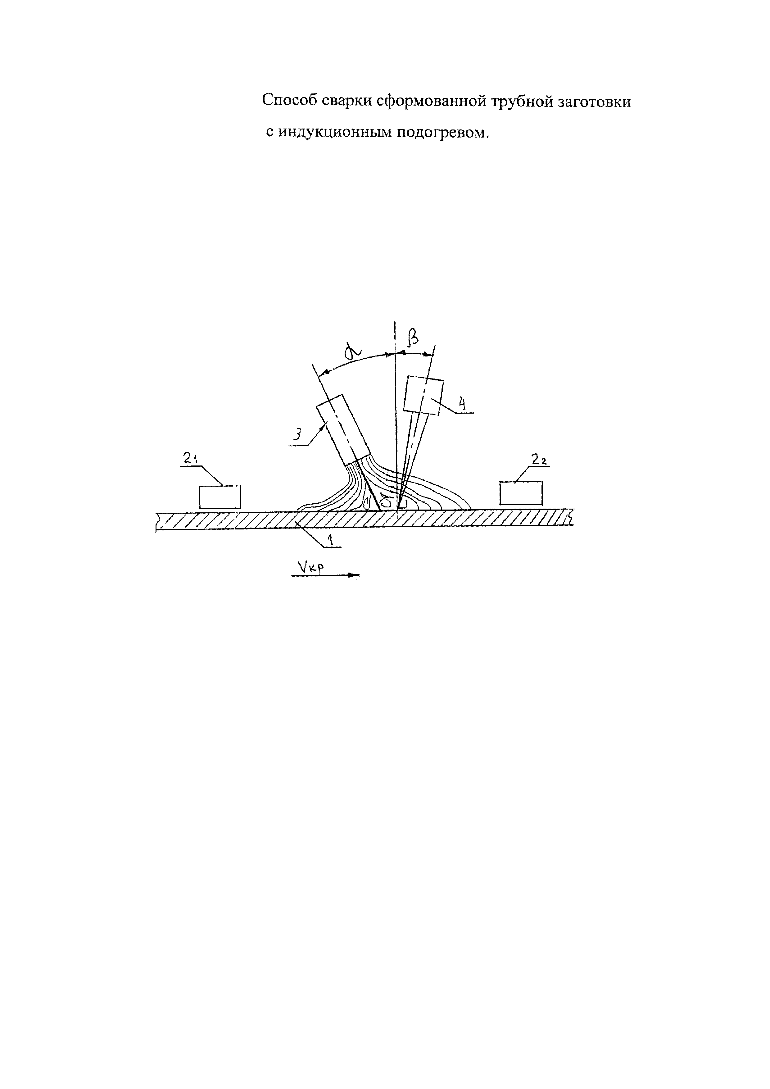 Способ сварки трубной заготовки с индукционным подогревом, включающий температурное воздействие на околошовную зону свариваемого участка трубной заготовки посредством индукционного нагрева до и после сварки и воздействие на свариваемую поверхность электрической дугой с плавящимся электродом, отличающийся тем, что до сварки на околошовную зону свариваемого участка трубной заготовки оказывают температурное воздействие посредством индукционного нагрева его до температуры 200-350°С, после чего температурное воздействие прекращают и на нагретую свариваемую поверхность воздействуют электрической дугой плавящегося электрода и лазерным лучом с образованием общей сварочной ванны, при этом лазерный луч фокусируют на свариваемые кромки трубной заготовки после сварочной дуговой горелки, а расстояние между центром сфокусированного пятна лазерного луча и точкой дугового контакта сварочной горелки составляет 10-15 мм, причем лазерный луч наклоняют в сторону направления движения свариваемых кромок на угол 20-25° относительно нормали к поверхности свариваемых кромок, а сварочную дуговую горелку наклоняют в сторону, противоположную направлению движения свариваемых кромок, на угол 30-35° относительно нормали к поверхности свариваемых кромок, при этом в процессе сварки подают защитный газ в одном направлении с электродом сварочной дуговой горелки, электрод сварочной дуговой горелки подключают к плюсу источника питания, а трубную заготовку в зоне сварки посредством токопроводящей щетки подключают к минусу источника питания, при этом после сварки повторно оказывают температурное воздействие на околошовную зону сваренного участка трубы посредством индукционного нагрева до температуры 200-350°С, которую поддерживают в этих пределах до тех пор, пока температура сварного шва не сравняется с вышеуказанной температурой околошовной зоны, после чего индукционный нагрев прекращают.