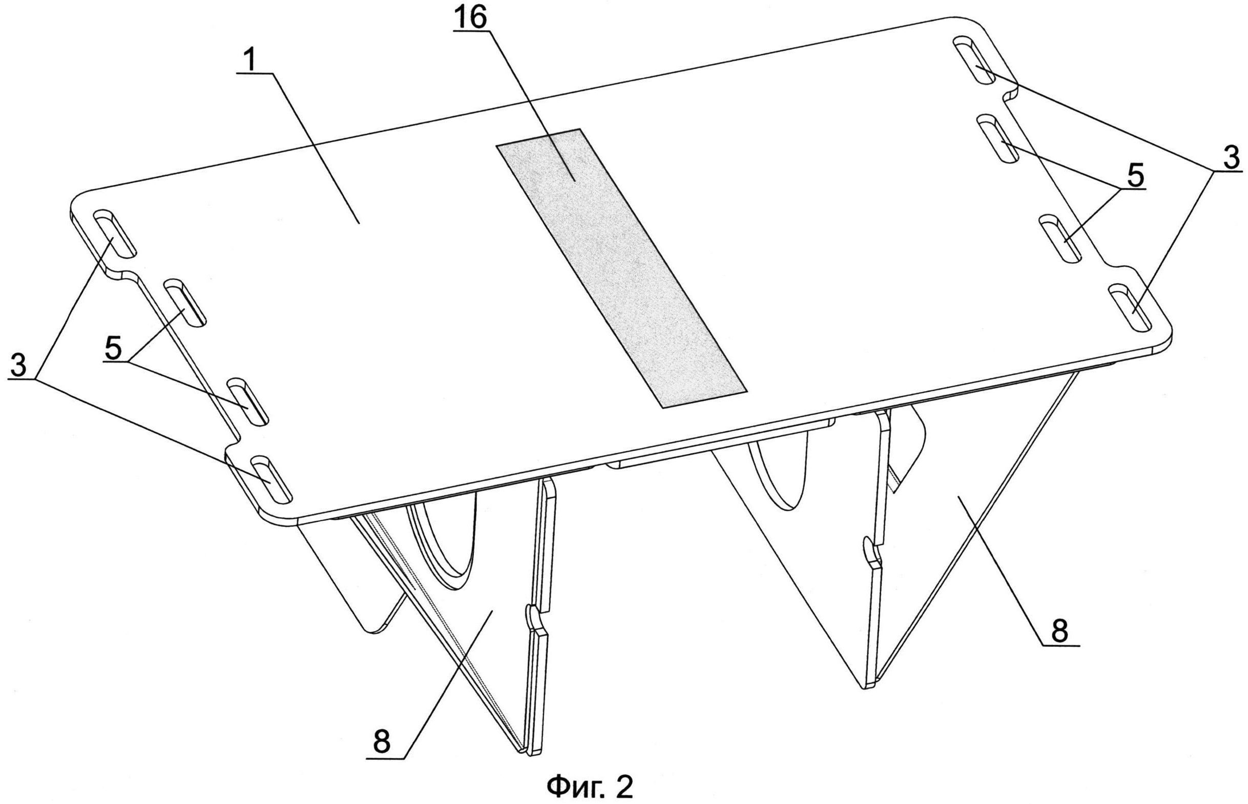 1. Складной фиксатор головы, содержащий пластиковое основание, ремни для крепления к щиту-носилкам, ремни для фиксации лба и подбородка, отличающийся тем, что фиксатор головы содержит основание, на котором закреплена эластичная накладка под голову, по краям основания с каждой стороны выполнены радиальные пазы, в которых размещены ремни для крепления основания фиксатора головы к носилкам и радиальные пазы, в которых размещены соответственно ремень для фиксации лба пострадавшего и ремень для фиксации его подбородка, на основании фиксатора головы закреплены две боковые опоры для головы, каждая боковая опора выполнена в виде съемного сборно-разборного элемента, разделенного линиями сгиба с выполненными на них перфорациями, на три конструктивные секции, первая секция представляет собой вертикальную стенку, в центре которой выполнено окно и закреплена эластична накладка для головы, вторая секция представляет собой боковую наклонную опору с щелевым окном для установки и демонтажа опоры для головы и направляющим козырьком для ремней и фиксации лба и подбородка, а третья секция является основанием боковой опоры. 2. Фиксатор головы по п.1, отличающийся тем, что эластичные накладки на основании фиксатора головы и на вертикальных стенках боковых опор для головы снабжены элементами крепления в виде ленты «велькро». 3. Фиксатор головы по п.1, отличающийся тем, что стороны основания опор для головы, контактирующие с основанием фиксатора головы, снабжены элементами крепления в виде ленты «велькро». 4. Фиксатор головы по п.1, отличающийся тем, что сторона основания фиксатора головы, контактирующая с носилками, снабжена элементами крепления в виде ленты «велькро». 5. Фиксатор головы по п.1, отличающийся тем, что ремни для фиксации лба и подбородка пострадавшего снабжены эластичными накладками. 6. Фиксатор головы по п.1, отличающийся тем, что ремни для фиксации лба и подбородка пострадавшего снабжены запорными кольцами, а на концах установлены элементы крепления в виде ленты «велькро». 7. Фиксатор головы по п.1, отличающийся тем, что ремни для фиксации к щиту-носилкам снабжены запорными кольцами, а на концах установлены элементы крепления в виде ленты «велькро». 8. Фиксатор головы по п.1, отличающийся тем, что эластичные накладки выполнены из изолона-пенополиэтилена.