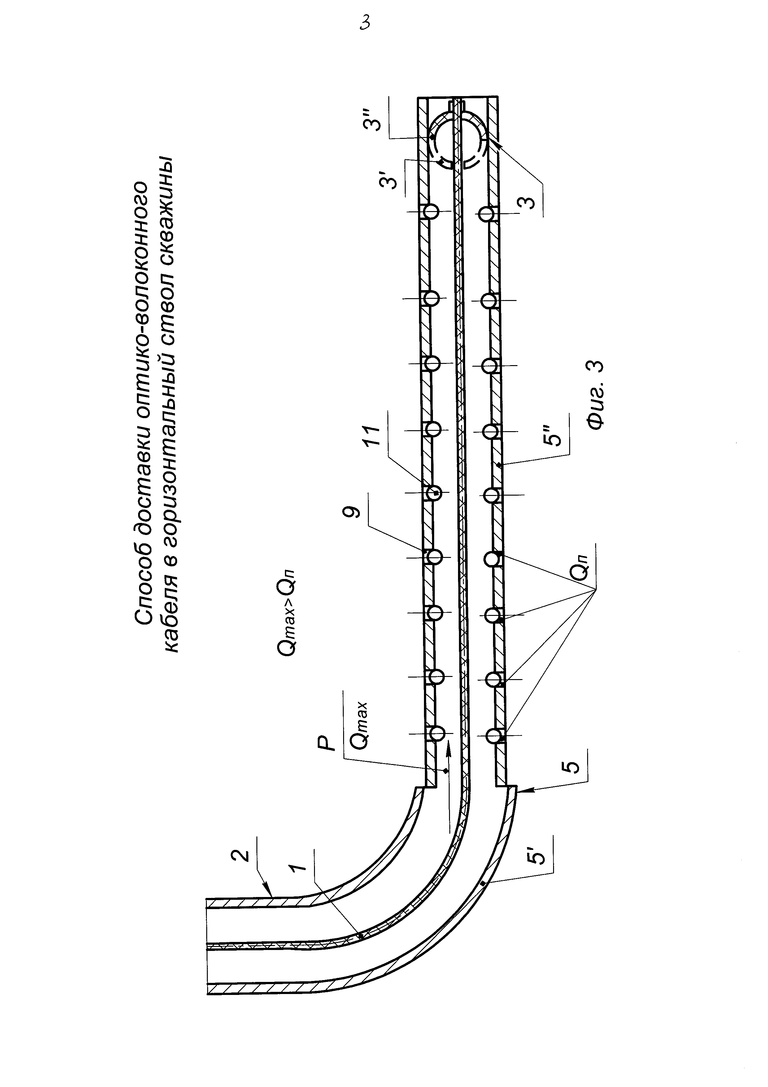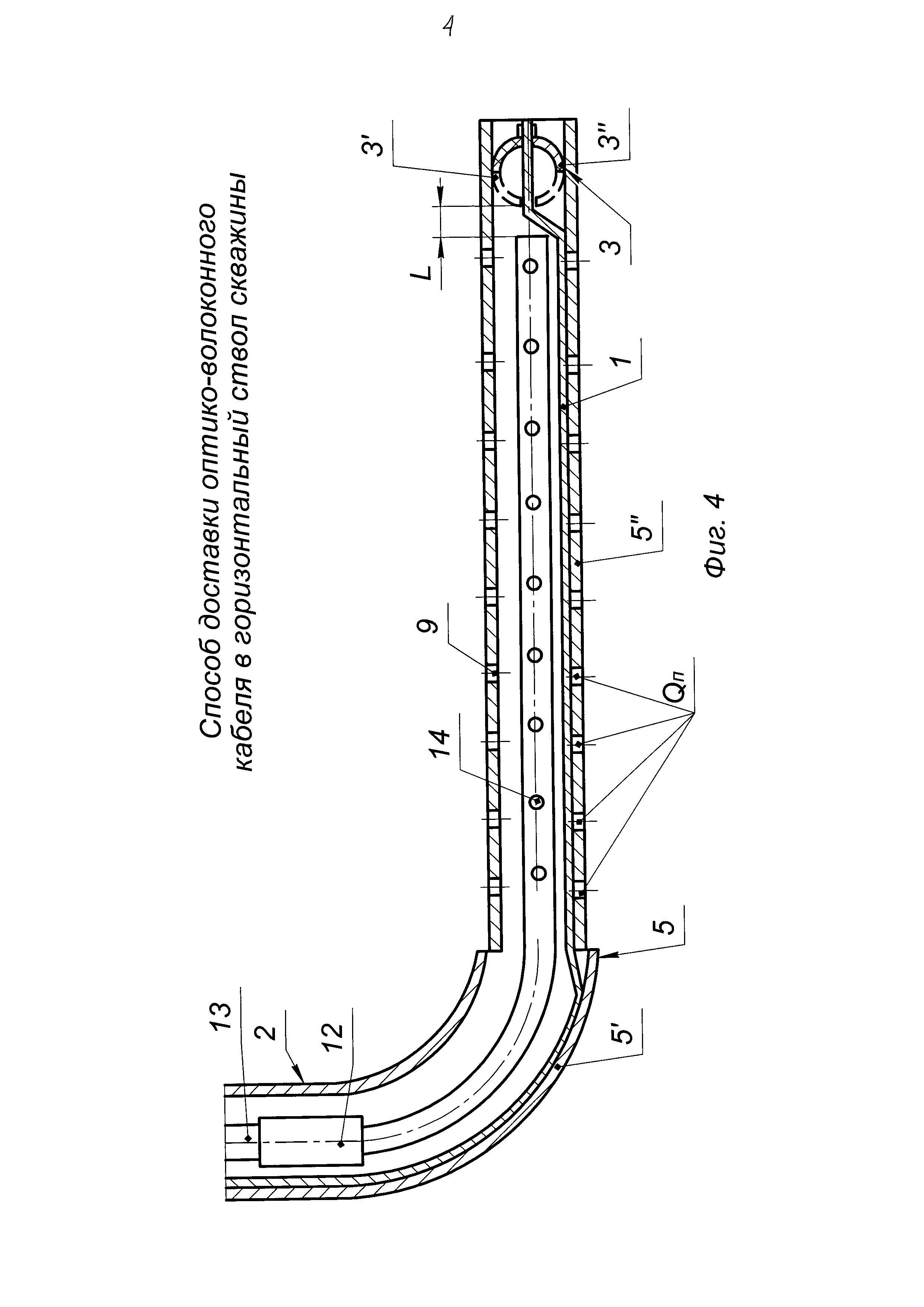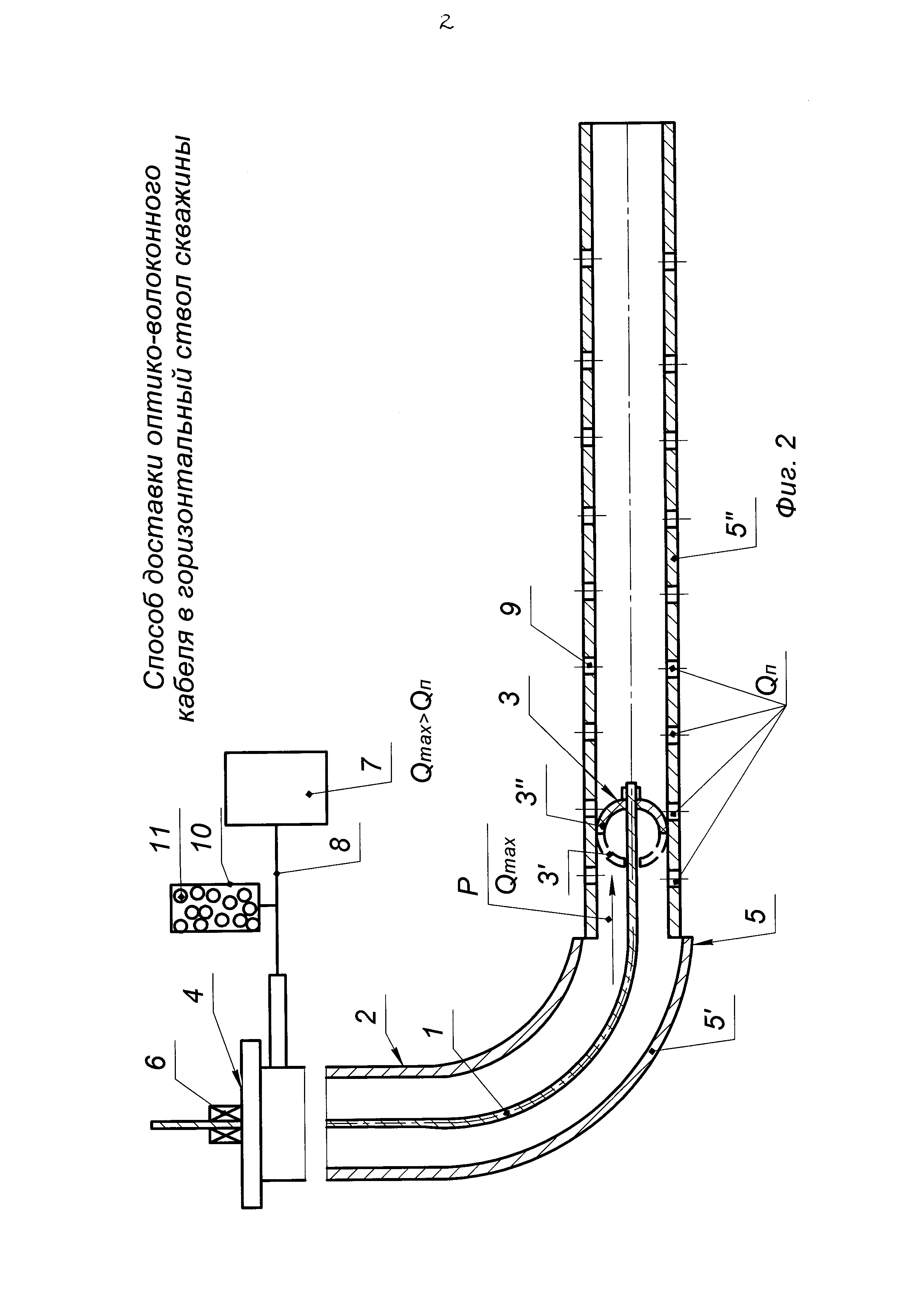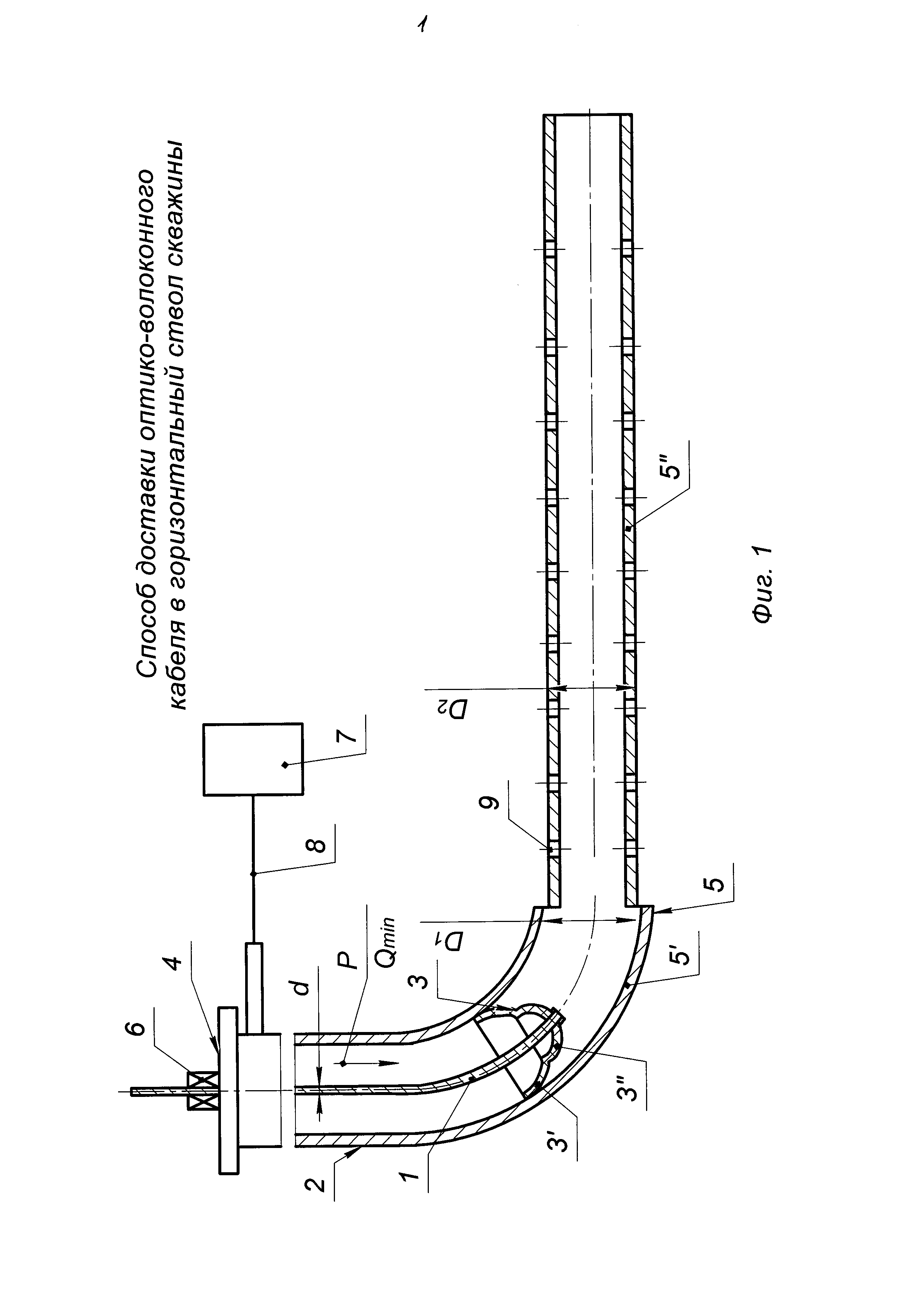 Способ доставки оптико-волоконного кабеля в горизонтальный ствол скважины, включающий размещение оптико-волоконного кабеля в непрерывном трубопроводе, оснащенном на нижнем конце насадкой неразъемным в скважинных условиях соединением, спуск в эксплуатационную колонну горизонтального ствола скважины непрерывного трубопровода и колонны насосно-компрессорных труб - НКТ, эксплуатацию в скважине колонны НКТ с насосом и оптико-волоконного кабеля независимо друг от друга, отличающийся тем, что неразъемная насадка выполнена в виде ступенчатой уплотнительной пробки, состоящей из самоуплотняющихся манжет, не пропускающих сверху вниз, ступенчатую уплотнительную пробку размещают в эксплуатационной колонне скважины и под действием гидравлического давления с расходом 4,5 л/с проталкивают до начала поглощения технологической жидкости перфорационными отверстиями эксплуатационной колонны, увеличивают расход технологической жидкости до 19,6 л/с и перемещают ступенчатую уплотнительную пробку с непрерывным трубопроводом до заданного интервала, при отсутствии перемещения ступенчатой уплотнительной пробки производят совместную закачку технологической жидкости с уплотняющими шариками, при этом в процессе перемещения уплотнительной пробки с непрерывным трубопроводом уплотнительные шарики герметизируют перфорационные отверстия эксплуатационной колонны до достижения заданного интервала доставки оптико-волоконного кабеля, после чего в эксплуатационную колонну скважины спускают насос на колонне НКТ, оснащенной снизу перфорированным хвостовиком, до заданного интервала.