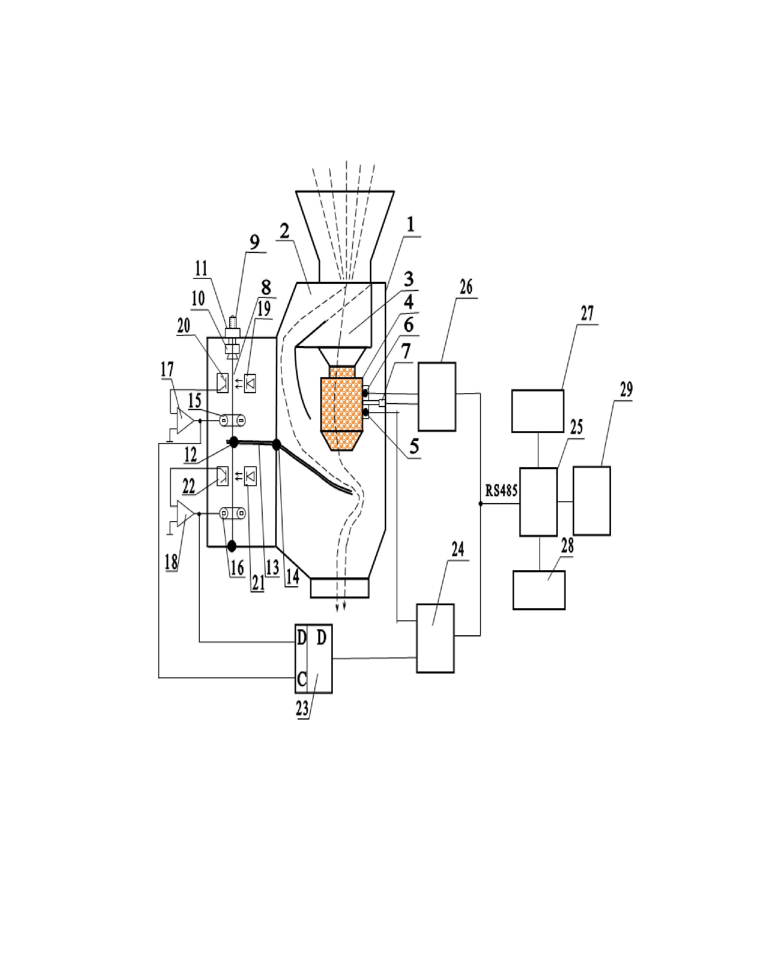 Изобретение относится к сельскому хозяйству, в частности к мониторингу урожайности при комбайновой уборке зерновых культур. Известен поточный расходомер зерна серии «Шлейф» (http://plaun-s.ru/SenConsumption.html), входящий в систему автоматического увлажнения зерна «Плаун», представляющий собой лотковый расходомер с электронным преобразователем сигнала тензодатчика в сигнал интерфейса RS485 и компьютер с программным обеспечением для сбора и хранения данных. Недостатком известного решения является сложность обработки сигнала тензодатчика, большая погрешность и отсутствие поточного измерителя влажности зерна. Наиболее близким по технической сущности является автоматизированная система поточного измерения урожайности зерна патент RU 2670718 С9 МПК G01F 1/30, 2018 г., который выбран в качестве прототипа. Недостатком известного устройства является высокая стоимость датчиков давления и недостаточная помехоустойчивость. Техническая задачи заключается в повышении помехоустойчивости измерений в условиях сильных вибраций и снижения стоимости при комбайновой уборке зерновых культур. Техническая задача достигается тем, что автоматизированная система поточного измерения урожайности зерна для технологии точного земледелия, включающая корпус, встраиваемый в падающий поток зерна, разветвитель потока, стабилизатор, измерительную камеру с датчиками влажности, температуры и натуры, лотковый расходомер с электронной системой компенсации налипшей пыли и обработки сигналов датчиков, отличающаяся тем, что измерительная часть лоткового расходомера зерна, выполнена в виде металлической струны, одним концом жестко закрепленной на стенке корпуса, а другим на противоположной его стороне креплением с возможностью ее натяжения, середина струны жестко связана с концом измерительного лотка, имеющего точку опоры на корпусе, образуя две независимые секции, в которых размещены две катушки возбуждения колебаний, подключенные к выходам двух усилителей колебаний, входами соединенных с выходами двух оптопар (фотоприемник-излучатель), размещенных в зоне их колебаний. Изобретение поясняется чертежом. На чертеже изображена принципиальная схема автоматизированной системы поточного измерения урожайности зерна при комбайновой уборке. Автоматизированная система поточного измерения урожайности зерна для технологии точного земледелия содержит корпус 1, встраиваемый в верхней части загрузочного шнека бункера в падающий поток зерна, разветвитель потока 2, выполненный в виде наклонной плоскости для устранения кинематической энергии падающего зерна и отведения части зерна потока через стабилизатор потока 3 в измерительную камеру 4 с емкостным датчиком влажности 5, датчиком температуры зерна 6 и тензодатчиком натуры 7, измерительная часть лоткового расходомера общего потока зерна представляет металлическую струну 8 одним концом жестко закрепленной на стенке корпуса, а другим на противоположной его стороне с помощью цангового крепления винта 9 с гайкой для затяжки струны 10 и с возможностью натяжки струны с помощью гайки 11, середина струны 12 жестко связана с концом измерительного лотка 13, имеющего точку опоры на корпусе 14, две электромагнитные катушки возбуждения колебаний секций струн 15, 16 подключены к выходам двух усилителей 17, 18, входами соединенных с выхо