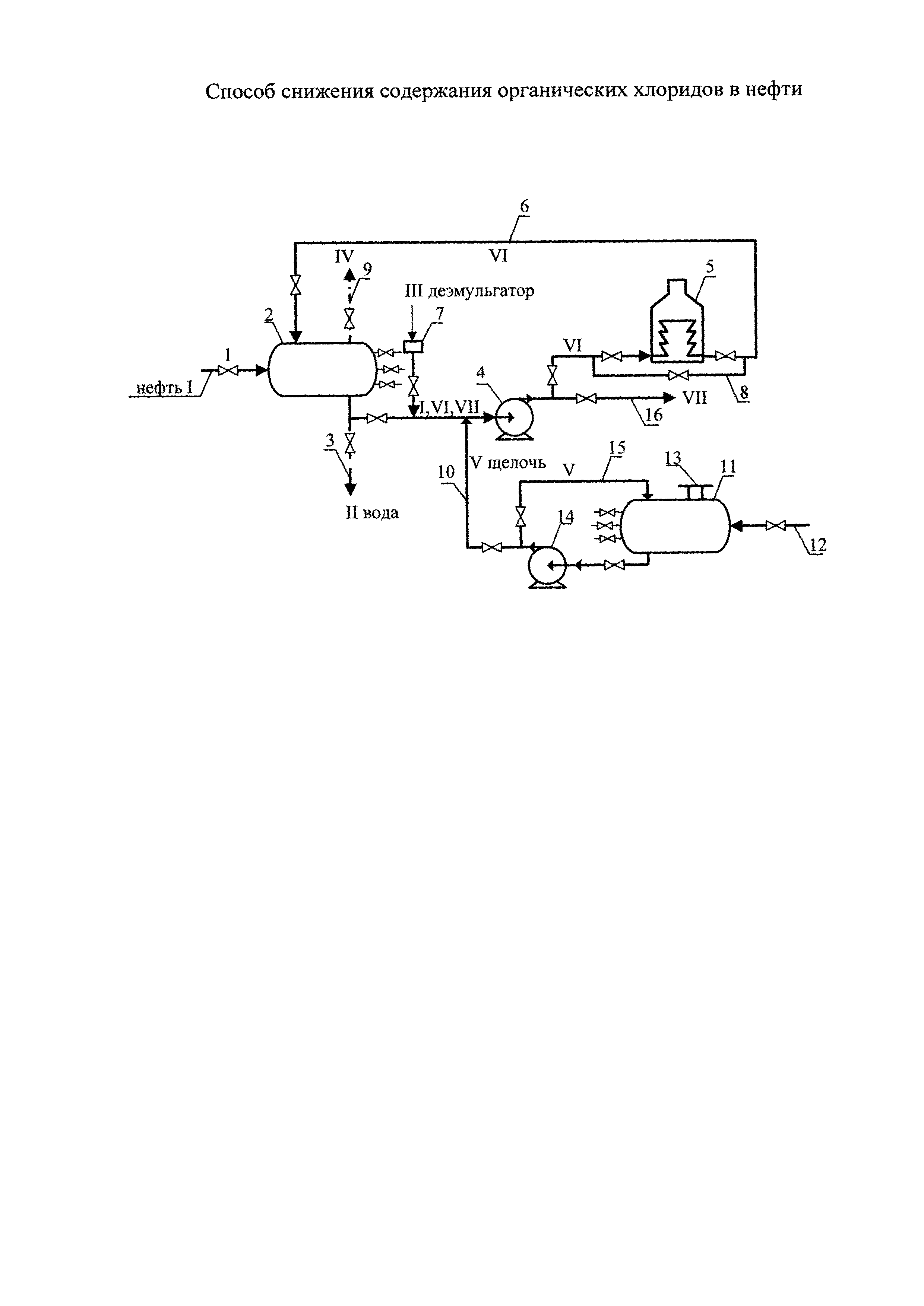 Изобретение относится к нефтяной промышленности, в частности к способам снижения содержания органических хлоридов в нефти. Данный способ применим к нефти с содержанием органических хлоридов, значительно превышающим 10 млн(порядка 1000 млни более). Способ снижения содержания органических хлоридов в нефти включает отстаивание и предварительное обезвоживание нефти при нагреве, обработку нефти раствором щелочи при нагреве, отстаивание смеси нефти и раствора щелочи, отвод отработанного раствора щелочи и отвод очищенной нефти, где для предварительного обезвоживания нефти проводят циркуляцию нефти с нагревом, после нагрева в нефть подают деэмульгатор, осуществляют циркуляцию смеси нефти с деэмульгатором не менее одного часа, после чего ее отстаивают не менее двух часов, отводят отделившуюся воду, циркуляцию возобновляют, при циркуляции нефти подают 10-20%-ный водный раствор гидроксида натрия или калия с дозировкой 20-30% на нефть, нагревают смесь нефти и водного раствора гидроксида натрия или калия до температуры 190-200°С при поддержании избыточного давления не менее 1,6 МПа в течение 6 часов, затем выдерживают смесь нефти и водного раствора гидроксида натрия или калия в течение 6 часов, в зависимости от их строения циклы обработки нефти водным раствором гидроксида натрия или калия повторяют при температуре 220-230°C и избыточном давлении не менее 2,8 МПа для нефти, не содержащей легколетучие хлорорганические соединения ароматического строения, до значения массовой доли органических хлоридов не более 10 млн, и для нефти, содержащей легколетучие хлорорганические соединения ароматического строения, до значения массовой доли органических хлоридов не более 100 млн. Предлагаемый способ снижения содержания органических хлоридов в нефти имеет следующие преимущества: во-первых, способ может быть реализован для нефти с содержанием органических хлоридов в нефти, значительно превышающим 10 млн(порядка 1000 млни более); во-вторых, способ обеспечивает снижение массовой доли органических хлоридов до 10 млндля нефти, не содержащей легколетучие хлорорганические соединения ароматического строения, и до 100 млндля нефти, содержащей легколетучие хлорорганические соединения ароматического строения. 1 з.п. ф-лы, 1 ил., 2 табл., 8 пр.