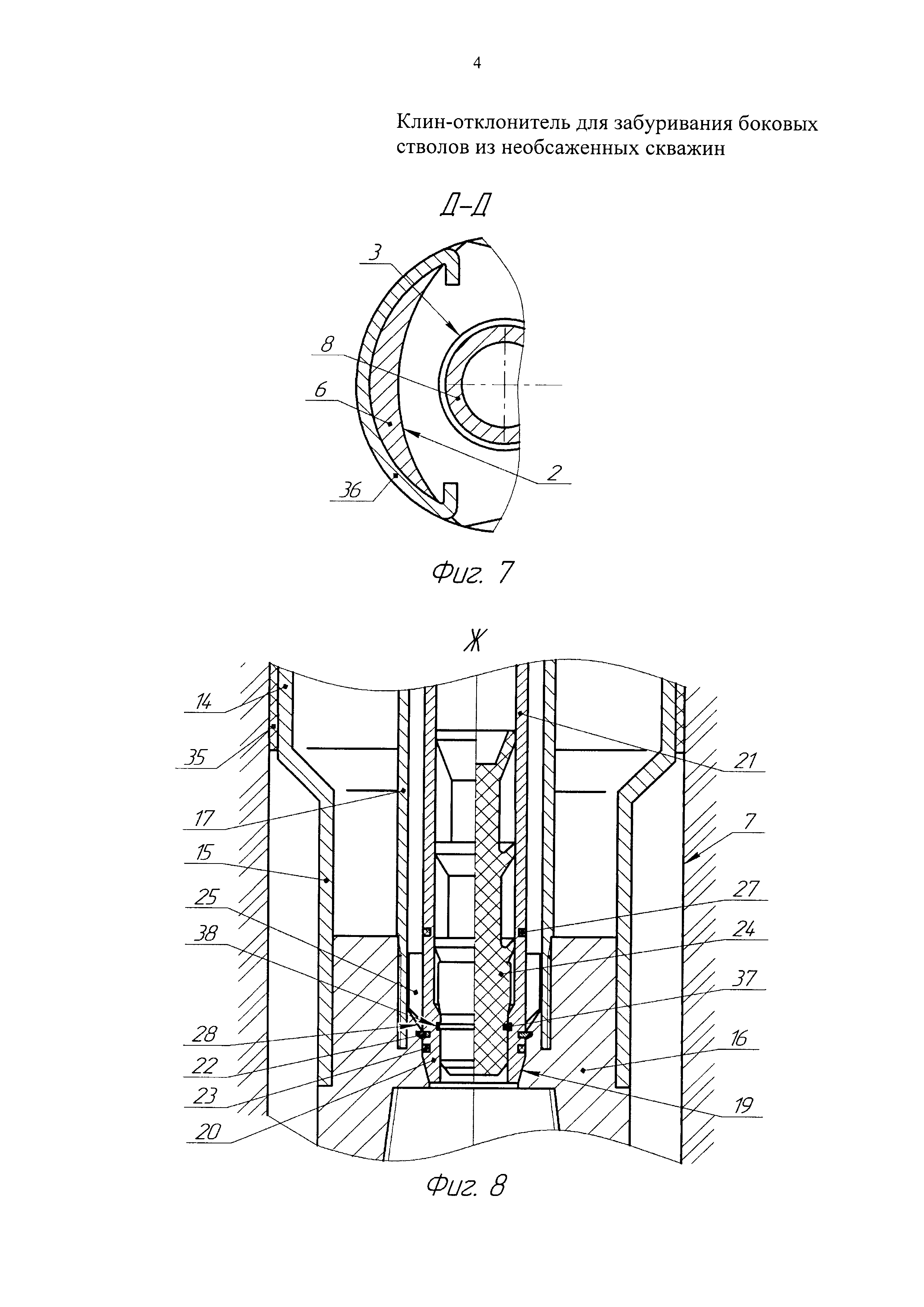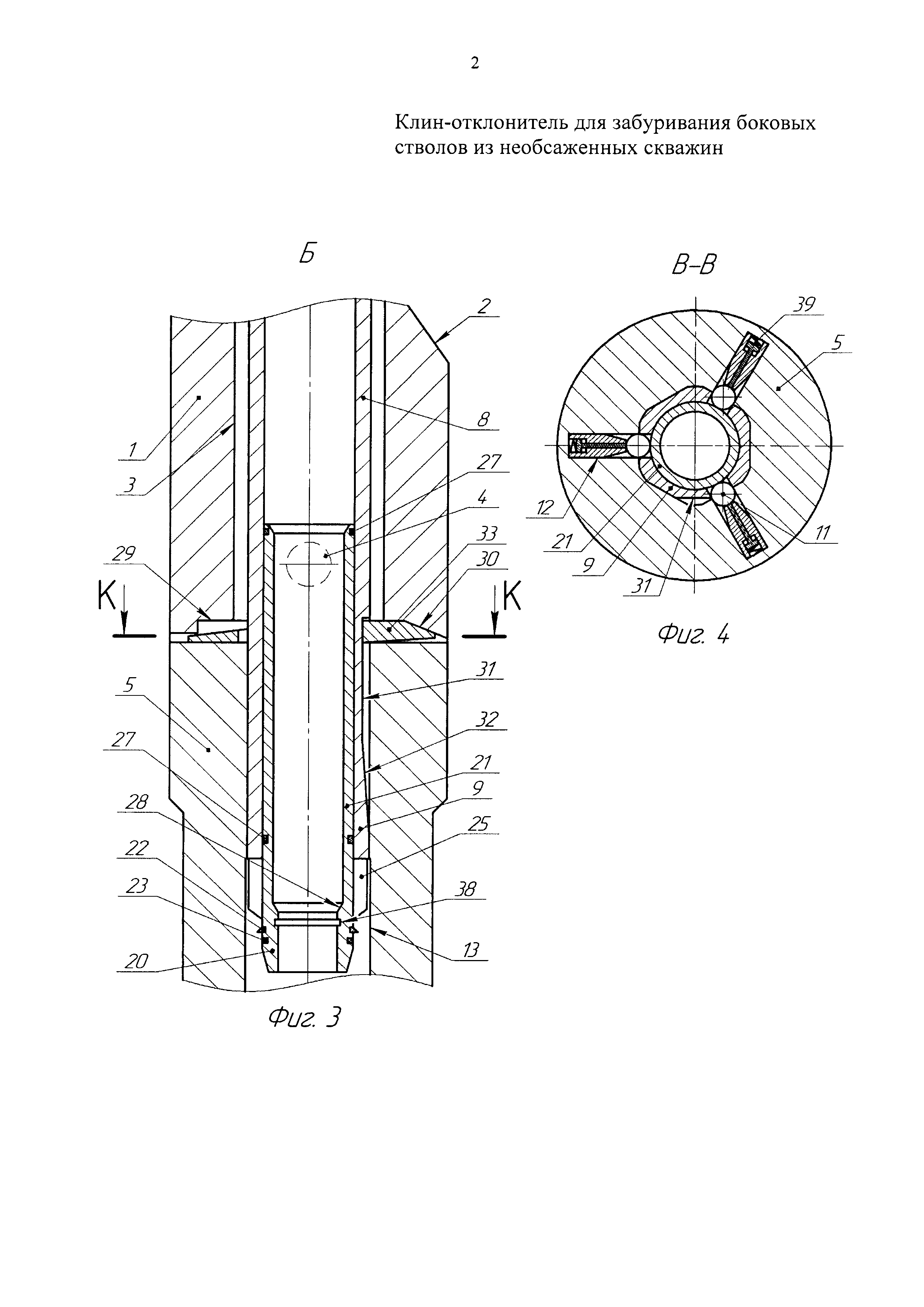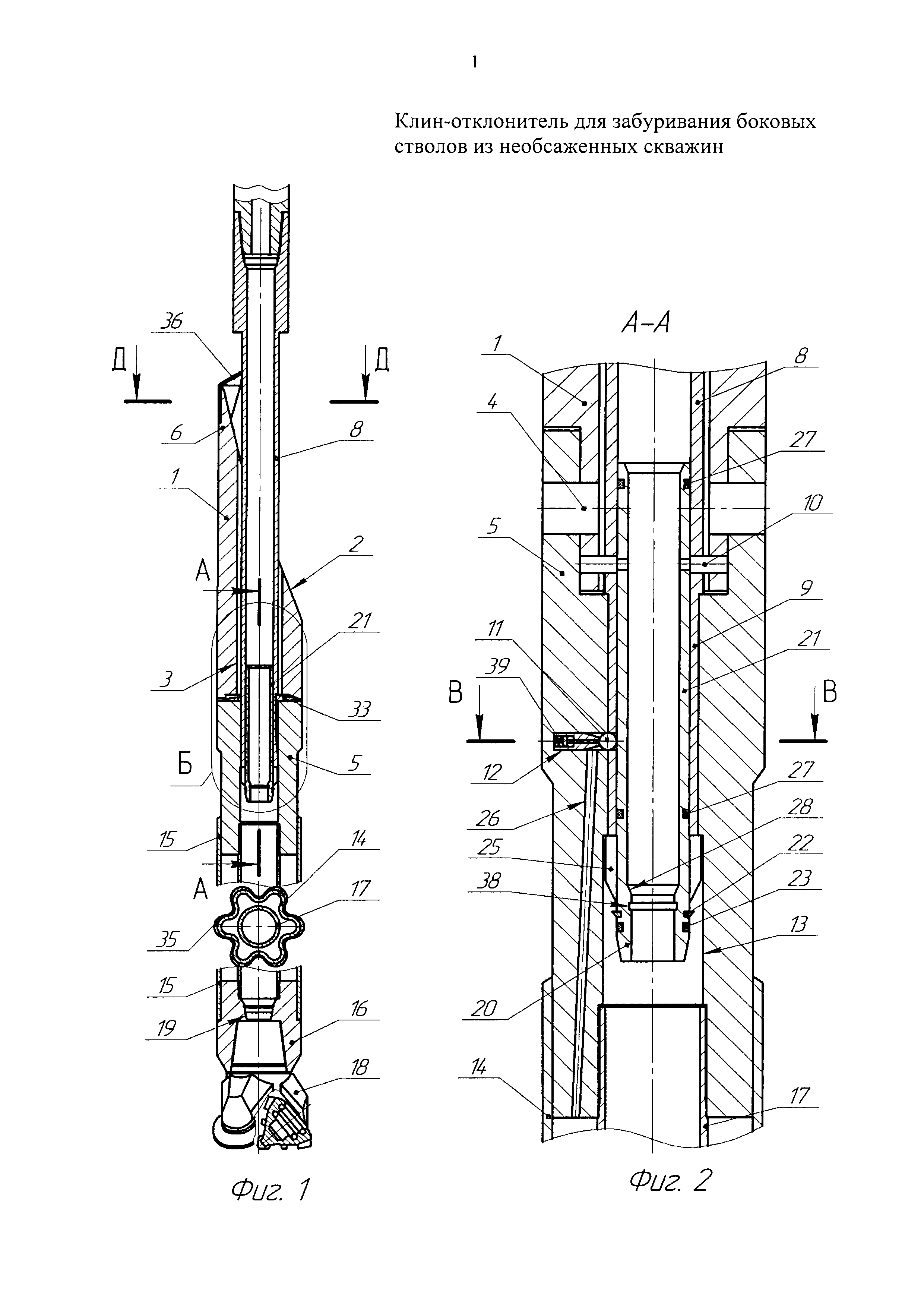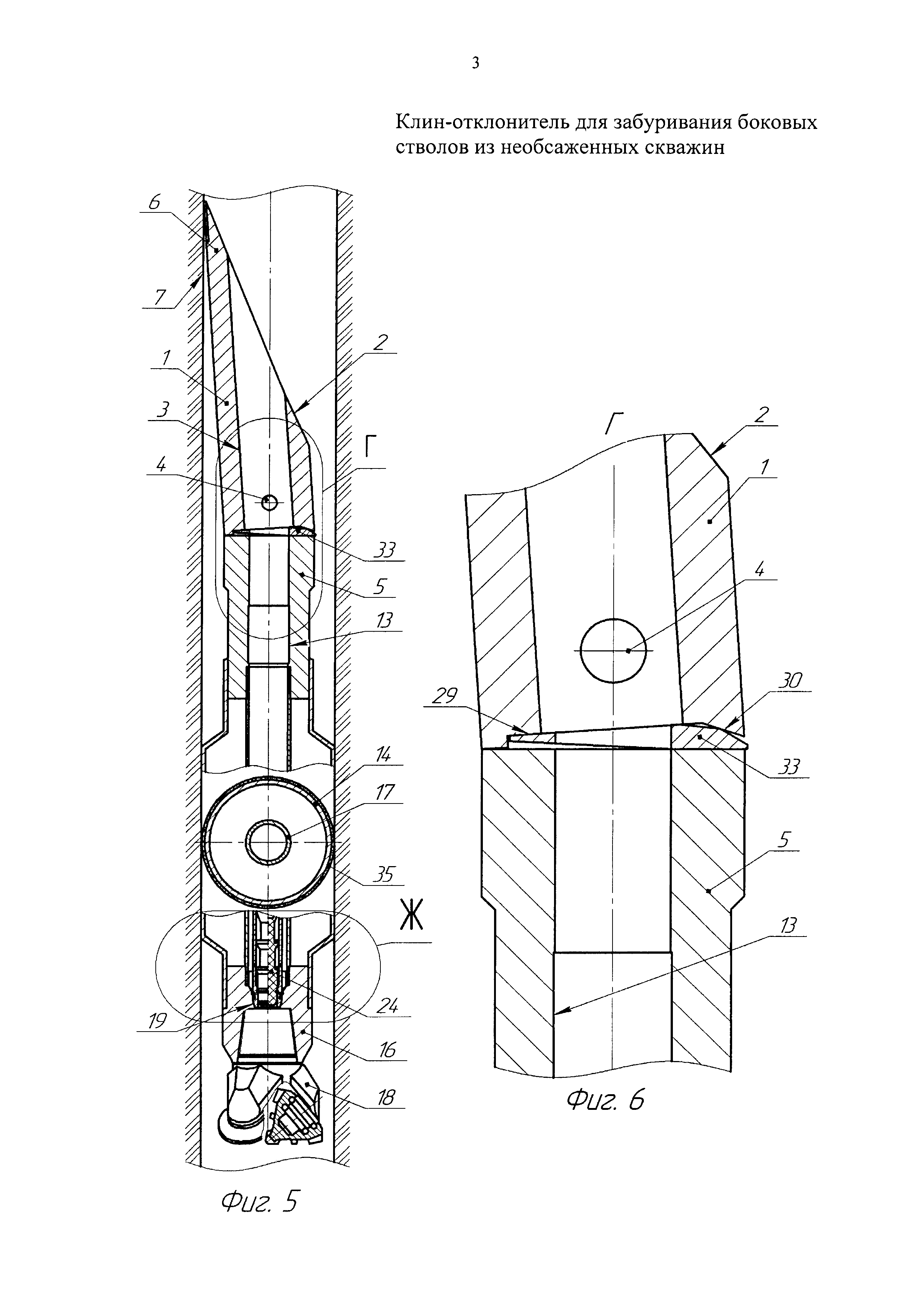 1. Клин-отклонитель для забуривания боковых стволов из необсаженных скважин, включающий клин с направляющим желобом и продольным каналом, соединенный шарнирно поперечной осью с переходником с возможностью механического прижатия головки клина к стенке скважины, посадочный инструмент, выполненный в виде полой штанги, проходящей через продольный канал клина, и соединенный с переходником с возможностью только продольного перемещения и фиксации срезными элементами и шариками, причем шарики размещены в глухих радиальных отверстиях переходника, сообщенных с его каналом, и выполнены подпружиненными вовнутрь, размещенными соответственно в верхних и нижних рядах радиальных отверстий полой штанги, раздуваемый якорь, выполненный в виде продольно гофрированной трубы с цилиндрическими концами, жестко соединенный с переходником снизу и оснащенный башмаком, который соединен технологической трубой с переходником, оснащен снизу калибратором, а изнутри - седлом под ниппель полой втулки, которая выполнена с возможностью фиксации расположенным снизу замковым элементом в седле башмака, размещена в полой штанге с возможностью перемещения вниз с фиксацией срезными элементами, причем центральный канал переходника сообщен каналом с пространством между якорем и технологической трубой, а полая втулка установлена с возможностью герметичного перекрытия рядов радиальных отверстий и взаимодействия с шариками, оснащена изнутри сужением под бросовый с устья элемент, отличающийся тем, что клин снизу оснащен проточкой, параллельной оси шарнирного соединения, причем со стороны желоба проточка от края клина выполнена наклонной с подъемом в сторону оси, полая штанга в районе зазора между клином и переходником снабжена со стороны желоба клина состыкованными плоскостями, верхняя из которых параллельна центральной оси, а нижняя - под углом от верхней плоскости в направлении переходника, в зазор между клином и переходником установлен клиновой толкатель с отверстием, взаимодействующим с плоскостями полой штанги с возможностью перемещения при вытягивании полой штанги вверх клинового толкателя в сторону наклона проточки до взаимодействия и с последующим прижатием головки клина к стенке скважины и фиксацией в таком положении. 2. Клин-отклонитель для забуривания боковых стволов из необсаженных скважин по п. 1, отличающийся тем, что на наружной поверхности якоря размещены эластичные манжеты.