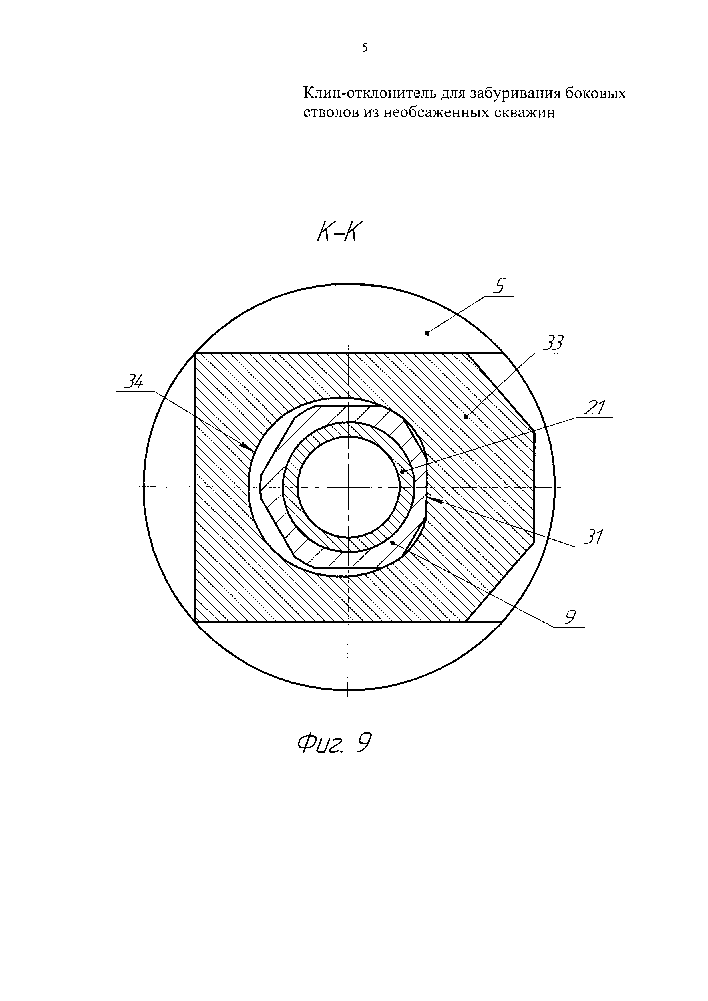 Изобретение относится к бурению скважин, а именно к забуриванию боковых стволов из ранее пробуренных необсаженных скважин. Клин-отклонитель для забуривания боковых стволов из необсаженных скважин включает клин с направляющим желобом и продольным каналом, соединенный шарнирно поперечной осью с переходником с возможностью механического прижатия головки клина к стенке скважины, посадочный инструмент, выполненный в виде полой штанги, проходящей через продольный канал клина, и соединенный с переходником с возможностью только продольного перемещения и фиксации срезными элементами и шариками, причем шарики размещены в глухих радиальных отверстиях переходника, сообщенных с его каналом, и выполнены подпружиненными вовнутрь, размещенными соответственно в верхних и нижних рядах радиальных отверстий полой штанги, раздуваемый якорь, выполненный в виде продольно гофрированной трубы с цилиндрическими концами, жестко соединенный с переходником снизу и оснащенный башмаком, который соединен технологической трубой с переходником, оснащен снизу калибратором, а изнутри - седлом под ниппель полой втулки, которая выполнена с возможностью фиксации расположенным снизу замковым элементом в седле башмака, размещена в полой штанге с возможностью перемещения вниз с фиксацией срезными элементами. Центральный канал переходника сообщен каналом с пространством между якорем и технологической трубой, а полая втулка установлена с возможностью герметичного перекрытия рядов радиальных отверстий и взаимодействия с шариками, оснащена изнутри сужением под бросовый с устья элемент. Клин снизу оснащен проточкой, параллельной оси шарнирного соединения. Со стороны желоба проточка от края клина выполнена наклонной с подъемом в сторону оси, полая штанга в районе зазора между клином и переходником снабжена со стороны желоба клина состыкованными плоскостями, верхняя из которых параллельна центральной оси, а нижняя - под углом от верхней плоскости в направлении переходника. В зазор между клином и переходником установлен клиновой толкатель с отверстием, взаимодействующим с плоскостями полой штанги с возможностью перемещения при вытягивании полой штанги вверх клинового толкателя в сторону наклона проточки до взаимодействия и с последующим прижатием головки клина к стенке скважины и фиксацией в таком положении. Обеспечивается возможность производить отклонение «головы» клина к стенке скважины в процессе его установки, надежно зафиксировать и гарантированно удерживать его в таком положении в процессе всего цикла строительства бокового ствола и исключить аварийные ситуации с перекрытием проходного сечения ствола скважины клином-отклонителем. Обеспечивает расширение функциональных возможностей и сокращение времени забуривания и бурения бокового ствола, что в конечном итоге позволит снизить общую стоимость строительства скважин в сложных геологических условиях. 1 з.п. ф-лы, 9 ил.
