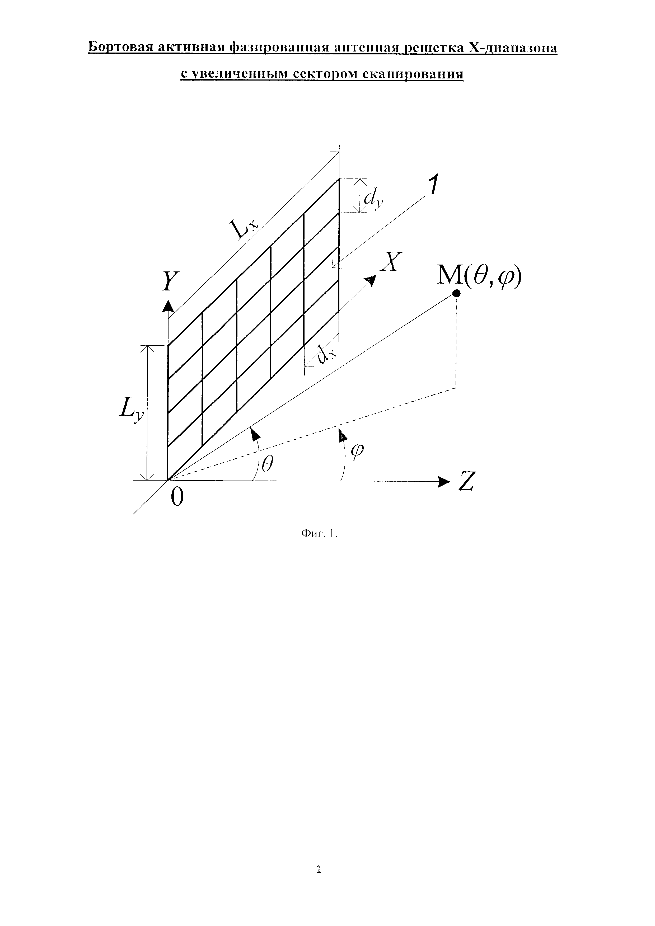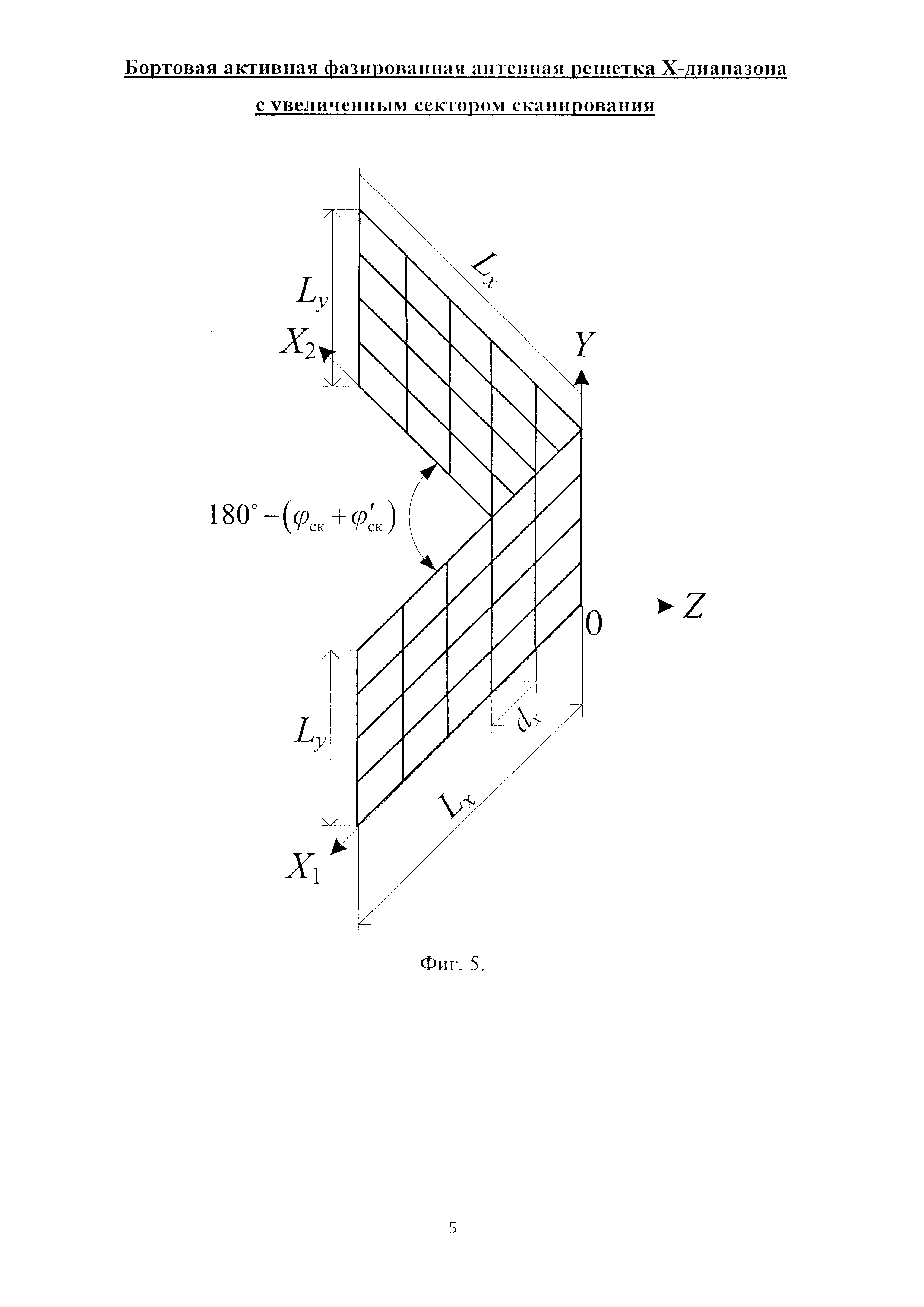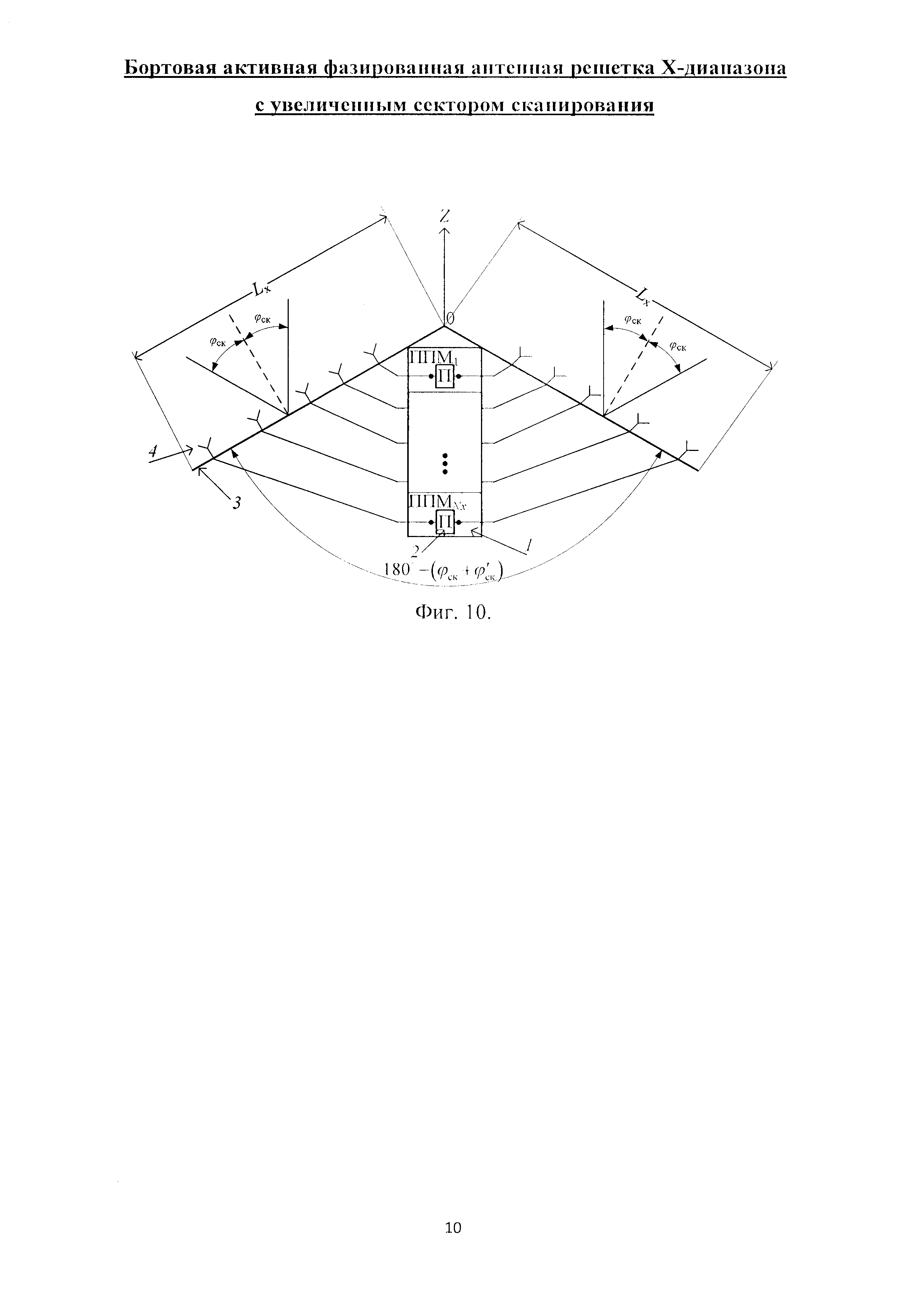 1. Бортовая активная фазированная антенная решетка X-диапазона, состоящая из двух активных фазированных антенных решеток (АФАР), каждая из которых состоит из излучающего полотна в виде излучающей поверхности из N щелевых излучателей, расположенных в торцах отрезков прямоугольных волноводов и образующих плоский излучающий раскрыв с размером Lx*Ly, и N приемопередающих модулей (ППМ), подсоединенных к излучателям и обеспечивающих электрическое сканирование в азимутальной плоскости в секторе углов ±ϕск и в угломестной плоскости в секторе углов ±θск, отличающаяся тем, что АФАР выполнена в виде двух антенных решеток (АР) с плоской прямоугольной апертурой с общим числом излучателей 2N, расположенных симметрично относительно оси, совмещаемой с продольной осью самолета (вертолета), с наклоном θ0 относительно прямоугольных апертур при θ0=0 и под углом 2. Бортовая активная фазированная антенная решетка по п. 1, отличающаяся тем, что излучающие полотна АФАР образуют клин. 3. Бортовая активная фазированная антенная решетка по п. 1, отличающаяся тем, что излучающие полотна АФАР образуют усеченный клин. 4. Бортовая активная фазированная антенная решетка по п. 1, отличающаяся тем, что излучающие полотна АФАР выполняются в форме эллипса с соотношением осей эллипса, равным отношению ширин диаграммы направленности каждой апертуры в угломестной и горизонтальной плоскостях. 5. Бортовая активная фазированная антенная решетка по п. 1, отличающаяся тем, что излучающие полотна АФАР образованы излучателями с вертикальной поляризацией. 6. Бортовая активная фазированная антенная решетка по п. 1, отличающаяся тем, что излучающие полотна АФАР образованы излучателями с горизонтальной поляризацией. 7. Бортовая активная фазированная антенная решетка по п. 1, отличающаяся тем, что излучающие полотна АФАР образованы излучателями с эллиптической поляризацией с произвольным коэффициентом эллиптичности.