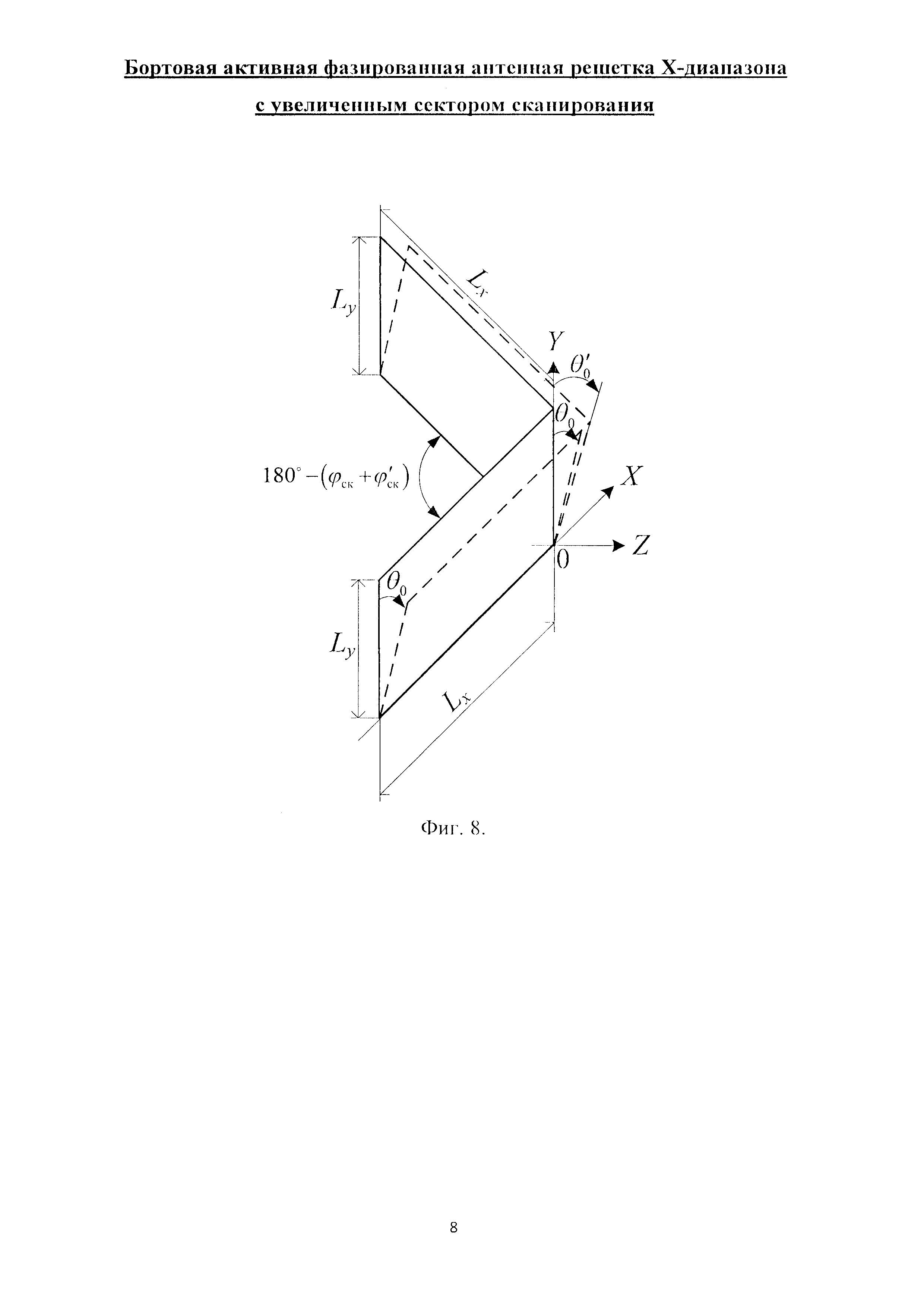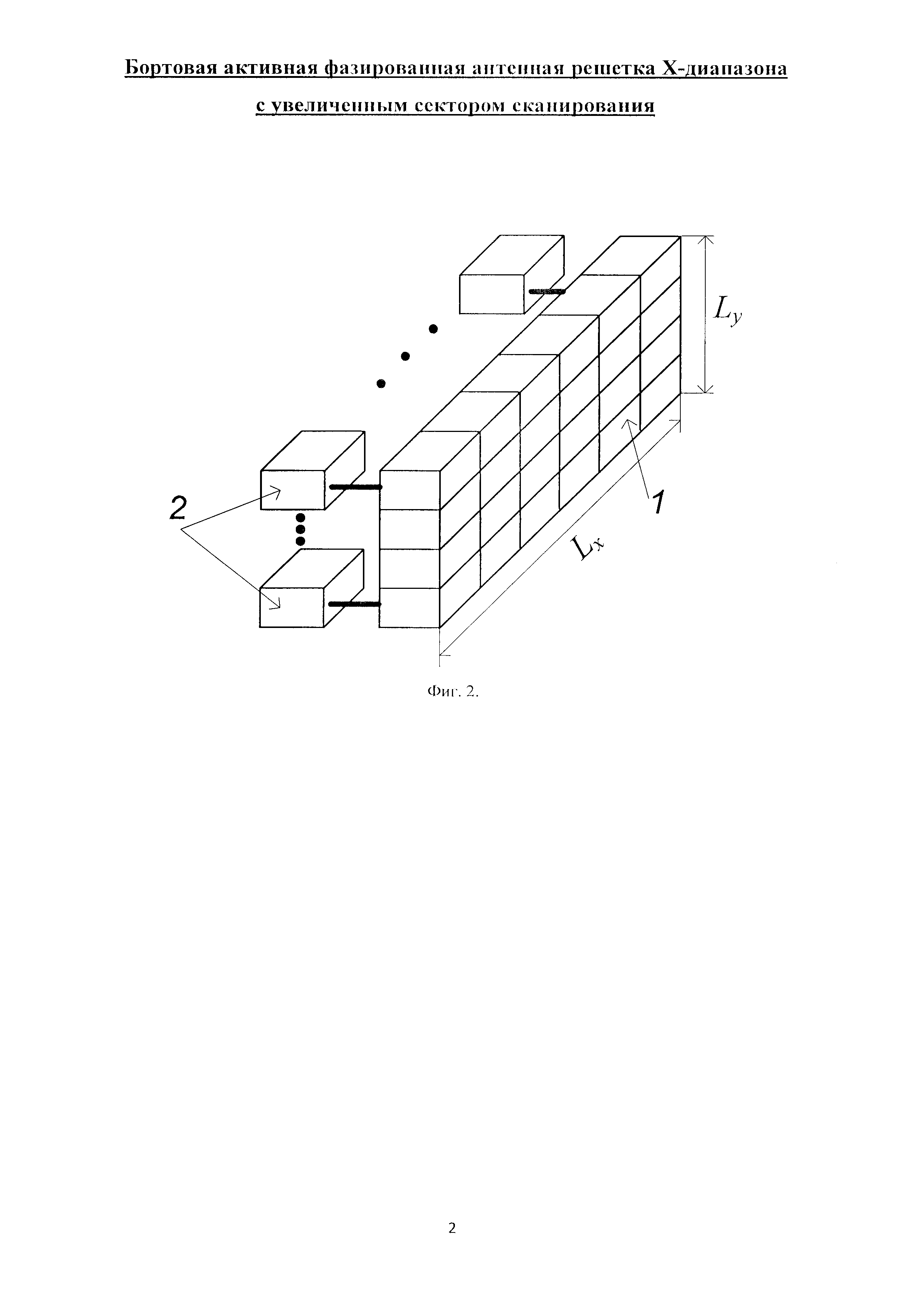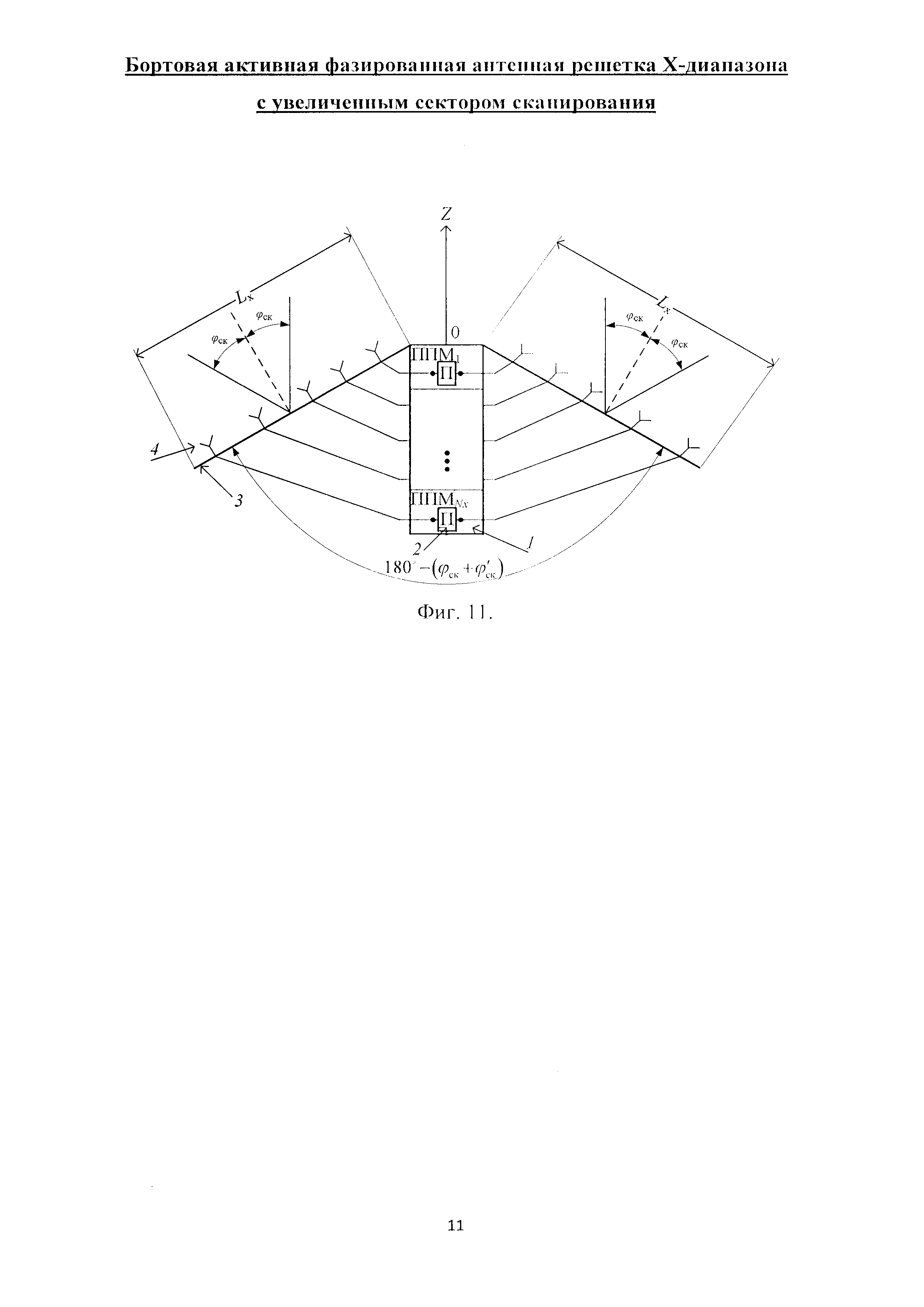 1. Бортовая активная фазированная антенная решетка X-диапазона, состоящая из двух активных фазированных антенных решеток (АФАР), каждая из которых состоит из излучающего полотна в виде излучающей поверхности из N щелевых излучателей, расположенных в торцах отрезков прямоугольных волноводов и образующих плоский излучающий раскрыв с размером Lx*Ly, и N приемопередающих модулей (ППМ), подсоединенных к излучателям и обеспечивающих электрическое сканирование в азимутальной плоскости в секторе углов ±ϕск и в угломестной плоскости в секторе углов ±θск, отличающаяся тем, что АФАР выполнена в виде двух антенных решеток (АР) с плоской прямоугольной апертурой с общим числом излучателей 2N, расположенных симметрично относительно оси, совмещаемой с продольной осью самолета (вертолета), с наклоном θ0 относительно прямоугольных апертур при θ0=0 и под углом 2. Бортовая активная фазированная антенная решетка по п. 1, отличающаяся тем, что излучающие полотна АФАР образуют клин. 3. Бортовая активная фазированная антенная решетка по п. 1, отличающаяся тем, что излучающие полотна АФАР образуют усеченный клин. 4. Бортовая активная фазированная антенная решетка по п. 1, отличающаяся тем, что излучающие полотна АФАР выполняются в форме эллипса с соотношением осей эллипса, равным отношению ширин диаграммы направленности каждой апертуры в угломестной и горизонтальной плоскостях. 5. Бортовая активная фазированная антенная решетка по п. 1, отличающаяся тем, что излучающие полотна АФАР образованы излучателями с вертикальной поляризацией. 6. Бортовая активная фазированная антенная решетка по п. 1, отличающаяся тем, что излучающие полотна АФАР образованы излучателями с горизонтальной поляризацией. 7. Бортовая активная фазированная антенная решетка по п. 1, отличающаяся тем, что излучающие полотна АФАР образованы излучателями с эллиптической поляризацией с произвольным коэффициентом эллиптичности.