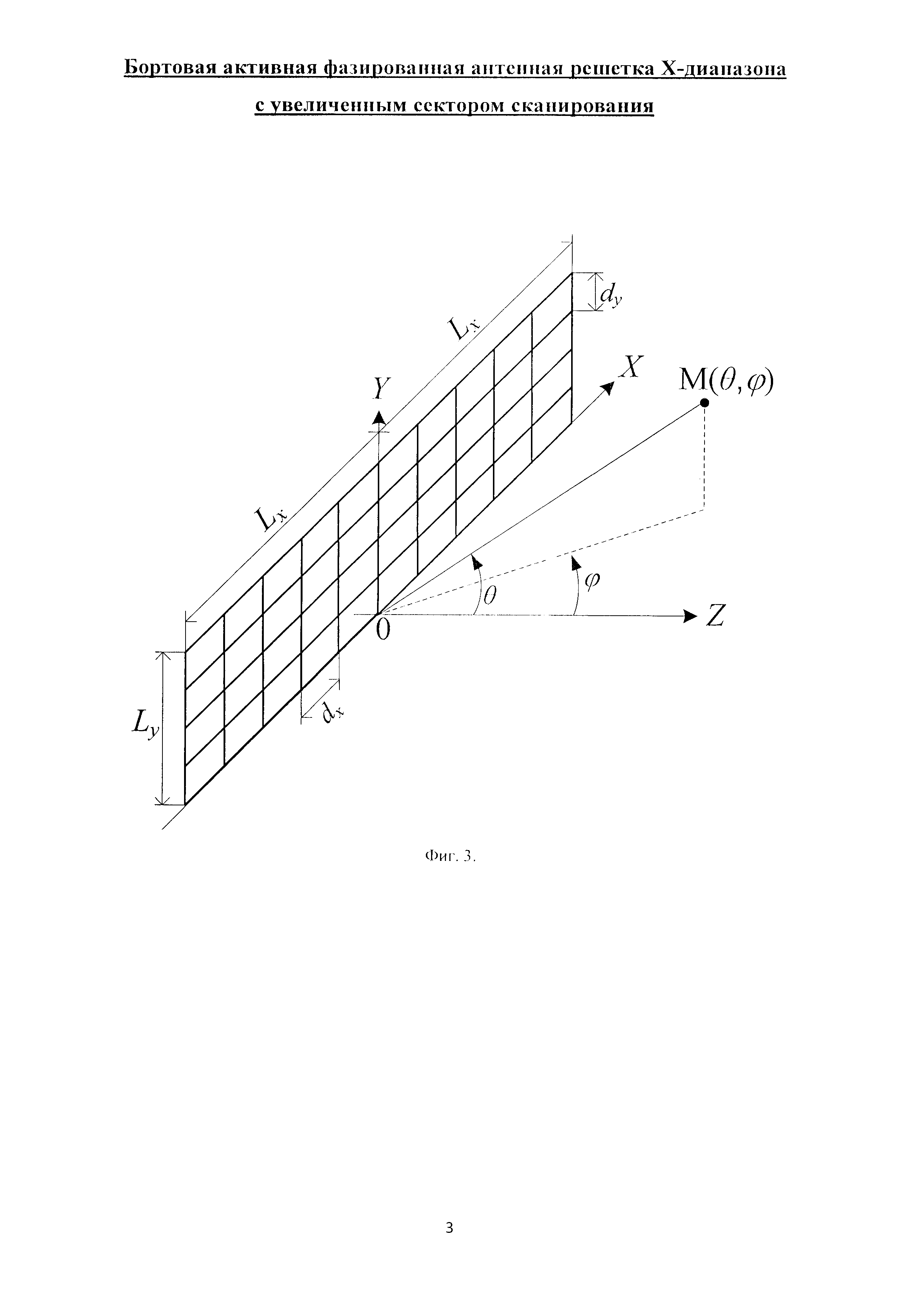 Предлагаемое техническое решение относится к технике СВЧ, в частности к активным фазированным антенным решеткам (АФАР). Известны электрически сканирующие ФАР с прямоугольной апертурой Lx*Ly, состоящие из N=Nx*Ny излучателей [ где λmin - минимальная длина волны рабочего диапазона; ][ - операция взятия целого числа. При подключении к каждому ППМ группы излучателей, общее число излучателей N не меньше, чем число ППМ Nм. Однако такая АФАР [Активные фазированные антенные решетки. Изд. 2-е. / Под ред. При подключении каждого излучателя АФАР к каждому ППМ общее число излучателей N равно общему числу ППМ Nм: При этом сектор сканирования АФАР увеличивается. Известно, что АФАР существенно превосходят ФАР по таким свойствам, как возможность повышения излучаемой мощности, по надежности, по эффективности многоканальной цифровой пространственно-временной обработки сигнала. В то же время АФАР существенно проигрывают ФАР в стоимости и массе из-за высокой стоимости и повышенных массогабаритных характеристик отдельных ППМ. Бортовая АФАР Х-диапазона, устанавливаемая в носовой части летательного аппарата, должна обеспечивать следующие пространственные сектора электрического сканирования лучом по углам Максимальный сектор электрического сканирования в решетках с плоским излучающим раскрывом (плоской апертурой) ограничен из-за известных ограничений на максимальное расстояние между соседними излучателями и конструктивных размеров поперечных сечений ППМ. Так, проведенное моделирование показывает, что для АР с излучателями в виде вертикальных щелей в торцевой стенке закороченного волновода (горизонтальная поляризация антенны) максимальный сектор сканирования в угломестной плоскости (в плоскости, проходящей через продольную ось щели, и перпендикулярную к торцевой стенке волновода) при условии θ0=0 и допустимого падения коэффициента усиления (КУ) антенны на границах сектора сканирования в пределах 4…5 дБ не превышает ±45°, а при сканировании в секторе углов ±60° в азимутальной плоскости (в плоскости, перпендикулярной продольной оси щели) падение КУ на границах сектора сканирования составляет не менее 3 дБ. В качестве излучателей могут использоваться также горизонтальные щели с вертикальной поляризацией, или системы двух ортогональных щелей с круговой поляризацией, а также вибраторные, волноводные, рупорные или иные излучатели. При вертикальной поляризации (горизонтальных щелевых излучателях) максимальный сектор сканирования в азимутальной плоскости при падении КУ антенны на границах сектора сканирования в пределах 4…5 дБ не превышает ±45°, а при сканирования в угломестной плоскости в секторе углов ±60° падение КУ на границах сектора сканирования составляет не менее 3 дБ. Соответственно для круговой поляризации сектора сканирования в обеих плоскостях при падении КУ в пределах 4…5 дБ на краях сектора сканирования приблизительно ограничены значением ±45°. Стремление расширить сектор сканирования сверх ±60° в азимутальной плоскости даже для вертикальных щелевых излучателей приводит к значительному падению КУ на краях сектора сканирования для рассматриваемой выше АР. Поэтому для обеспечения требуемого КУ на краях сектора сканирования обычно стремятся уменьшить размеры отдельного излучателя и расстояние между излучателями, или (если это 