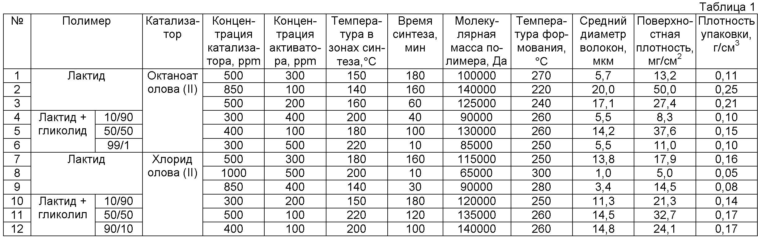 1. Одностадийный способ получения нетканого материала методом электроформования из расплава на основе полилактида, отличающийся тем, что проводят каталитический синтез (со)полилактида в реакционной зоне экструдера, а в качестве исходного мономера используют лактиды или их смеси с гликолидами. 2. Способ по п.1, отличающийся тем, что на выходе из реакционной зоны экструдера вводят капролактам в количестве до 20% по отношению к общей массе расплава. 3. Способ по п.1, отличающийся тем, что в расплав на выходе из реакционной зоны экструдера вводят наночастицы серебра или его соли в количестве до 1% по отношению к общей массе расплава. 4. Способ по п.1, отличающийся тем, что в расплав на выходе из реакционной зоны экструдера вводят гидроксиапатит в количестве до 5% по отношению к общей массе расплава. 5. Нетканый материал, полученный способом по п.1, состоящий из полимерных волокон со средним диаметром от 1 до 20 мкм и характеризующийся поверхностной плотностью 5-50 мг/см2, плотностью упаковки 0,05-0,25 г/см3. 6. Нетканый материал по п.5, отличающийся тем, что он содержит наночастицы серебра в количестве до 1 мас.%. 7. Нетканый материал по п.5, отличающийся тем, что он содержит частицы гидроксиапатита в количестве до 5 мас.%.
