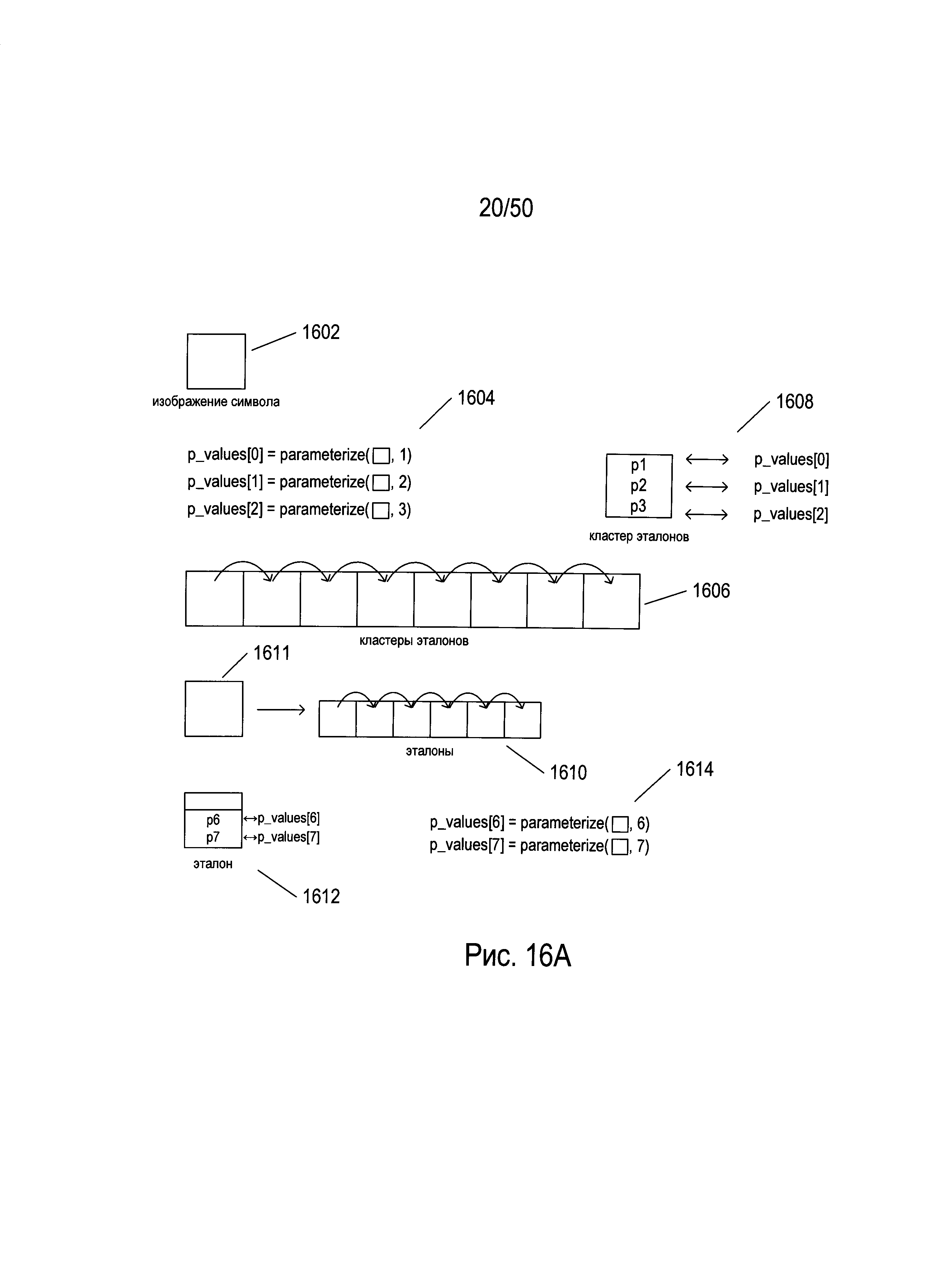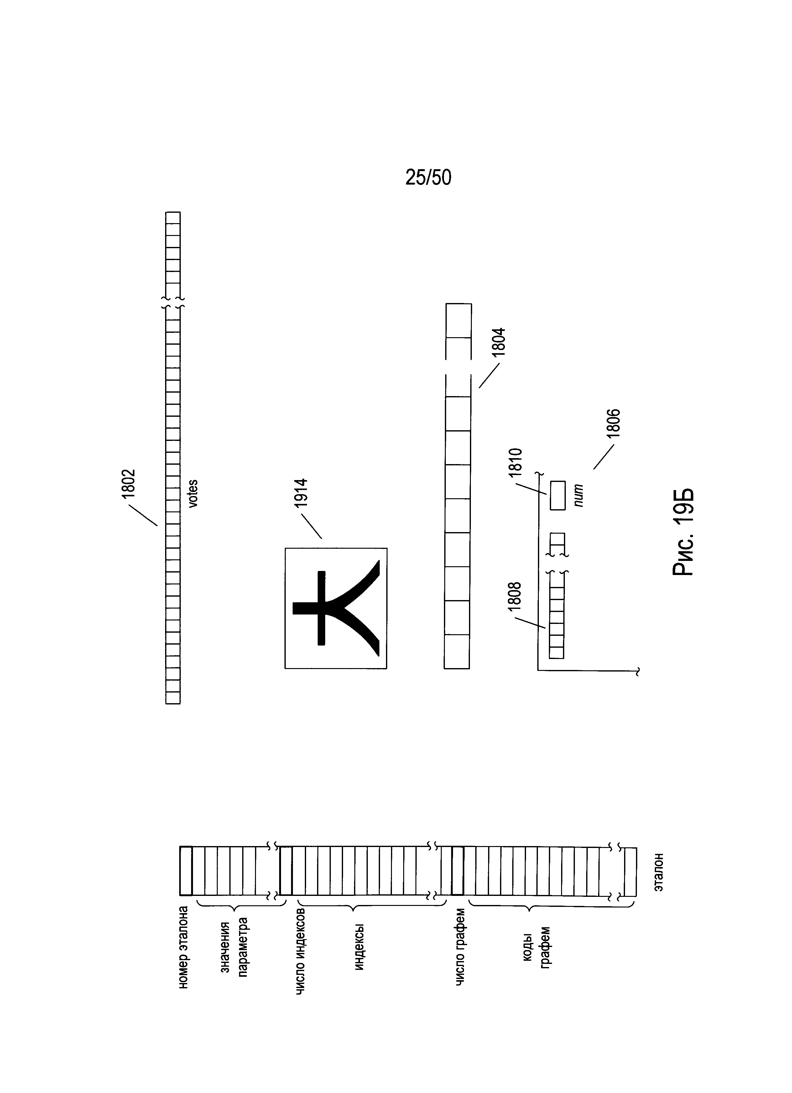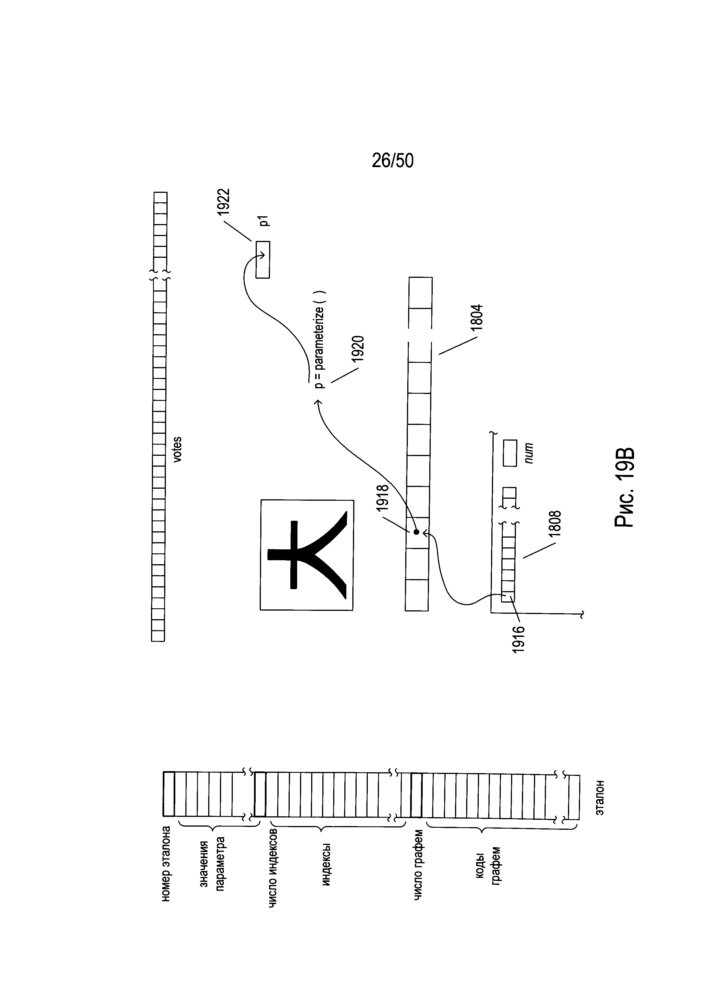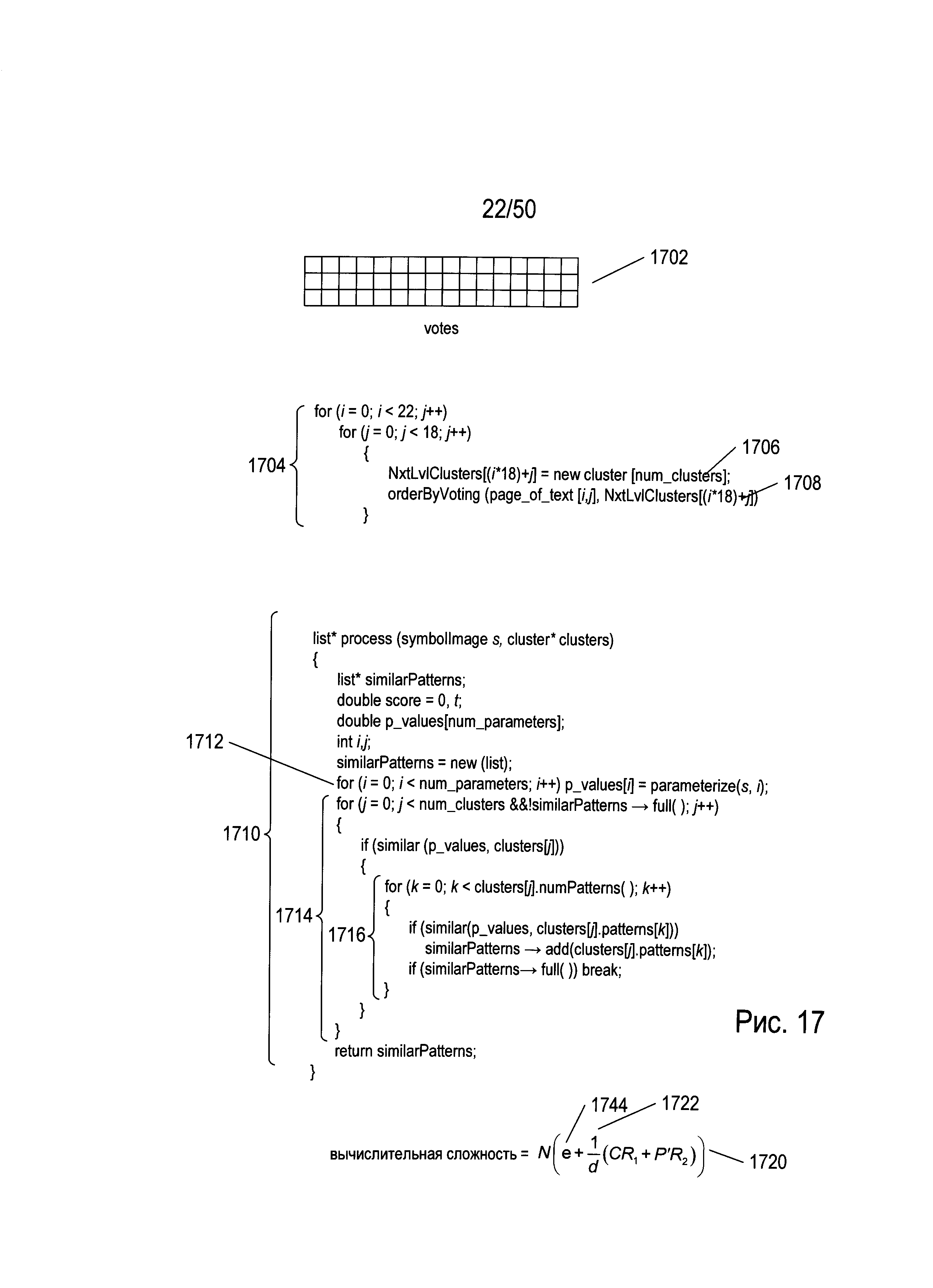 . Существует, конечно, штраф за начальную предварительную обработку, представленный коэффициентом «е» 1744. Однако, как указывалось выше, количество обрабатываемых изображений символов N по существу значительно меньше значения параметров Ρ или Р' для таких языков, как китайский, японский и корейский, и, следовательно, третий вариант осуществления процедуры «process» обеспечивает значительное снижение вычислительной сложности по сравнению как с первым так и со вторым вариантами осуществления, рассмотренными выше. Что более важно, в третьем варианте осуществления подпрограммы «process» гарантируется просмотр всех кластеров, пока не будет обнаружено некоторое максимальное количество потенциально соответствующих символов. Когда порог сходства для кластеров имеет относительно низкое значение, а порог сходства для эталонов имеет относительно высокое значение, существует очень большая вероятность, что список потенциально соответствующих символов, возвращаемый подпрограммой «process», будет включать в себя именно тот символ, который наиболее точно соответствует входному изображению символа.