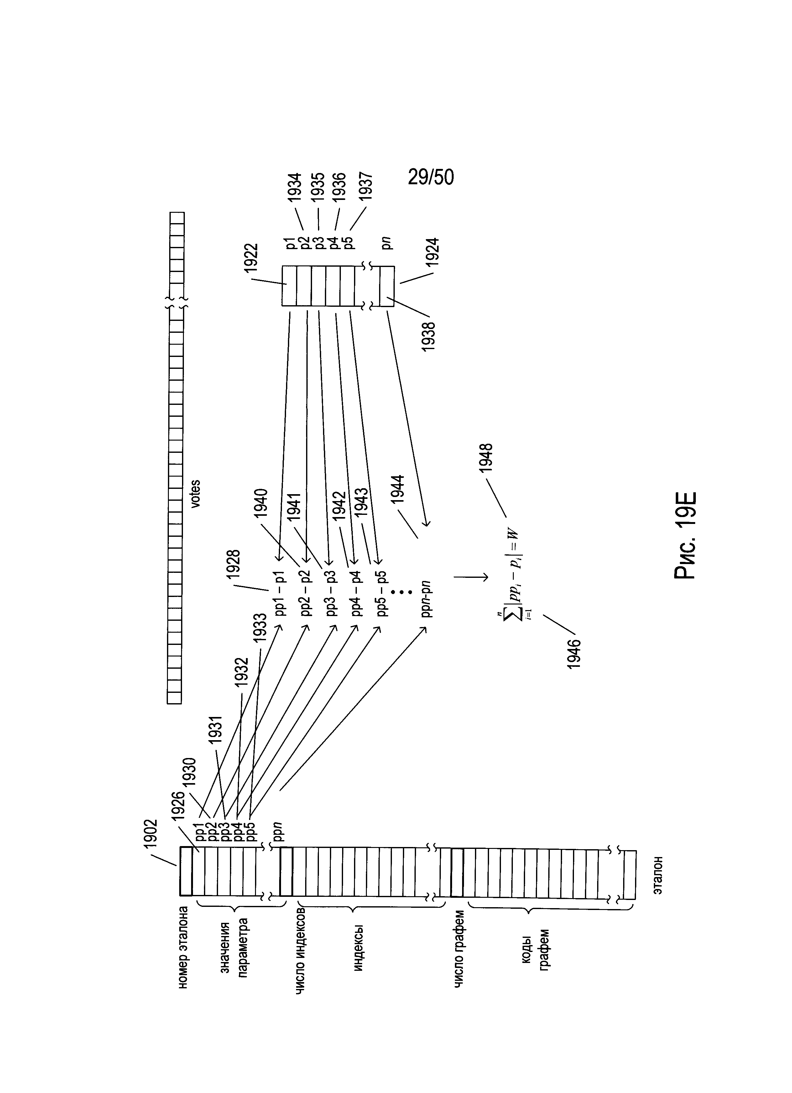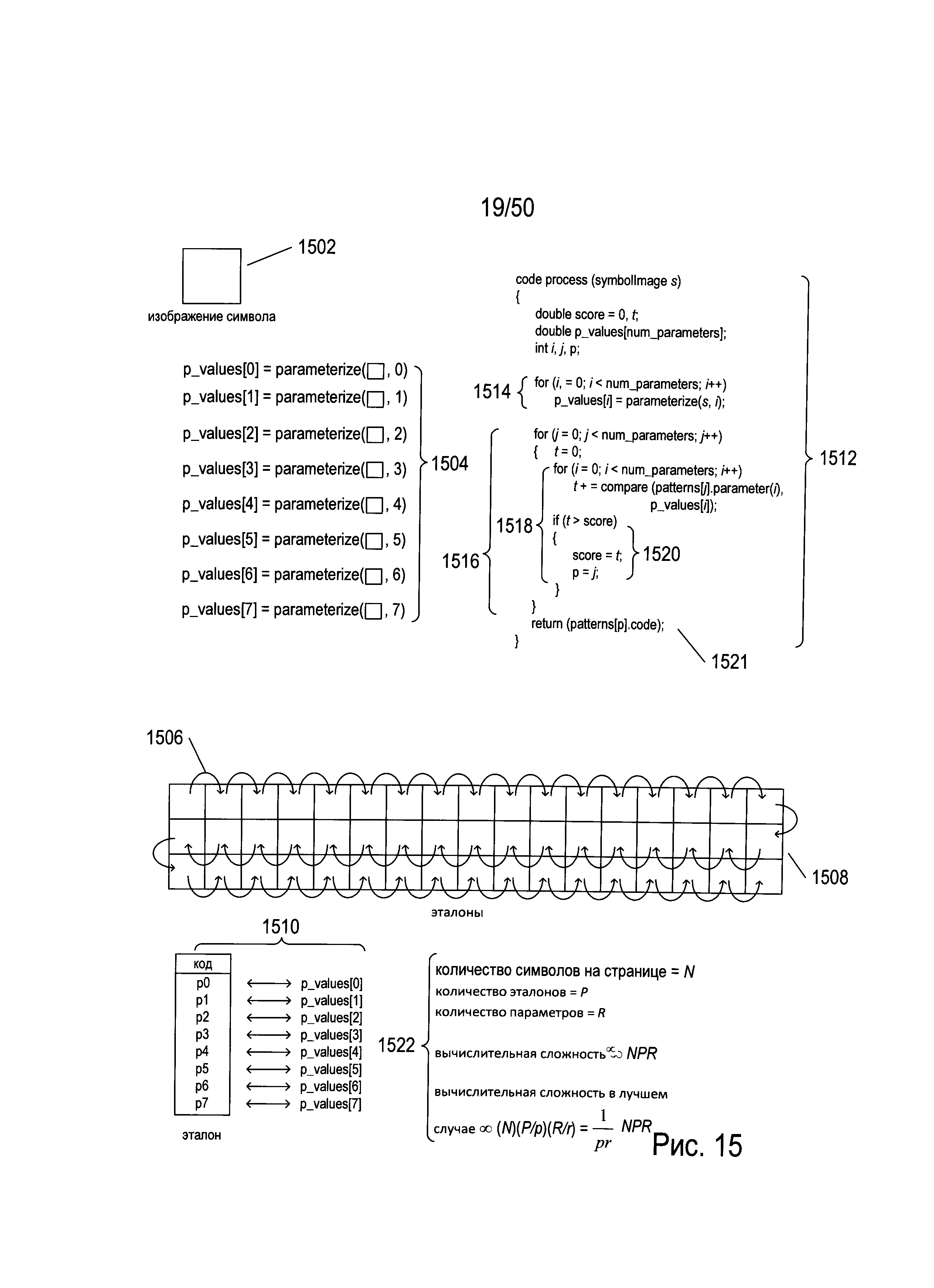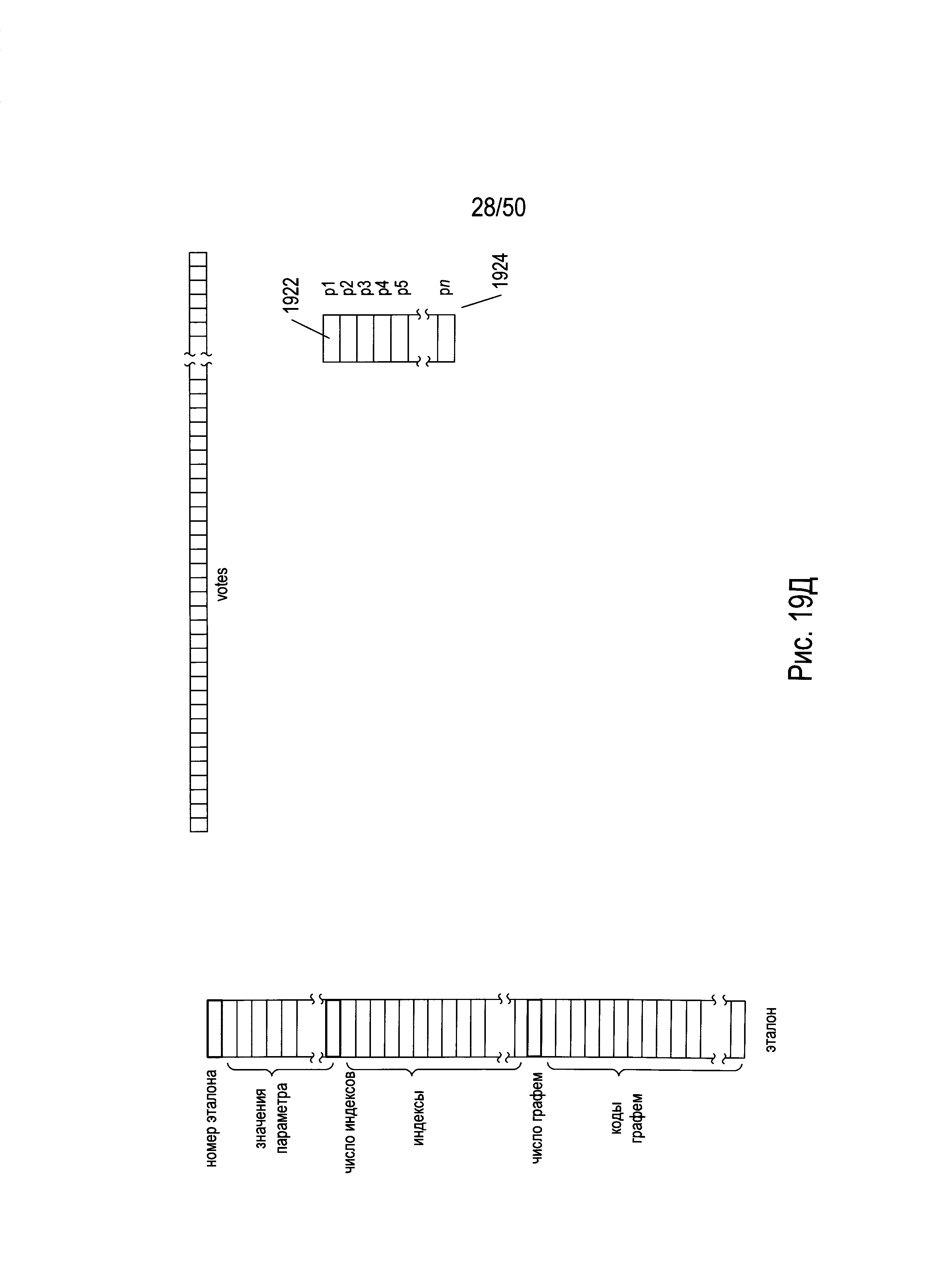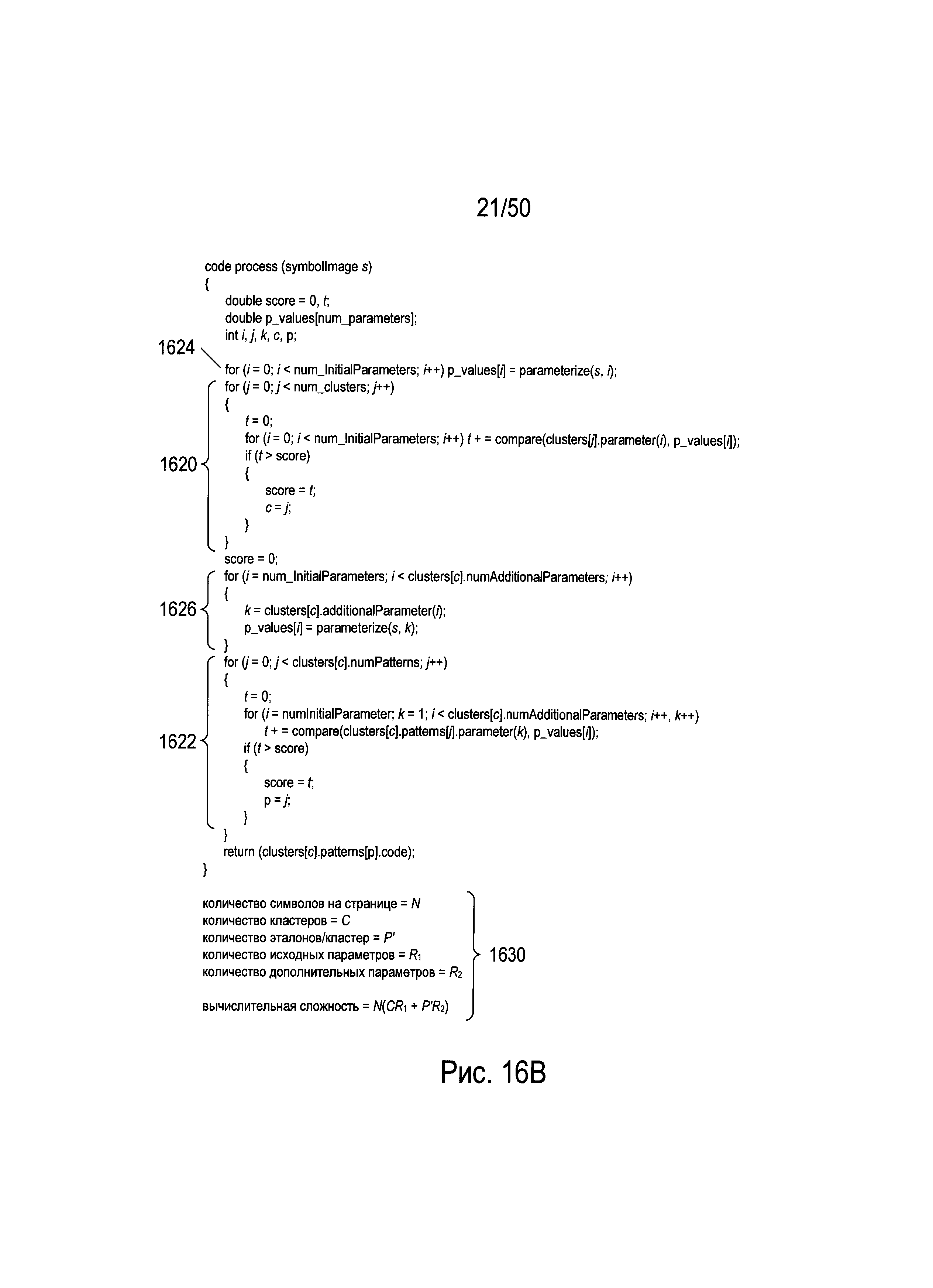 . Существует, конечно, штраф за начальную предварительную обработку, представленный коэффициентом «е» 1744. Однако, как указывалось выше, количество обрабатываемых изображений символов N по существу значительно меньше значения параметров Ρ или Р' для таких языков, как китайский, японский и корейский, и, следовательно, третий вариант осуществления процедуры «process» обеспечивает значительное снижение вычислительной сложности по сравнению как с первым так и со вторым вариантами осуществления, рассмотренными выше. Что более важно, в третьем варианте осуществления подпрограммы «process» гарантируется просмотр всех кластеров, пока не будет обнаружено некоторое максимальное количество потенциально соответствующих символов. Когда порог сходства для кластеров имеет относительно низкое значение, а порог сходства для эталонов имеет относительно высокое значение, существует очень большая вероятность, что список потенциально соответствующих символов, возвращаемый подпрограммой «process», будет включать в себя именно тот символ, который наиболее точно соответствует входному изображению символа.