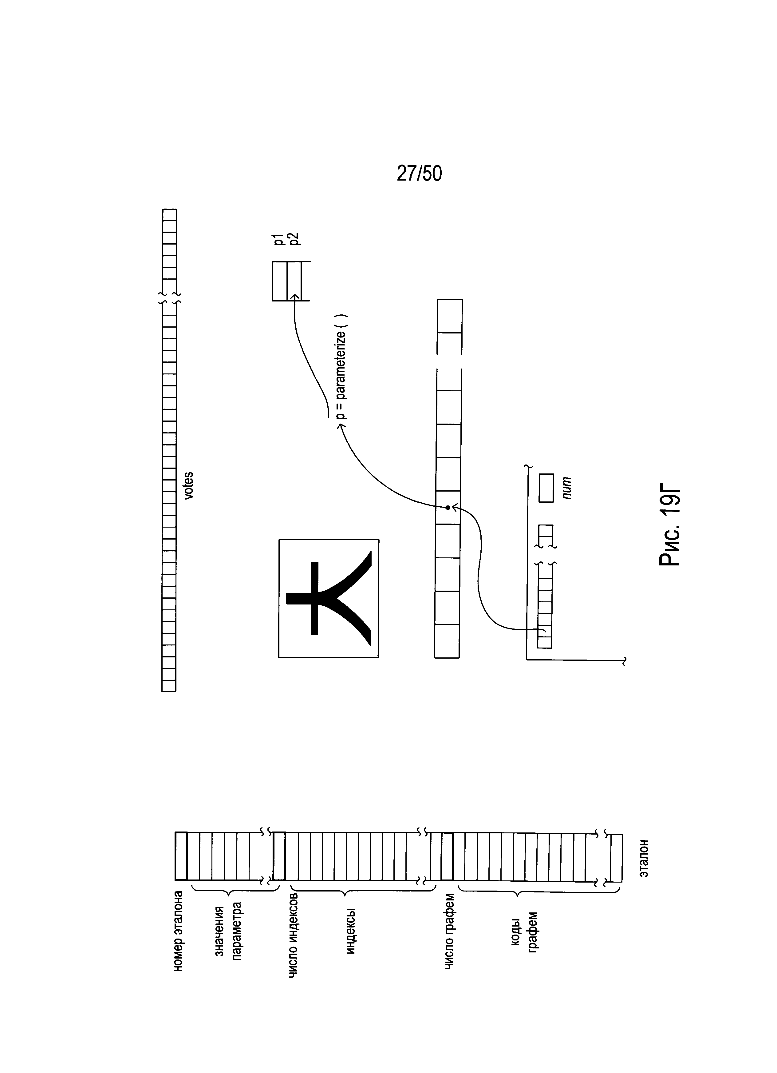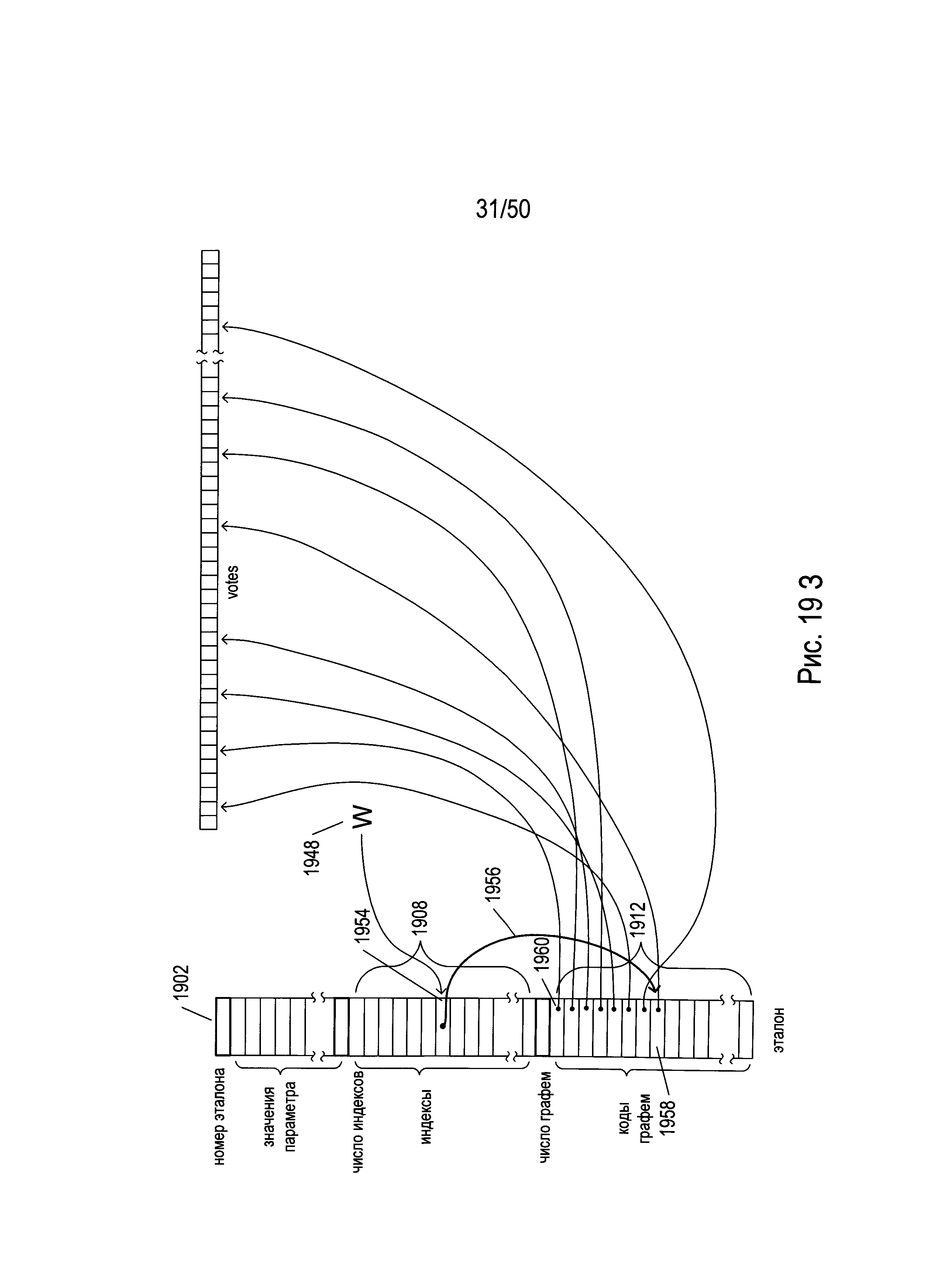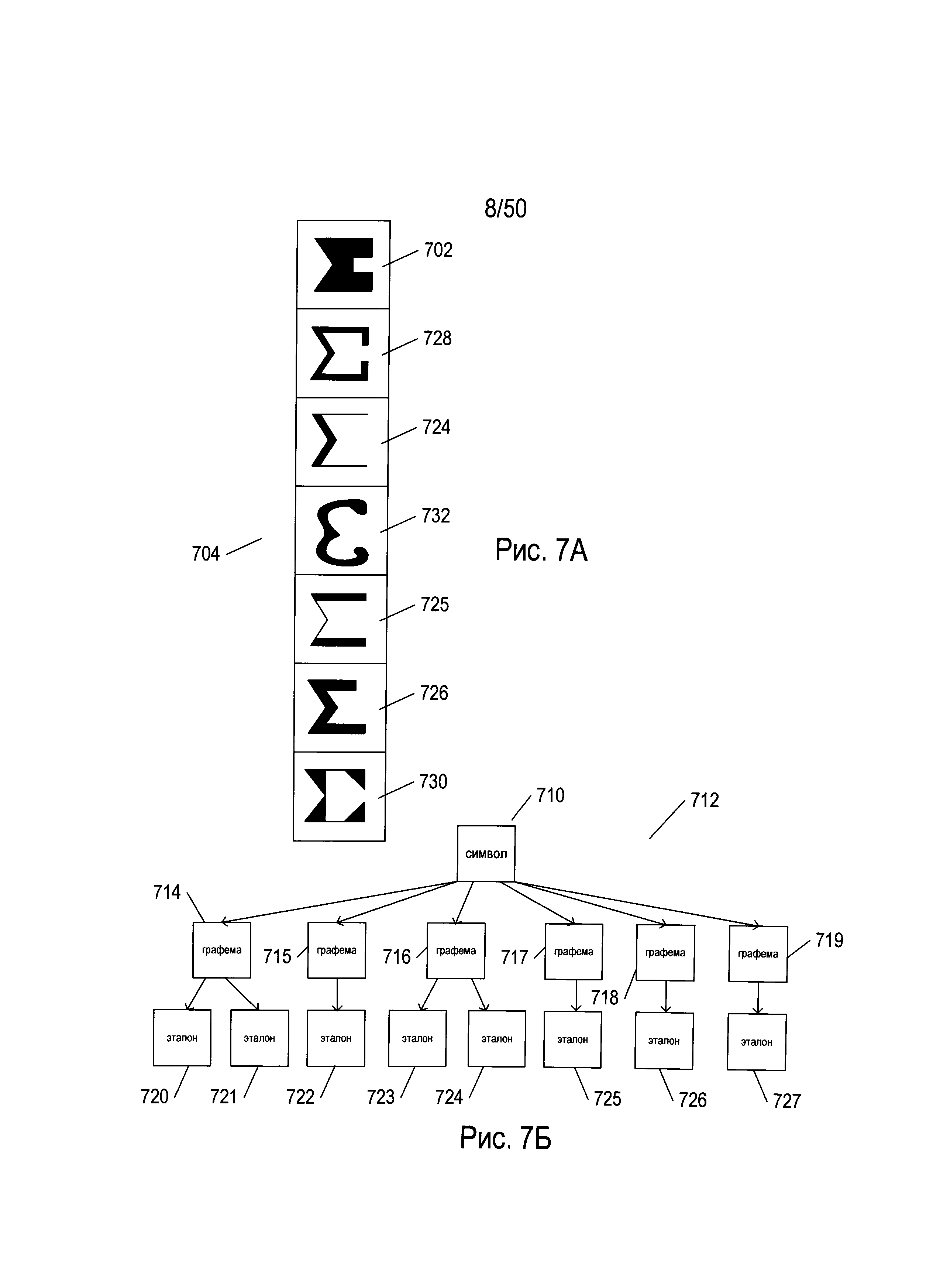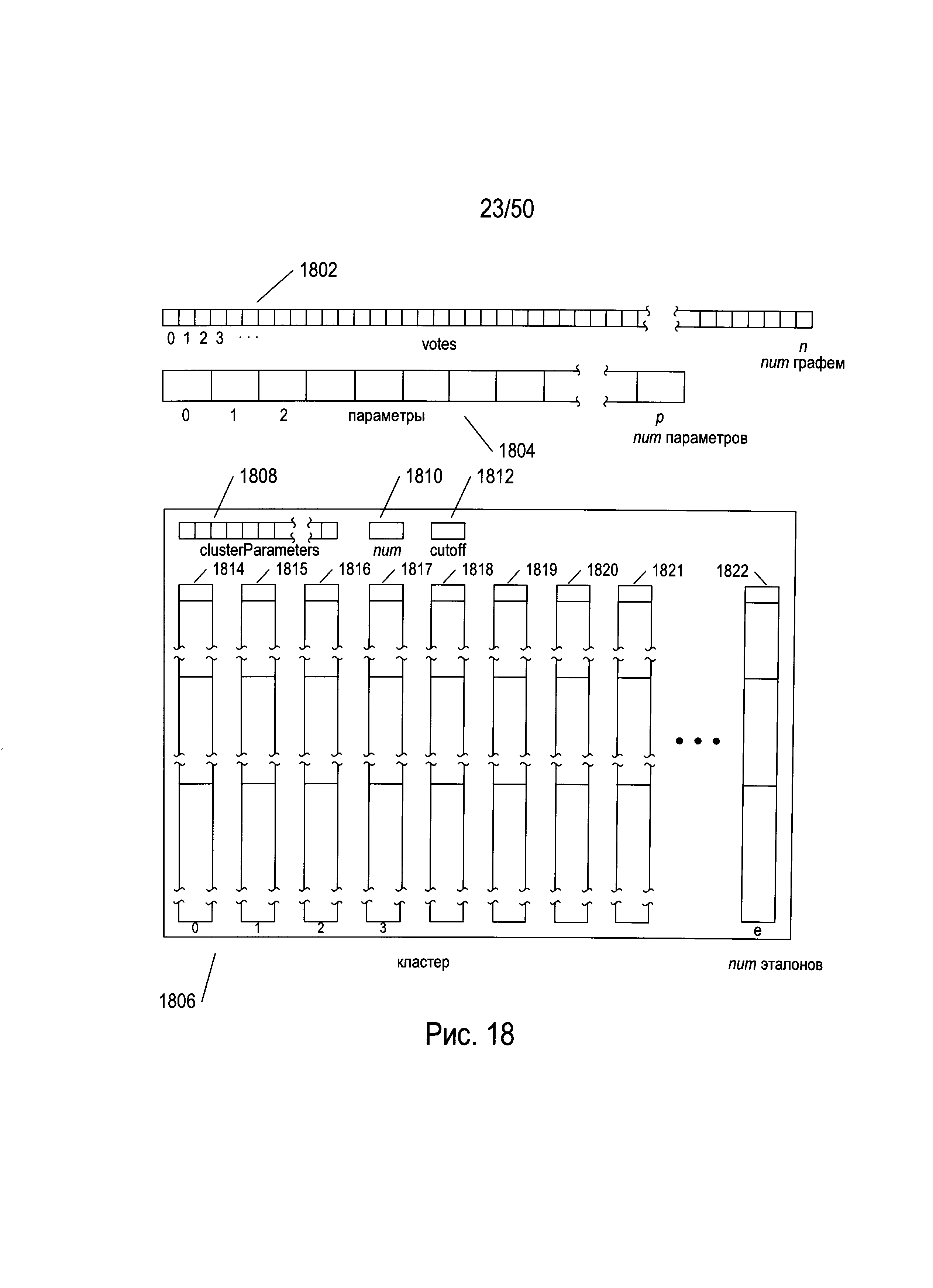 . Существует, конечно, штраф за начальную предварительную обработку, представленный коэффициентом «е» 1744. Однако, как указывалось выше, количество обрабатываемых изображений символов N по существу значительно меньше значения параметров Ρ или Р' для таких языков, как китайский, японский и корейский, и, следовательно, третий вариант осуществления процедуры «process» обеспечивает значительное снижение вычислительной сложности по сравнению как с первым так и со вторым вариантами осуществления, рассмотренными выше. Что более важно, в третьем варианте осуществления подпрограммы «process» гарантируется просмотр всех кластеров, пока не будет обнаружено некоторое максимальное количество потенциально соответствующих символов. Когда порог сходства для кластеров имеет относительно низкое значение, а порог сходства для эталонов имеет относительно высокое значение, существует очень большая вероятность, что список потенциально соответствующих символов, возвращаемый подпрограммой «process», будет включать в себя именно тот символ, который наиболее точно соответствует входному изображению символа.