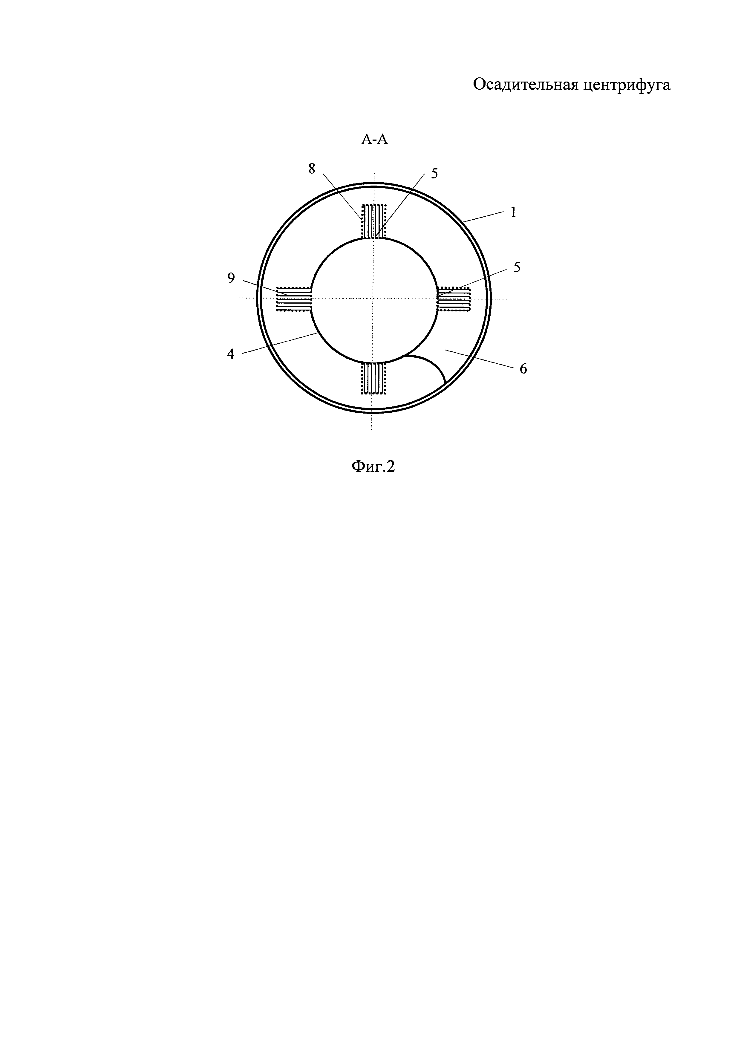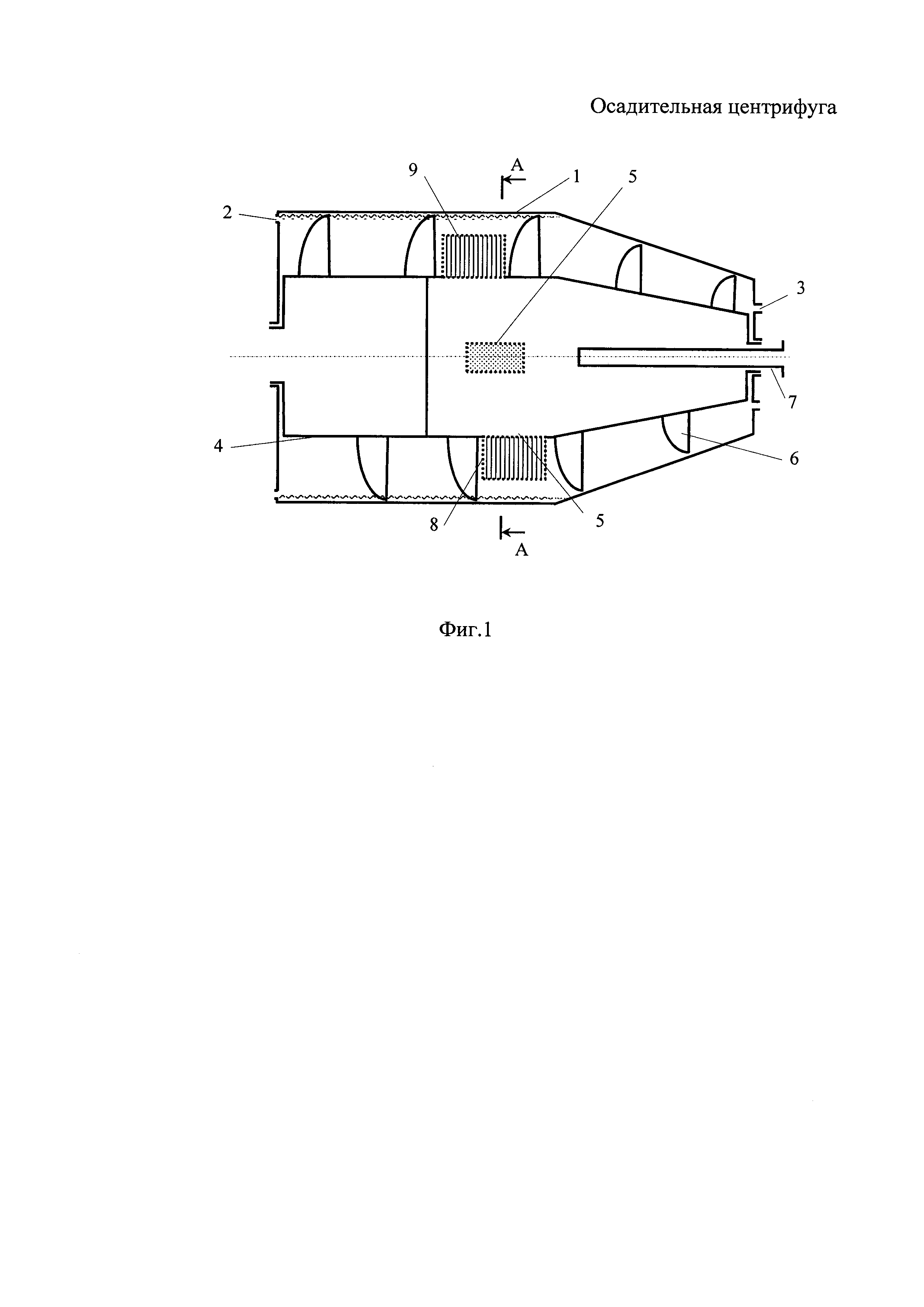 Изобретение относится к оборудованию для разделения суспензий в поле действия центробежных сил и может быть использовано в химической, пищевой, целлюлозно-бумажной и других отраслях промышленности. Преимущественно данное изобретение предназначено для выделения тонкодисперсных волокон целлюлозы из малоконцентрированных сточных вод. Известна шнековая центрифуга, содержащая ротор с окнами для выгрузки осадка и фугата, питающий патрубок и шнек, представляющий собой полый барабан и винтовую направляющую с внутренним каналом, в полости которого установлены перпендикулярно к его стенкам радиальные перегородки для разделения суспензий на несколько потоков, выполненные в виде кривой, полученной аппроксимацией ломаной линии, описываемой математической зависимостью, см. RU Патент №2258565, МПК В04В 11/02 (2000.01), 2005. Недостатком шнековой центрифуги является низкая степень разделения исходной суспензии на жидкую и твердую фазы при незначительном содержании мелковолокнистых отходов в дисперсионной среде. Указанный недостаток обусловлен взмучиванием волокнистой массы в потоке жидкости при взаимодействии с радиальными перегородками. Известна также осадительная центрифуга, содержащая цилиндроконический ротор с окнами для вывода фугата и осадка, имеющий зоны осаждения и осушки, размещенный внутри ротора шнек для транспортировки осадка, питающую трубу для подвода исходной суспензии, камеру для предварительного разделения суспензии с отверстиями для отвода сгущенной и осветленной фракций, сообщенную с питающей трубой и расположенную внутри барабана шнека так, что отверстие для отвода сгущенной фракции расположено у большего основания конусообразной части ротора, а отверстие для отвода осветленной фракции - у меньшего основания перед зоной осушки, см. RU Патент №1446740, МПК В04В 1/20 (1990.01), В04В 5/10 (1990.01), 1994. Недостатком известного изобретения является низкая степень разделения суспензии на фугат и осадок. Указанный недостаток обусловлен неэффективным предварительным разделением суспензий, содержащих высокодисперсную твердую фазу, состоящую из волокон со значительным разбросом размеров. Наиболее близкой по технической сущности является осадительная центрифуга, включающая цилиндроконический ротор с окнами для отвода разделенных фаз, установленный внутри ротора с кольцевым зазором шнек, состоящий из цилиндроконического барабана с отверстиями для прохода исходной суспензии и закрепленных на нем витков, раскручивающее устройство, установленное внутри барабана шнека, и питающую трубу, установленную коаксиально барабану и сообщенную с раскручивающим устройством, вокруг которого установлена перфорированная цилиндрическая обечайка, образующая с перфорированным участком барабана шнека камеру, при этом последняя заполнена шарами, расположенными по концентрическим окружностям в несколько рядов, см. RU Патент №1464354, МПК В04В 1/20 (1990.01), В04В 11/02 (1990.01), 1994. Недостатком данного технического решения является недостаточная эффективность процесса разделения малоконцентрированной высокодисперсной суспензии на жидкую и твердую фазы. Указанный недостаток обусловлен перемешиванием высокодисперсной суспензии при обтекании шаров, расположенных на малом радиусе вращения, в раскручивающем устройстве перед выходом на разделение. Задач