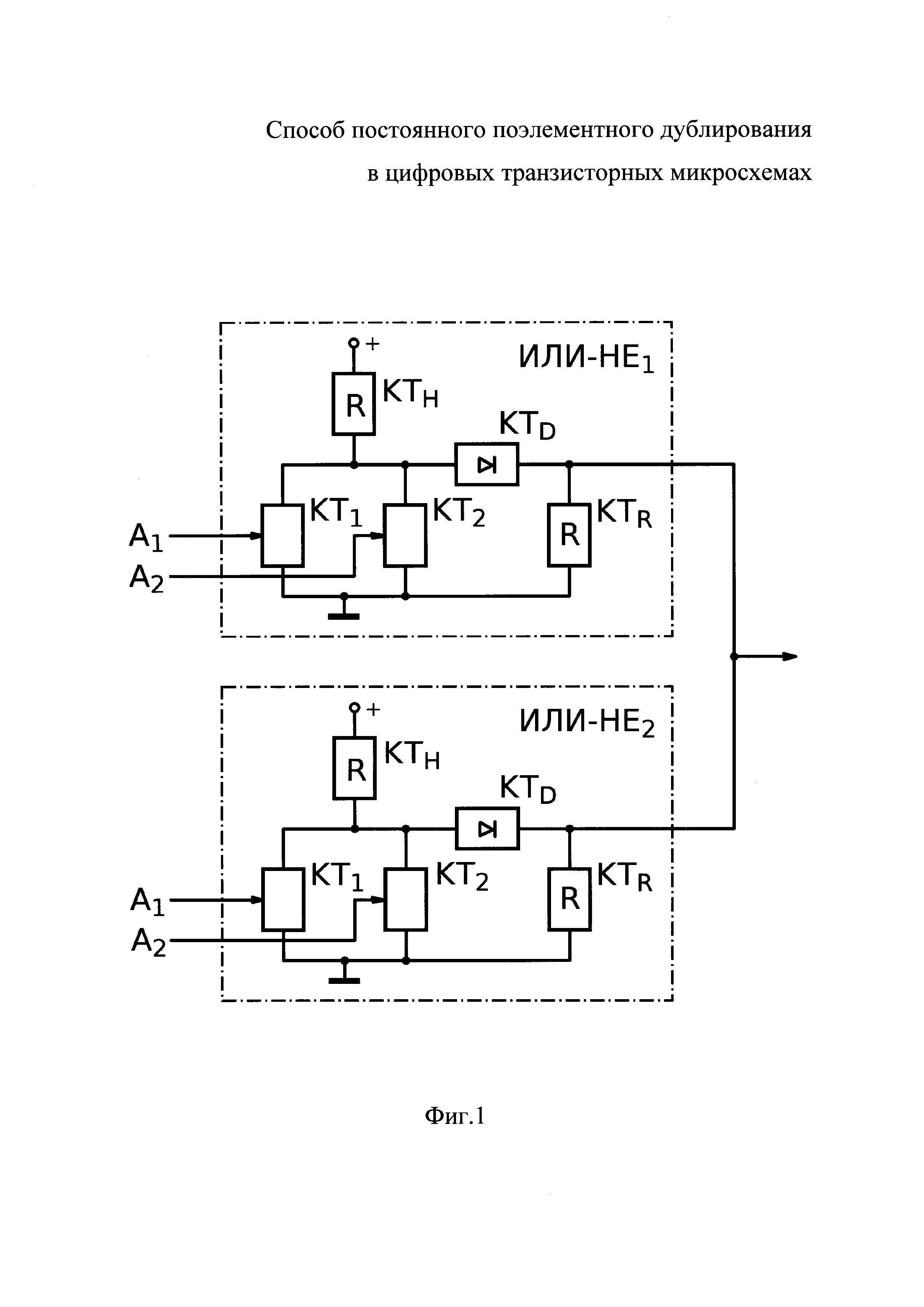 1. Способ постоянного поэлементного дублирования в цифровых транзисторных микросхемах, при котором для каждого транзисторного логического элемента устанавливают идентичный ему дублирующий логический элемент, объединяют одноименные входы дублирующих друг друга логических элементов, в качестве дублирующих элементов используют логические элементы, не имеющие памяти, располагают дублирующие друг друга логические элементы на расстоянии между ними, превышающем размер области повреждения микросхемы от одной частицы излучения, попадающей в нее, и объединяют одноименные выходы дублирующих друг друга логических логических элементов, образуя пары дублирующих друг друга элементов, каждая из которых представляет дублированный логический элемент, отличающийся тем, что каждый входящий в дублирующие логические элементы транзистор выполняют в виде квадрированного транзистора, представляющего четверку соединенных между собой параллельно и последовательно одиночных транзисторов, объединенные входы которых являются входом квадрированного транзистора, а объединенные одноименные свободные выходы одиночных транзисторов являются выходами квадрированного транзистора. 2. Способ по п. 1, отличающийся тем, что квадрированный транзистор выполняют в виде двух последовательно соединенных каскадов, каждый из которых состоит из параллельно соединенных между собой двух одиночных транзисторов. 3. Способ по п. 1, отличающийся тем, что квадрированный транзистор выполняют в виде двух параллельных цепочек последовательно соединенных между собой двух одиночных транзисторов.