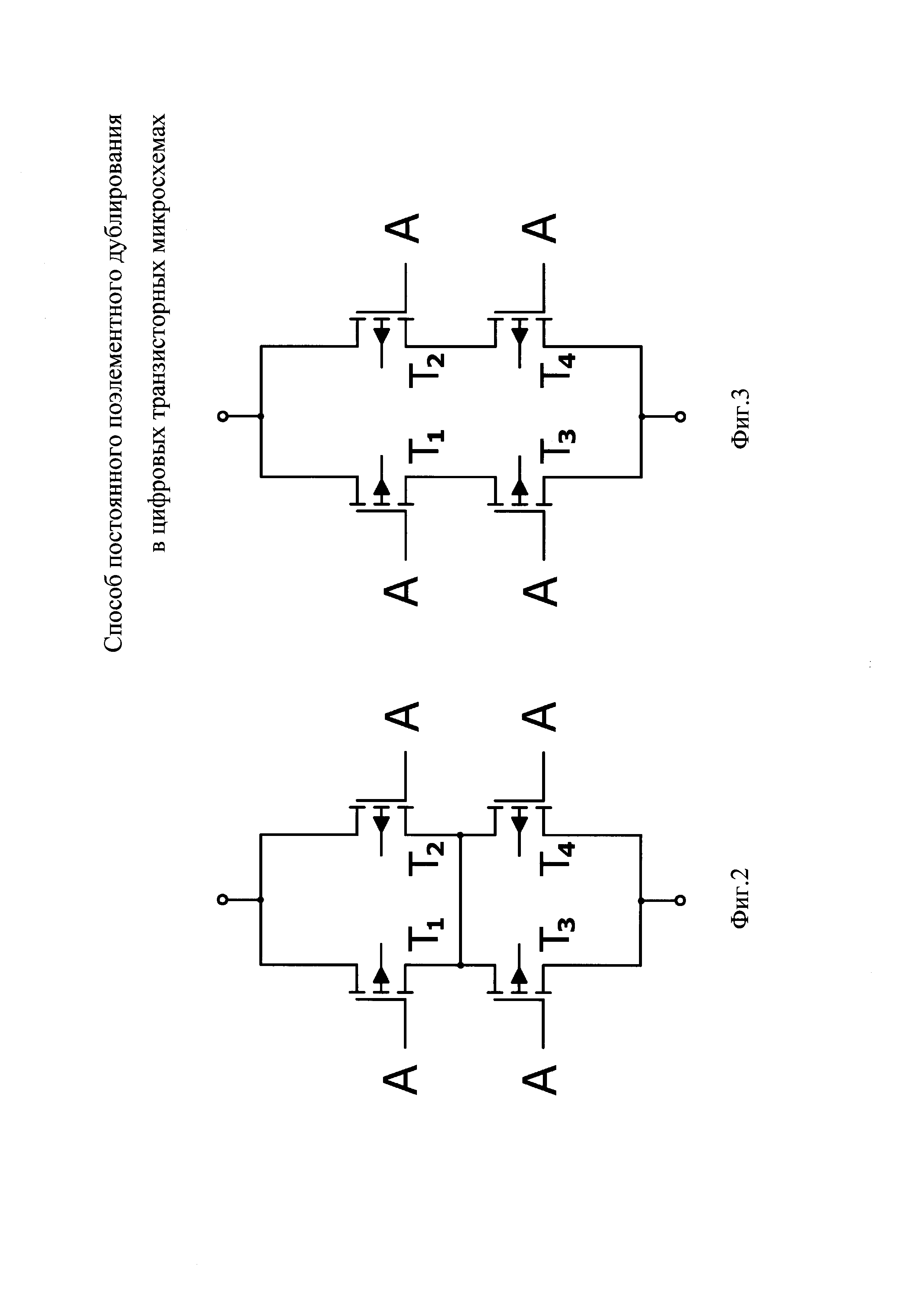 Изобретение относится к способам поэлементного дублирования в нано- и микроцифровых транзисторных микросхемах, подвергающихся воздействию радиации. Технический результат: существенное повышение отказоустойчивости микросхем по сравнению со способом дублирования без использования четырехкратного резервирования одиночных транзисторов. В предлагаемом способе для каждого транзисторного логического элемента устанавливают идентичный ему дублирующий логический элемент, в качестве дублирующих элементов используют логические элементы, не имеющие памяти, располагают дублирующие друг друга логические элементы на расстоянии между ними, превышающем размер области повреждения микросхемы от одной частицы излучения. Каждый входящий в дублирующие логические элементы транзистор выполняют в виде квадрированного транзистора, представляющего четверку соединенных между собой параллельно и последовательно одиночных транзисторов. 2 з.п. ф-лы, 3 ил.