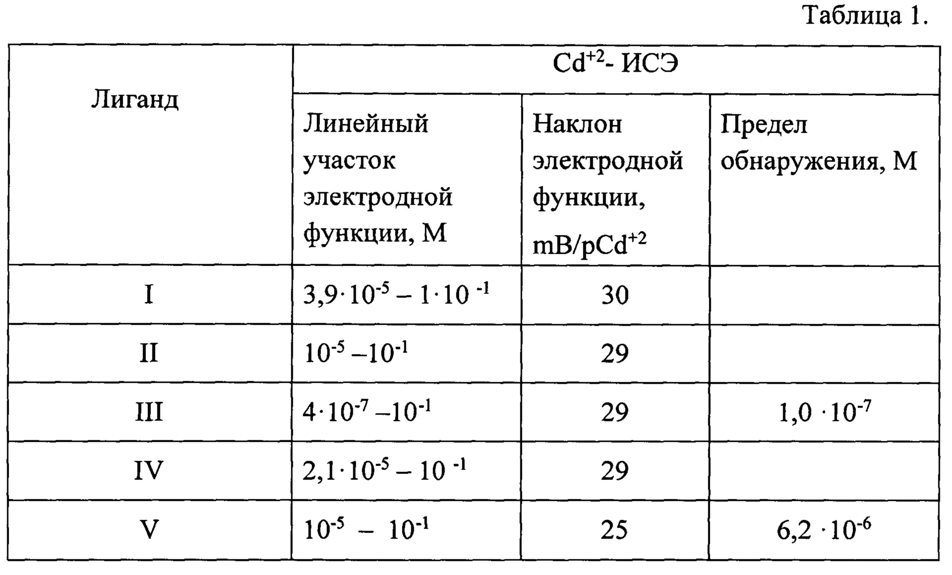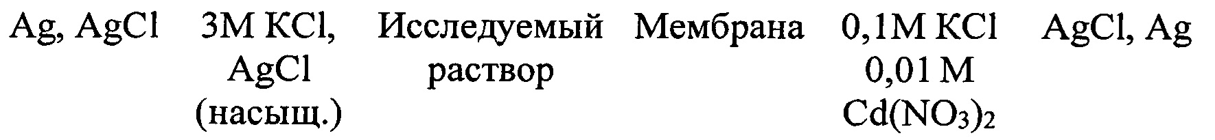 Lindner, RECOMMENDATION FOR NOMENCLATURE OF ION-SELECTIVE ELECTRODES (UPAC Recommendations 1994) // Pure and Apple. Chem. Vol. 66, No 12, pp 2527-2536, 1994]. Для получения электродных характеристик использовали калибровочные растворы Сd(NO3)2 с концентрацией 1⋅10-7 - 1⋅10-1 М, которые готовили методом последовательного разбавления исходного раствора 0,1М Сd(NO3)2 непосредственно перед измерением.