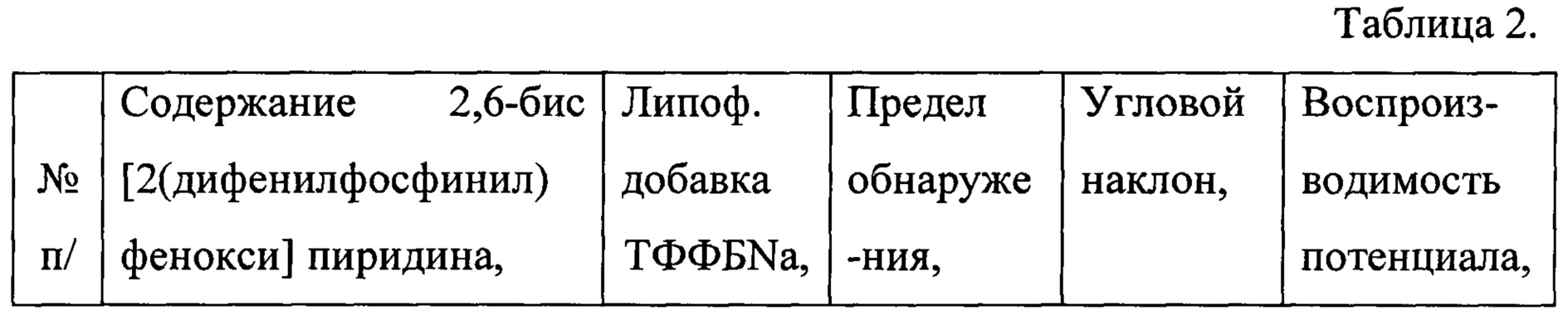 Изобретение относится к области ионометрии, а именно к разработке ионоселективных электродов с мембранами на основе полимерных супрамолекулярных систем. Предлагаемое изобретение предназначено для прямого потенциометрического определения активности катионов кадмия в водных растворах и может быть использовано при экологическом мониторинге сточных вод, в технологических и биологических растворах. Предложена мембрана ионоселективного электрода для определения ионов кадмия, которая содержит полимерную матрицу, пластификатор, липофильную добавку и активный компонент, в которой в качестве полимерной матрицы используется поливинилхлорид, а в качестве пластификатора используется дибутилфталат. В качестве электродоактивного компонента используется фосфорилсодержащий поданд 2,6-бис[2-(дифенилфосфинил)фенокси] пиридин, а в качестве липофильной добавки - дигидрат тетракис(4-фторфенил)борат натрия при следующих соотношениях мембранных компонентов, мас.%:Изобретение позволяет улучшить предел обнаружения ионов кадмия до 2,1⋅10М в водных растворах, а также увеличить избирательность определения кадмия в присутствии меди, цинка, свинца, а также многих щелочных и щелочноземельных металлов. 1 пр., 3 табл.