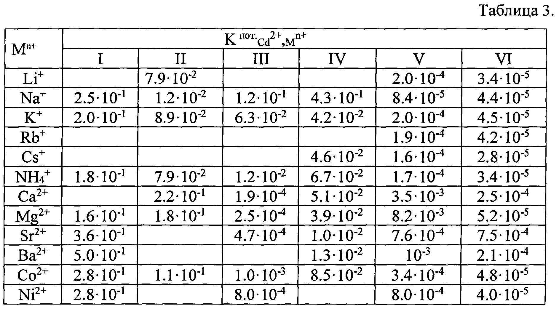 приведены в таблице 3 «Коэффициенты потенциометрической селективности