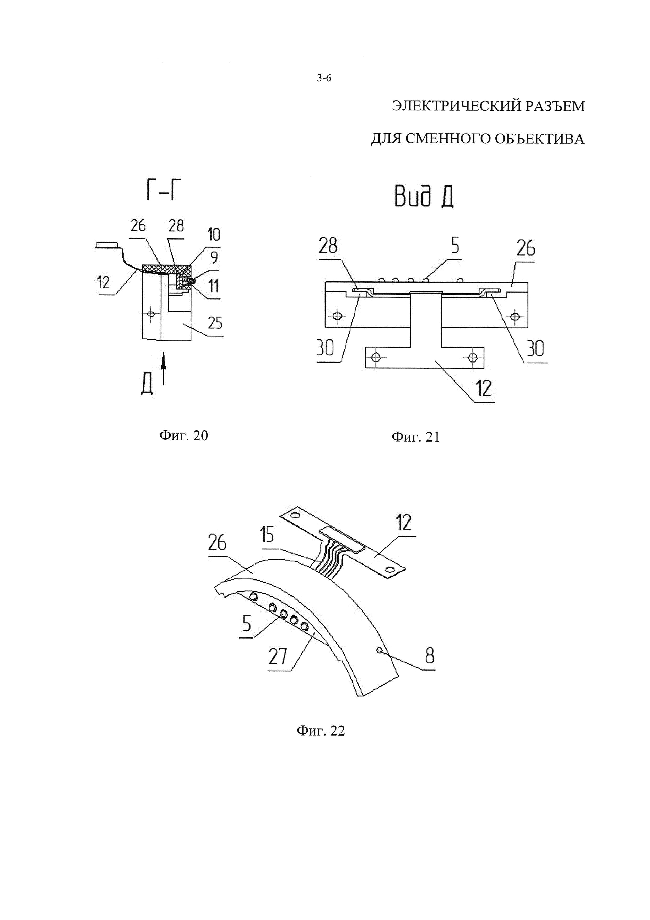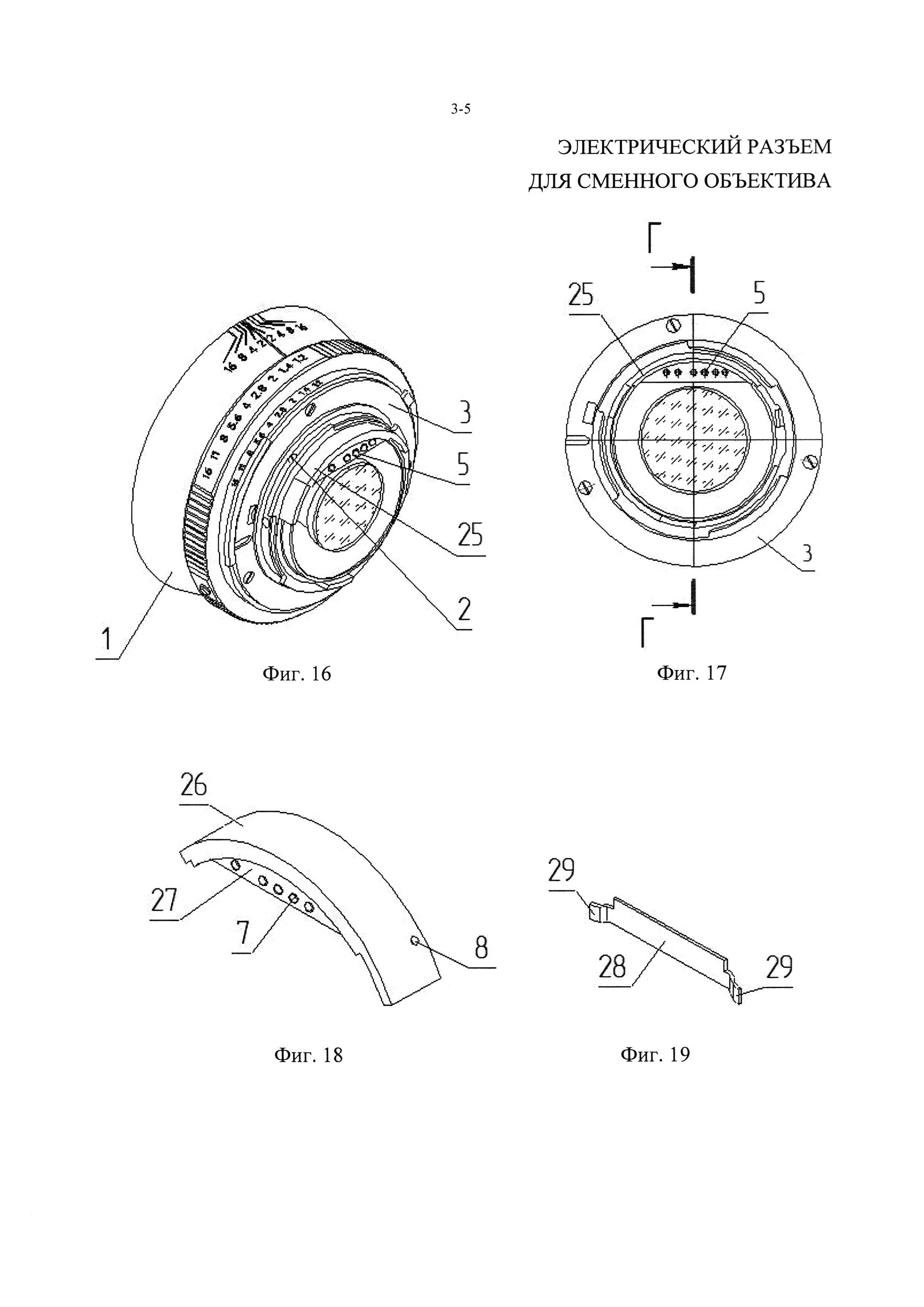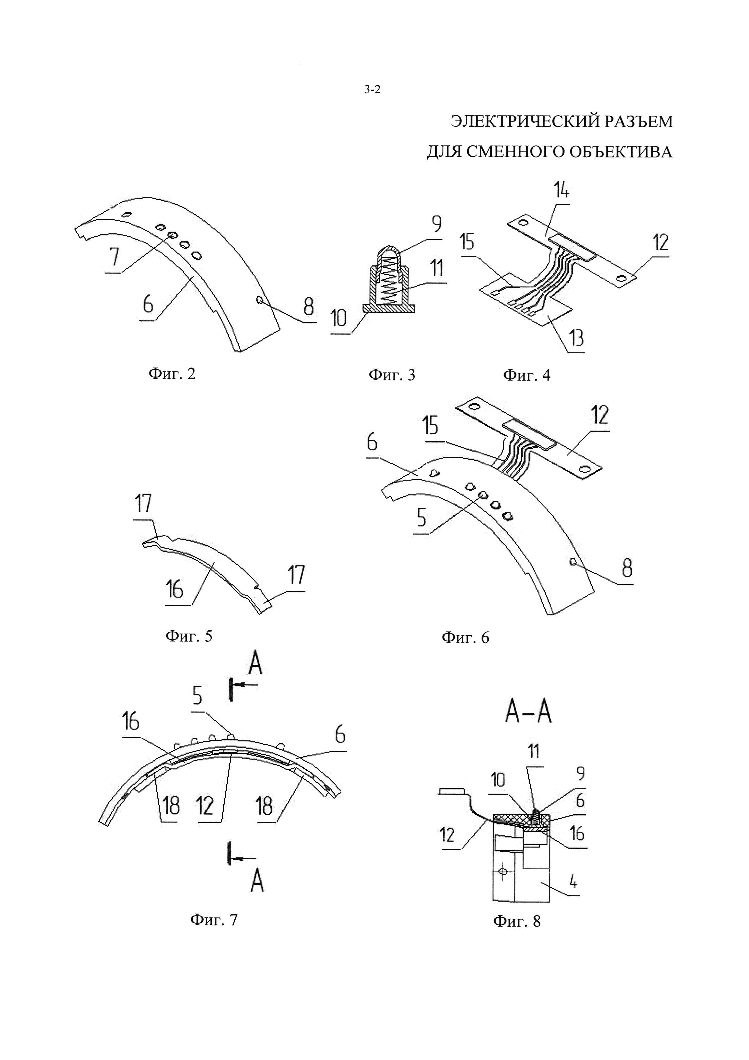 Изобретение относится к фотоаппаратам со сменными объективами для подключения электрооборудования, электрических устройств к корпусу фотоаппарата. Электрический разъем для сменного объектива содержит корпусную часть, выполненную с отверстиями для установки контактных элементов, причем контактные элементы установлены с возможностью выступа из отверстий корпусной части электрического разъема, гибкую печатную плату с токопроводящим рисунком с контактными площадками, совпадающими по расположению с отверстиями в корпусной части и контактирующими с контактными элементами, при этом контактные элементы подпружинены упругими элементами, а электрический разъем снабжен крышкой, прижимающей гибкую печатную плату и контактные элементы к корпусной части электрического разъема, контактные элементы выполнены в виде верхних и нижних втулок с размещенными между ними упругими элементами, крышка выполнена в виде опорной пластины, входящей в зацепление с корпусной частью электрического разъема. Технический результат - упрощение сборки и повышение надежности конструкции при сохранении стабильного электрического соединения, не оказывающего повреждений токопроводящего рисунка гибкой печатной платы. 4 з.п. ф-лы, 25 ил.