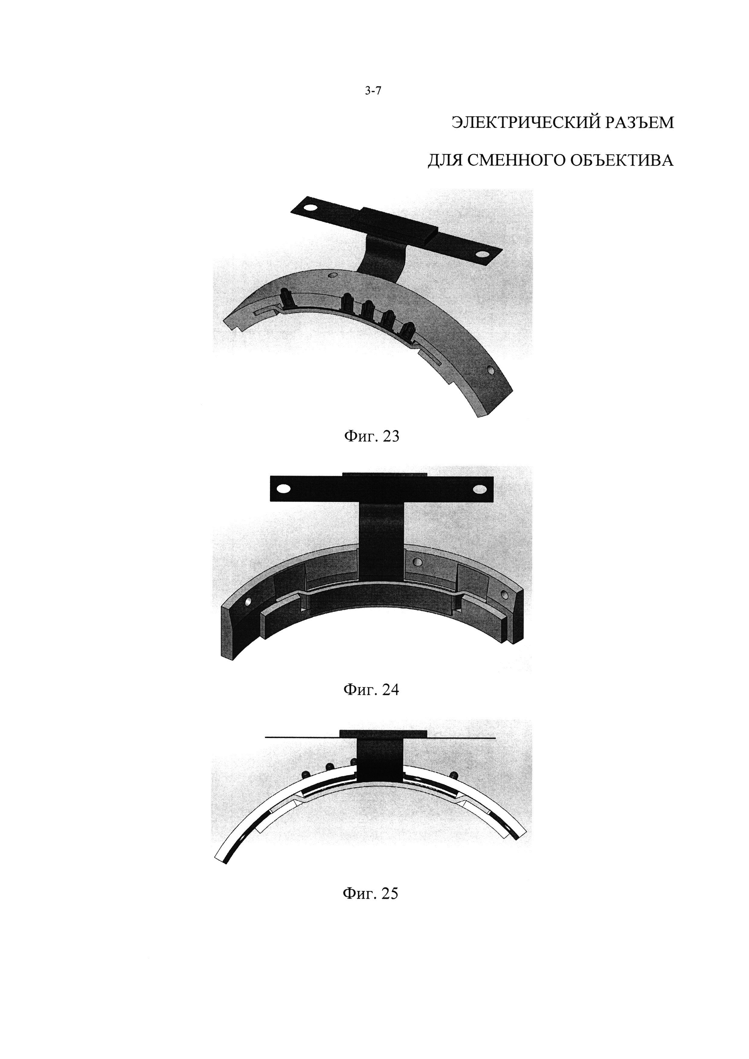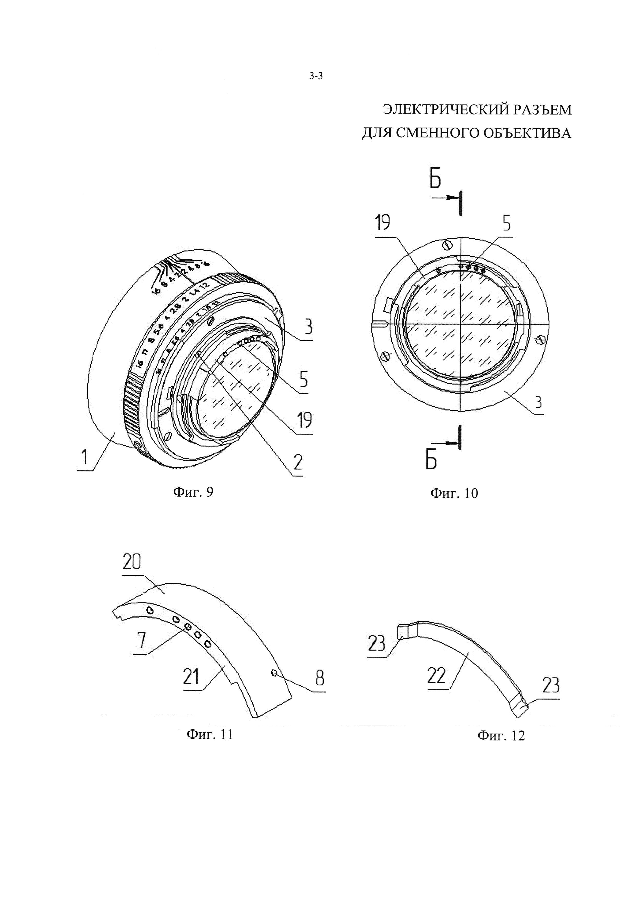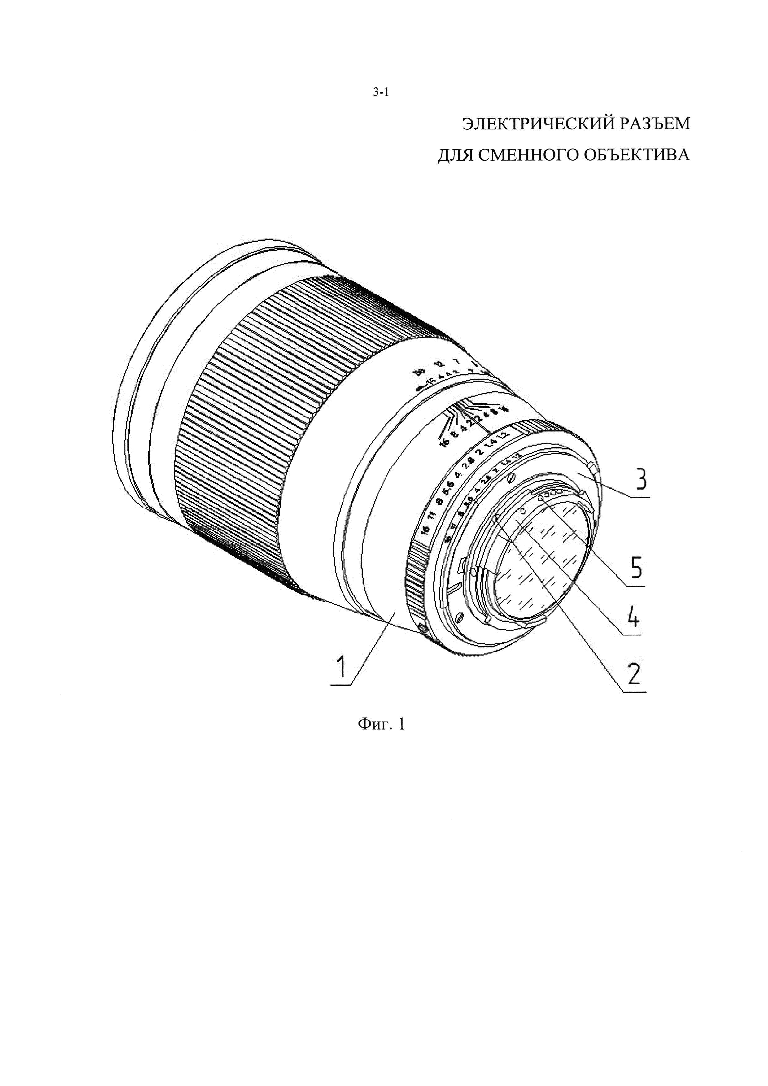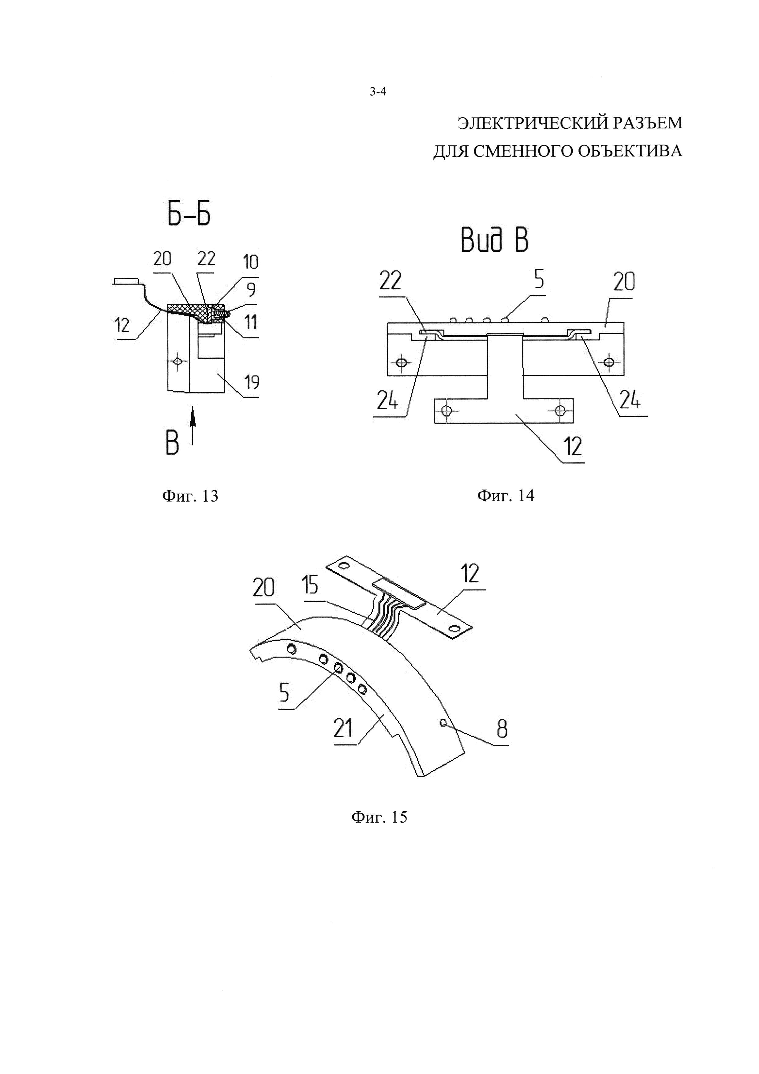 Изобретение относится к фотоаппаратам со сменными объективами для подключения электрооборудования, электрических устройств к корпусу фотоаппарата. Электрический разъем для сменного объектива содержит корпусную часть, выполненную с отверстиями для установки контактных элементов, причем контактные элементы установлены с возможностью выступа из отверстий корпусной части электрического разъема, гибкую печатную плату с токопроводящим рисунком с контактными площадками, совпадающими по расположению с отверстиями в корпусной части и контактирующими с контактными элементами, при этом контактные элементы подпружинены упругими элементами, а электрический разъем снабжен крышкой, прижимающей гибкую печатную плату и контактные элементы к корпусной части электрического разъема, контактные элементы выполнены в виде верхних и нижних втулок с размещенными между ними упругими элементами, крышка выполнена в виде опорной пластины, входящей в зацепление с корпусной частью электрического разъема. Технический результат - упрощение сборки и повышение надежности конструкции при сохранении стабильного электрического соединения, не оказывающего повреждений токопроводящего рисунка гибкой печатной платы. 4 з.п. ф-лы, 25 ил.