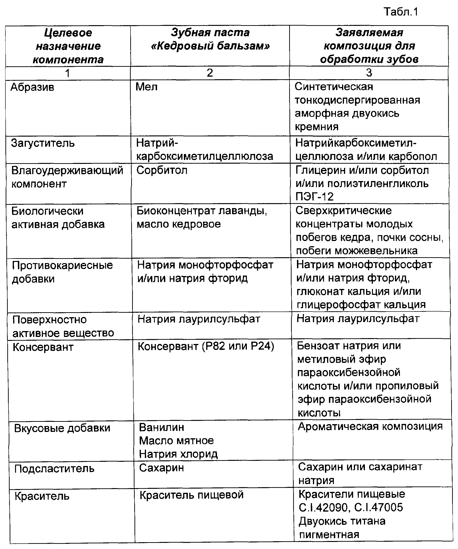 натрия [6], биоконцентрат из хвои [7] и другие. Наиболее близкой по составу является зубная паста "Кедровый бальзам", содержащая масло кедра и биоконцентрат лаванды, выпускаемая ЗАО