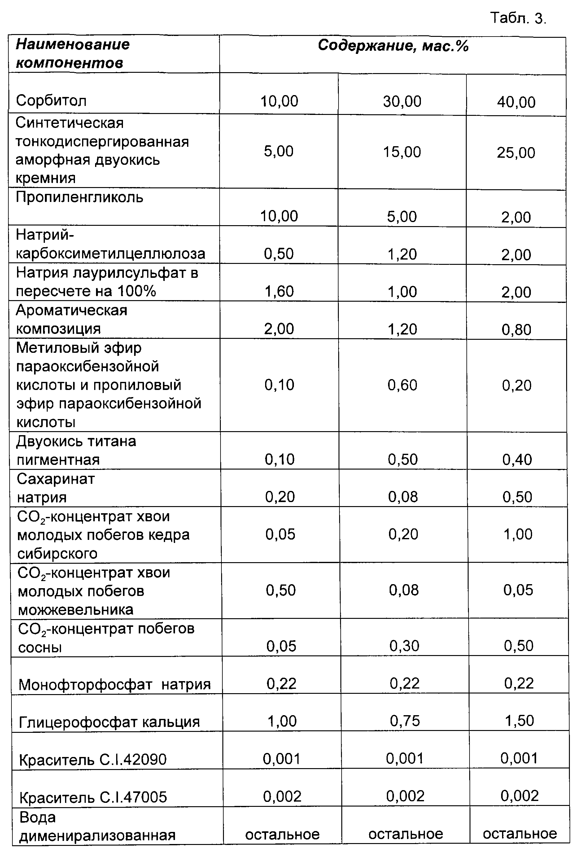 Сверхкритический углекислотный СК-СО2-концентрат молодых побегов можжевельника 0,05-0,50 Сверхкритический углекислотный СК-СО2-концентрат почек сосны 0,05-0,50 Глюконат кальция или глицерофосфат кальция 0,75-1,50 Фторид натрия или монофторфосфат натрия 0,22 Красители 0,001-0,002