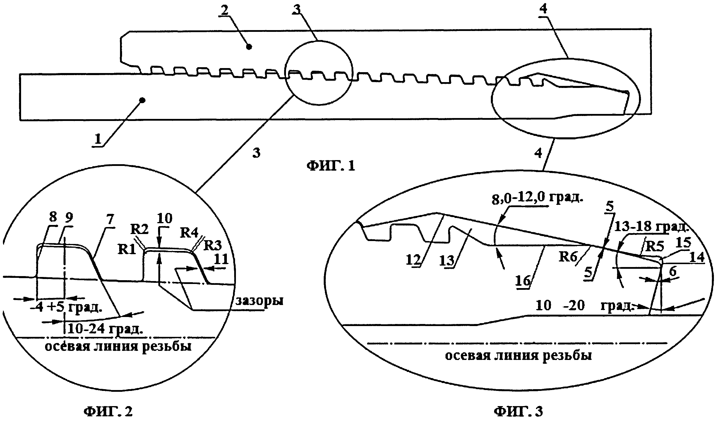 Изобретение относится к области нефте - и газодобычи. Соединение содержит охватываемый и охватывающий элементы, на концах которых выполнены упорные конические трапецеидальные резьбы и конические уплотнительные и упорные торцевые поверхности. Угол наклона опорной грани профиля витка резьбы составляет от -4 до +5°, угол наклона закладной грани 10-24°, конусность резьбы 1:16. Вершины и закладные грани профиля витка резьбы при свинчивании соединения образуют между собой зазоры шириной 0,05-0,15 мм. Профиль витка резьб охватываемого и охватывающего элементов на участке схождения опорной грани и вершины и на участке схождения закладной грани и вершины выполнен скругленным. При этом радиусы округлений различны для охватываемого и охватывающего элементов. Упорные торцевые поверхности имеют угол наклона 10-20° к нормали осевой линии резьбы. Угол наклона уплотнительной поверхности охватываемого элемента составляет 13-18° к нормали осевой линии резьбы. Угол наклона уплотнительной поверхности охватывающего элемента 8-12°. На охватывающем элементе на участке схода резьбы выполнена окружная проточка (12), образующая полость, охватывающую первые полтора витка резьбы на охватываемом элементе. На участке схождения уплотнительной поверхности и упорной торцевой поверхности охватывающего элемента выполнена окружная проточка (14). Участок схождения уплотнительной поверхности и поверхности окружной проточки (14) охватывающего элемента и участок схождения уплотнительной поверхности и поверхности схода резьбы охватываемого элемента выполнены скругленными. Достигается высокая герметичность соединения при воздействии значительных механических нагрузок, его износостойкость при многократном свинчивании-развинчивании и эксплуатации. 4 н. и 18 з.п. ф-лы, 1 пр., 3 ил.