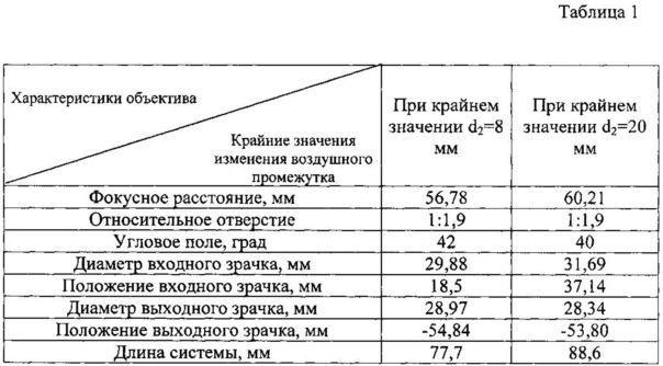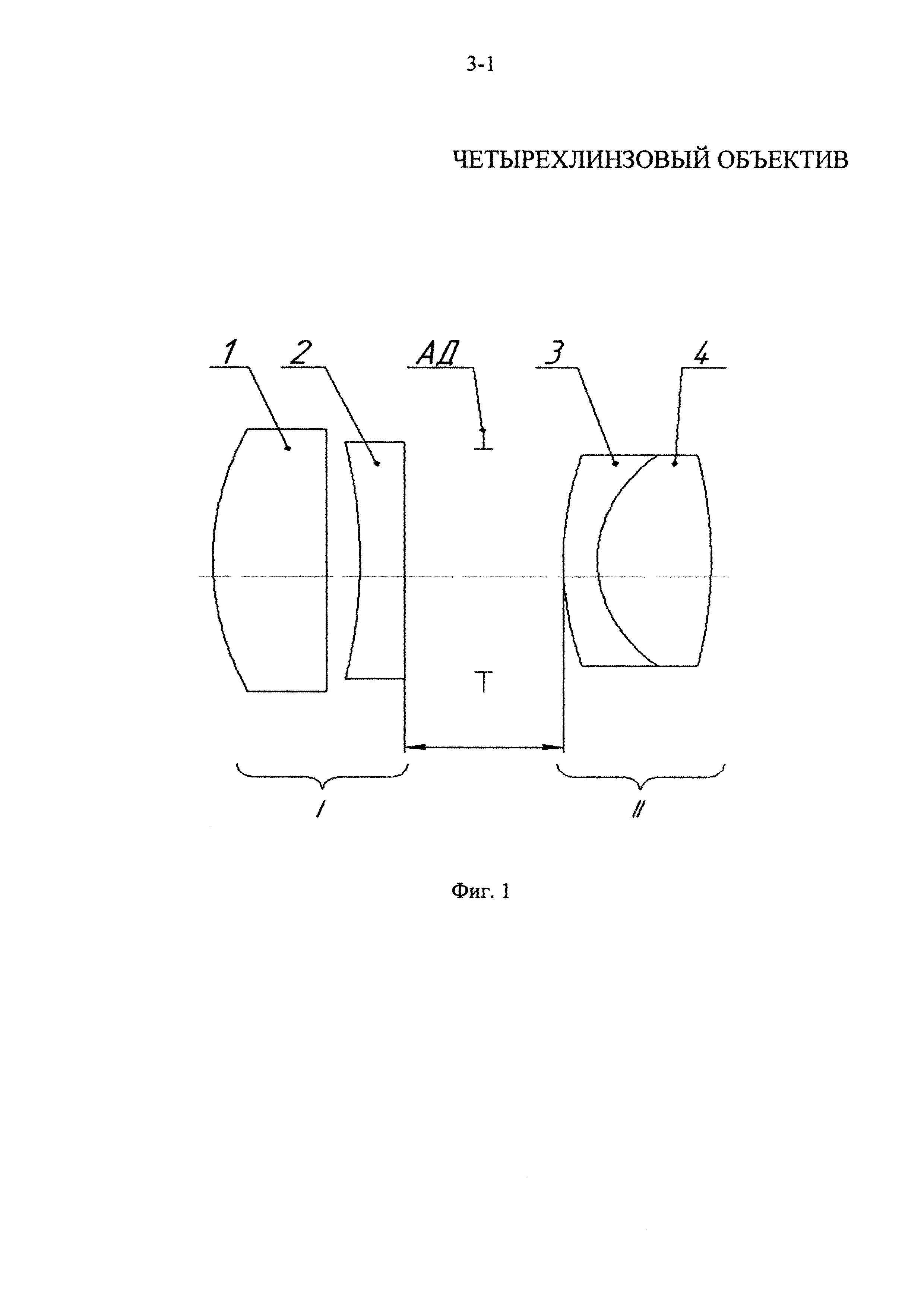Четырехлинзовый объектив, состоящий из двух компонентов, первый из которых по ходу лучей выполнен в виде положительной линзы и плосковогнутой линзы, обращенной вогнутостью к предмету, а второй компонент выполнен из отрицательного мениска, обращенного выпуклостью к предмету, и двояковыпуклой линзы, отличающийся тем, что первый компонент представлен в виде двух одиночных линз и, кроме того, первая линза по ходу лучей выполнена плосковыпуклой, обращенной выпуклостью к пространству предметов, а второй компонент выполнен в виде склейки двух линз, воздушный промежуток меняется от 0 до 0,4f', где f' - фокусное расстояние всей системы, между первым и вторым компонентами, кроме того, имеют место следующие соотношения: 1,5<n1=n4<1,6, 1,6<n3<1,7, 1,6<n2<1,7, n3<n2, где n1, n2, n3, n4 - показатели преломления материала по ходу лучей первой, второй, третьей и четвертой линз для линии спектра D.