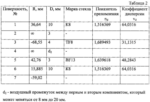 Изобретение может быть использовано в качестве фотографического объектива. Объектив состоит из двух компонентов. Первый компонент содержит две одиночные линзы – плосковыпуклую, направленную выпуклостью к пространству предметов, и плосковогнутую, направленную вогнутостью к пространству предметов. Второй компонент выполнен в виде склейки выпукло-вогнутого отрицательного мениска, направленного выпуклостью к пространству предметов, и двояковыпуклой линзы. Между показателями преломления материала n, n, n, nсоответственно первой, второй, третьей и четвертой линз для линии спектра D выполняются соотношения 1,5<n=n<1,6, 1,6<n<1,7, 1,6<n<1,7, n<n. Воздушный промежуток между компонентами объектива меняется от 0 до 0,4, где- фокусное расстояние всей системы, при этом качество изображения в центре сохраняется неизменным. Технический результат - повышение относительного отверстия, увеличение углового поля в пространстве предметов и возможность портретного фотографирования с изменяемым художественным восприятием фотографии. 2 ил., 2 табл.