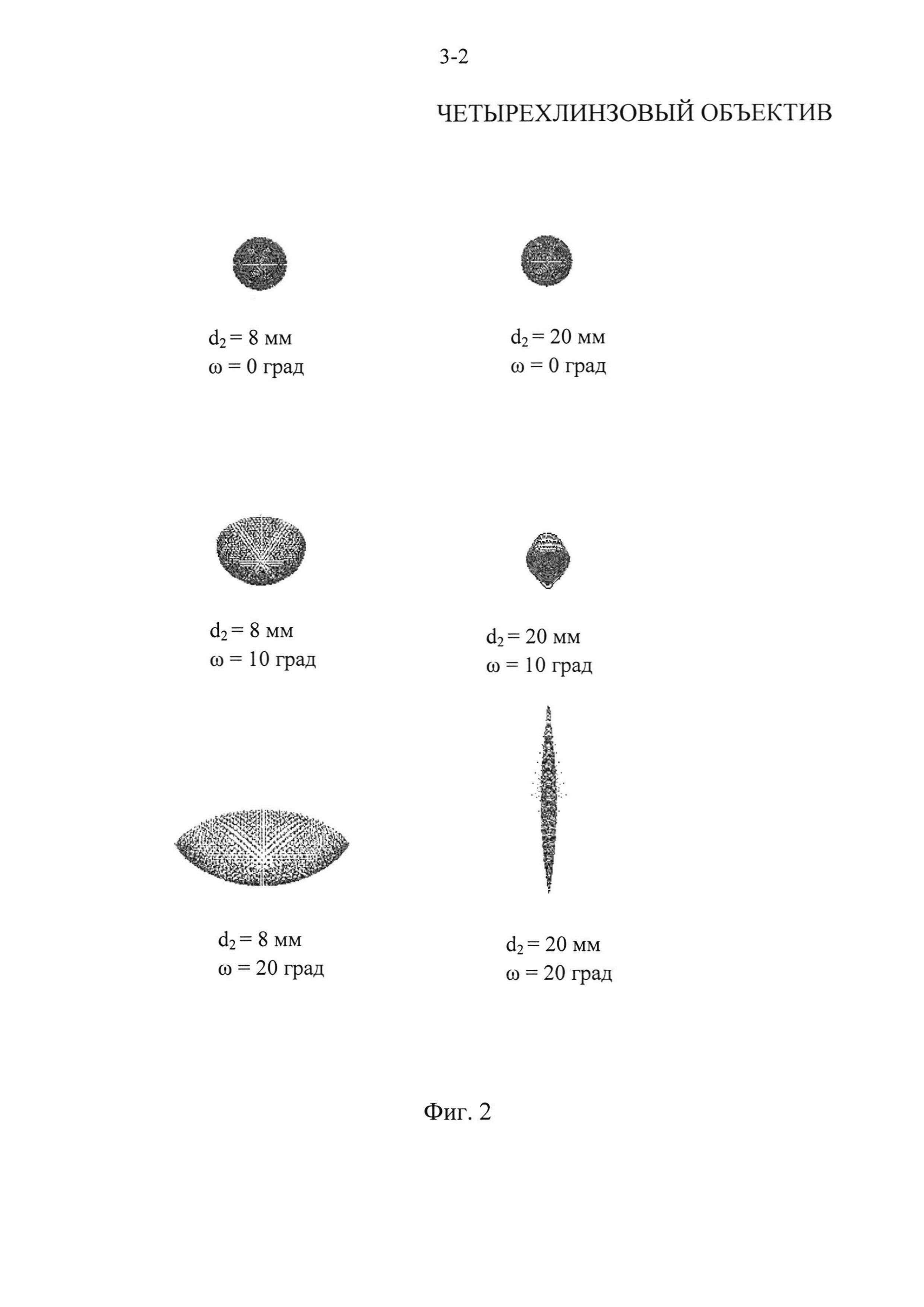 Изобретение относится к оптическому приборостроению и может быть использовано в качестве фотографического объектива. Известен четырехлинзовый фотографический портретный объектив Петцваля, описанный в справочнике «Вычислительная оптика» под общей ред. М.М. Русинова, Ленинград, «Машиностроение», Ленинградское отделение, 1984 г., рис. 34.1, табл. 34.1, стр. 355, 356, состоящий из двух компонентов, разделенных воздушным промежутком, первый из которых по ходу лучей склеен из двояковыпуклой и двояковогнутой линз, второй состоит по ходу лучей из одиночных отрицательного мениска, обращенного вогнутостью к изображению, и двояковыпуклой линзы, причем имеют место соотношения: n1=n4=1,5181, n2=1,5783, где n1, n2, n4 - показатели преломления материала по ходу лучей первой, второй и четвертой линз для линии спектра D. Входной зрачок - апертурная диафрагма в объективе совпадает с первой поверхностью. Однако данный объектив имеет относительное отверстие 1:3, угловое поле в пространстве предметов 2W=30 град, что недостаточно для получения качественных портретных снимков. Наиболее близким аналогом является четырехлинзовый фотографический объектив Петцваля, описанный в патенте US №2500046, 359/786, МПК G02B 9/12, G02B 13/00, опубл. 07.03.1950 г. Четырехлинзовый фотографический объектив Петцваля состоит из двух компонентов, разделенных воздушным промежутком. Первый по ходу лучей компонент выполнен в виде склеенного дублета, состоящего из двояковыпуклой линзы и вогнуто-плоской отрицательной линзы, обращенной вогнутостью к предмету, а второй компонент по ходу лучей состоит из одиночных отрицательного мениска, обращенного выпуклостью к предмету, и двояковыпуклой линзы. Однако данный объектив имеет относительное отверстие 1:2,0, угловое поле в пространстве предметов с прохождением главного луча 2W=24 град, что недостаточно для получения качественных снимков, и не обладает возможностью изменять художественное восприятие фотографии с помощью изменения формы размытия кружка рассеяния. Задачей изобретения является создание объектива с повышенными функциональными возможностями. Технический результат - повышение относительного отверстия, увеличение углового поля в пространстве предметов и возможность портретного фотографирования с изменяемым художественным восприятием фотографии. Это достигается тем, что в четырехлинзовом объективе, состоящем из двух компонентов, первый из которых по ходу лучей выполнен в виде положительной линзы и плоско-вогнутой линзы, обращенной вогнутостью к предмету, а второй компонент выполнен из отрицательного мениска, обращенного выпуклостью к предмету, и двояковыпуклой линзы, в отличие от известного первый компонент представлен в виде двух одиночных линз и, кроме того, первая линза по ходу лучей выполнена плосковыпуклой, обращенной выпуклостью к пространству предметов, а второй компонент выполнен в виде склейки двух линз, воздушный промежуток меняется от 0 до 0,4 1,5<n1=n4<1,6, 1,6<n3<1,7, 1,6<n2<1,7, n3<n2, где n1, n2, n3, n4 - показатели преломления материала по ходу лучей первой, второй, третьей и четвертой линз для линии спектра D. На фиг. 1 представлена оптическая схема четырехлинзового объектива. На фиг. 2 представлены изображения кружков рассеяния в плоскости, удаленной на 1 мм от плоскости наилучшего изображения, для угловых полей в пространстве предметов ω=0 град, ω=10 град, 