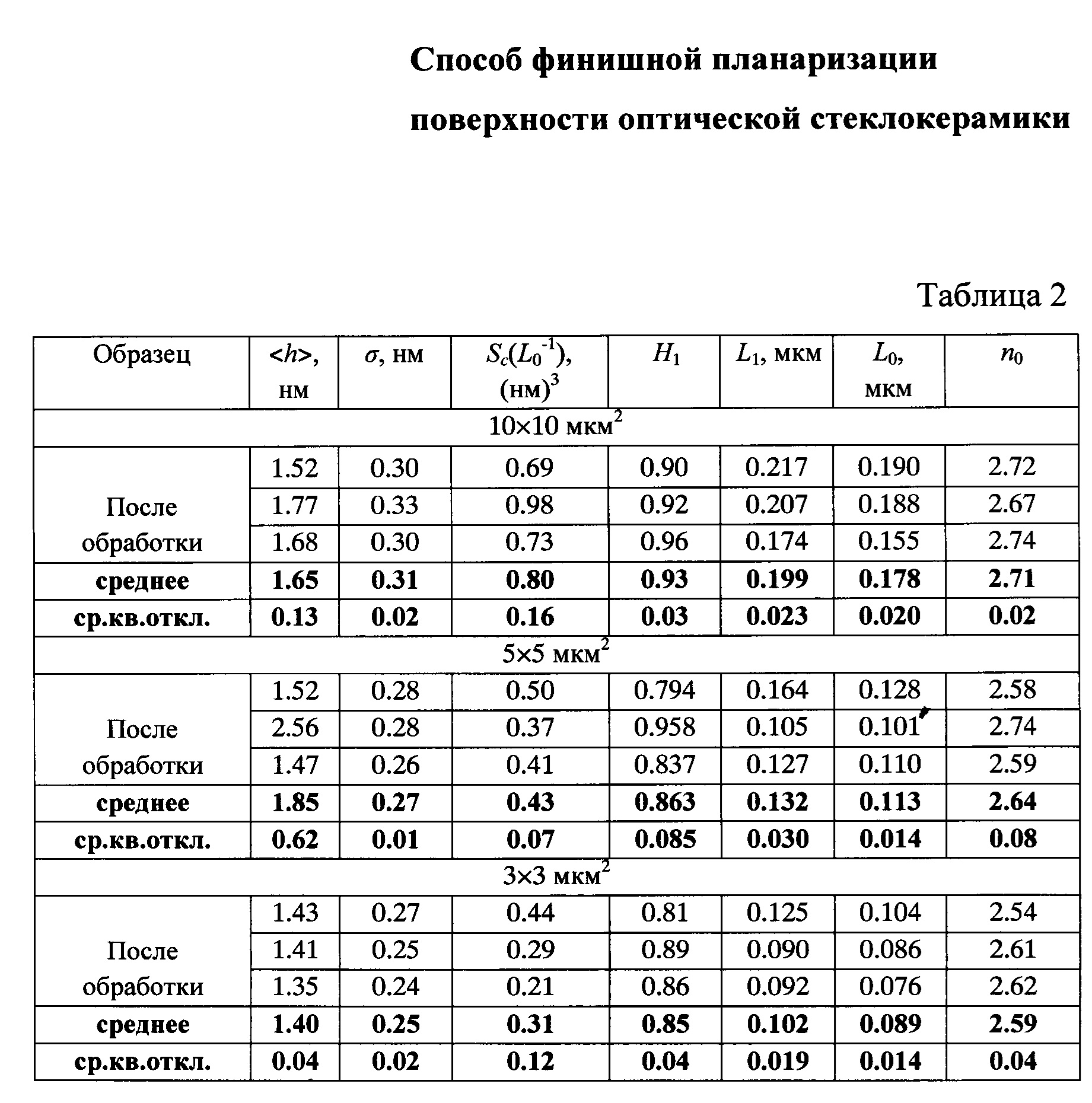 Изобретение относится к способу финишной планаризации поверхности оптической стеклокерамики. Обработку поверхности оптической стеклокерамики проводят в две стадии. На первой стадии осуществляется обработка поверхности оптической стеклокерамики пучками ускоренных кластерных ионов аргона. Далее на второй стадии проводится обработка пучками ускоренных нейтральных атомов аргона. При этом ускоряющее напряжение на обеих стадиях обработки находится в диапазоне 10-30 кВ, время обработки на каждой из стадий устанавливается не более 15 минут, при давлении остаточных газов не более 4×10-2 Па. Технический результат – упрощение технологического процесса планаризации поверхности при одновременном снижении среднеквадратичной шероховатости поверхности оптической стеклокерамики на 30% относительно их исходного состояния. 2 табл., 2 ил.