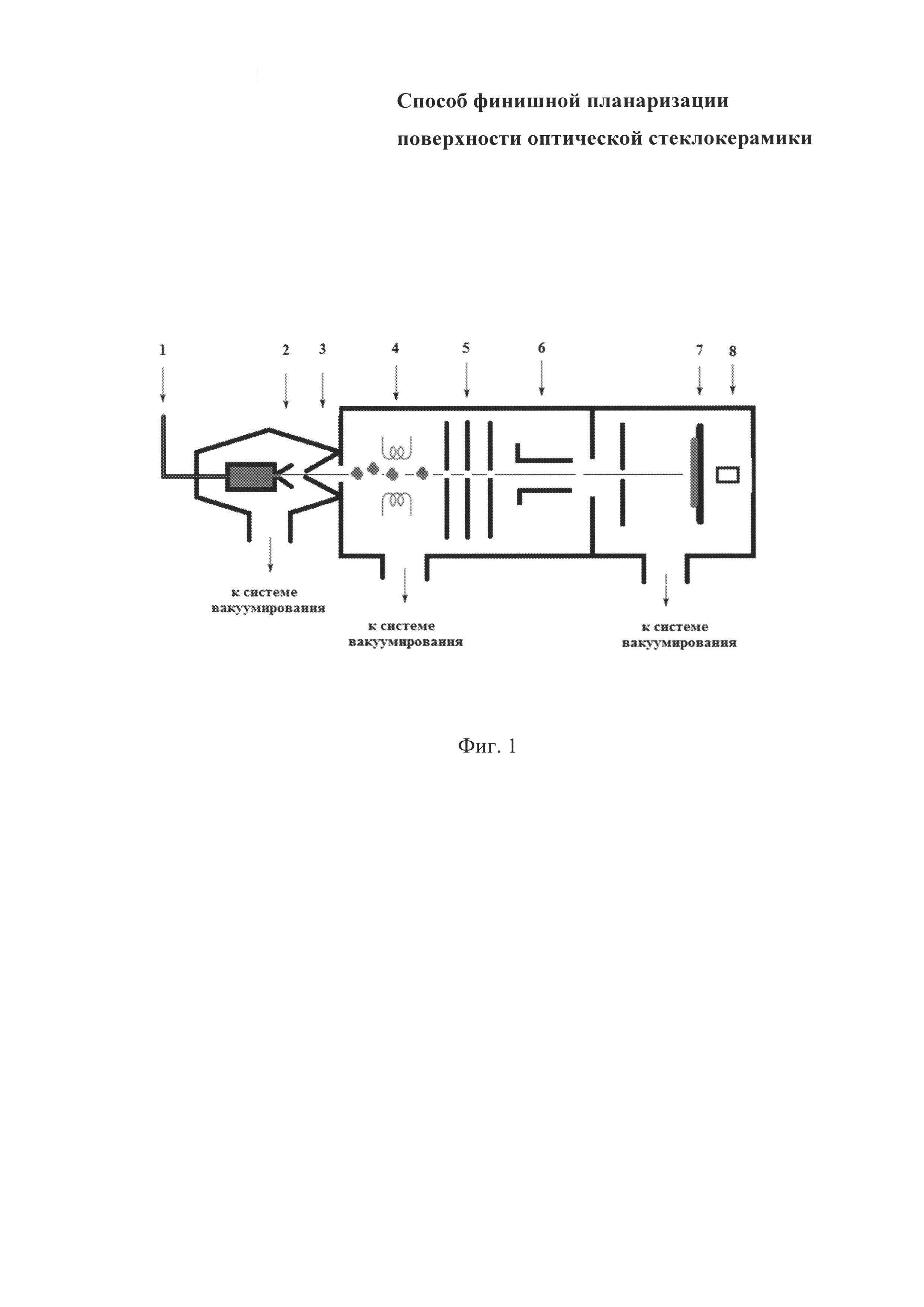Способ финишной планаризации поверхности оптической стеклокерамики, включающий двухстадийную обработку поверхности оптической стеклокерамики с помощью пучка газовых кластерных ионов, отличающийся тем, что на первой стадии осуществляется обработка поверхности оптической стеклокерамики пучками ускоренных кластерных ионов аргона, далее на второй стадии проводится обработка пучками ускоренных нейтральных атомов аргона, при этом ускоряющее напряжение на обеих стадиях обработки находится в диапазоне 10-30 кВ, время обработки на каждой из стадий устанавливается не более 15 мин при давлении остаточных газов не более 4×10-2 Па.