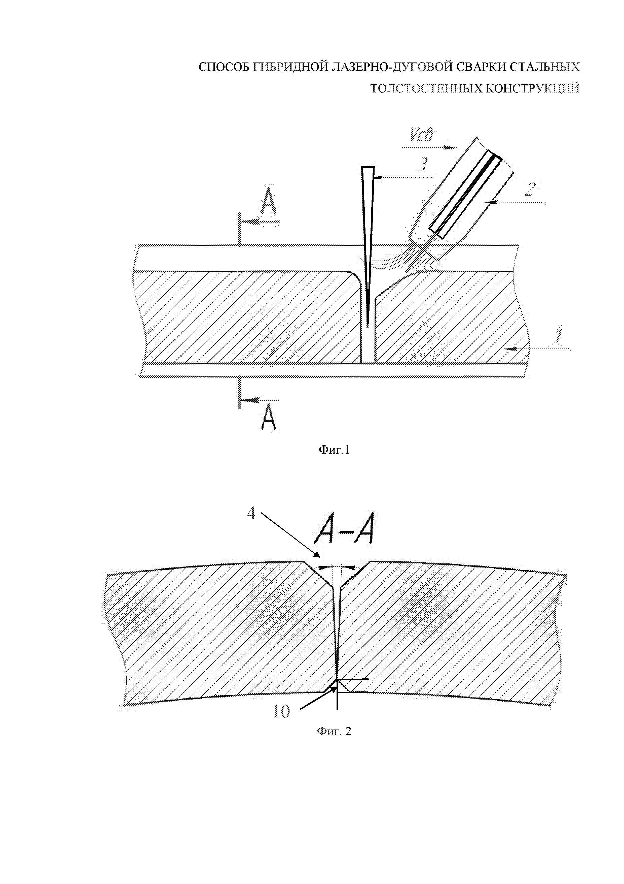 Изобретение относится к сварке толстостенных металлоконструкций, в частности, к сварке продольных швов сформованной цилиндрической заготовки и может быть использовано при производстве сварных труб большого диаметра – от 500 мм – с толщиной стенки от 25 мм до 50 мм, а также при производстве баллонов, корпусов подводных труб и других толстостенных металлических конструкций. Стальные толстостенные трубы большого диаметра (далее – ТБД) применяются в нефтегазовой промышленности для транспортирования углеводородов под высоким давлением, поэтому к сварным соединениям ТБД выдвигаются высокие технические требования. Данные трубы производят путём формовки трубной заготовки из листового проката с последующей дуговой сваркой на трубоэлектросварочном стане. Дуговая сварка, как правило, выполняется с помощью нескольких сварочных дуг, горящих под слоем флюса в одну сварочную ванну. Недостатками данного способа сварки являются: низкая производительность; шлаковые включения в сварном шве из-за большого объёма расплавленного металла, затрудняющего выход шлака на поверхность; большая погонная энергия, что приводит к увеличению зоны термического влияния, разупрочнению этой зоны, её высокой твердости и низким вязко-пластическим свойствам. В условиях трубопровода большого давления наличие такой зоны может привести к протяженному и неконтролируемому разрушению в случае возникновения каких-либо аварий. В настоящее время всё чаще рассматриваются альтернативные способы сварки ТБД. Одним из наиболее перспективных способов сварки при производстве ТБД, является гибридная лазерно-дуговая сварка (фиг. 1), при которой накладывают гибридный рабочий (корневой) шов, сочетая лазерную и дуговую сварку в среде защитного газа, а затем – облицовочные дуговые швы с частичным переплавлением гибридного шва. При этом перед гибридным рабочим швом могут также накладывать сборочный (технологический) шов, фиксирующий кромки между собой. Достоинством этого способа производства ТБД является высокая производительность и высокие механические характеристики сварного шва. Также одной из ключевых особенностей данного способа сварки является минимальная зона термического влияния вследствие узконаправленного и высококонцентрированного действия лазерного луча. При сварке толстых стенок от 25 мм и выше эта особенность лазерной и гибридной лазерно-дуговой сварки выходит на передний план и позволяет исключить разупрочнение зоны термического влияния от сварки. Недостатком гибридной лазерно-дуговой сварки является то, что при производстве толстостенных ТБД при толщине стенки от 25 мм и выше заметно снижается коэффициент полезного действия (КПД) и проплавляющая способность лазерного излучения значительно сокращается. Это связано с тем, что парогазовый канал становится протяжённым. Лазерный луч, проходя сквозь него, может испытывать многократные переотражения, и в корень сварочной каверны проходит незначительная плотность мощности, которая уже не способна к дальнейшему проплавлению металла вглубь. К тому же, при подаче высокой мощности в верхней части сварочной ванны интенсивно выделяются пары металла, происходит его кипение, что приводит к образованию пор, трещин и несплавлений, и разбрызгивание жидкой фазы, что также может экранировать луч, сниж