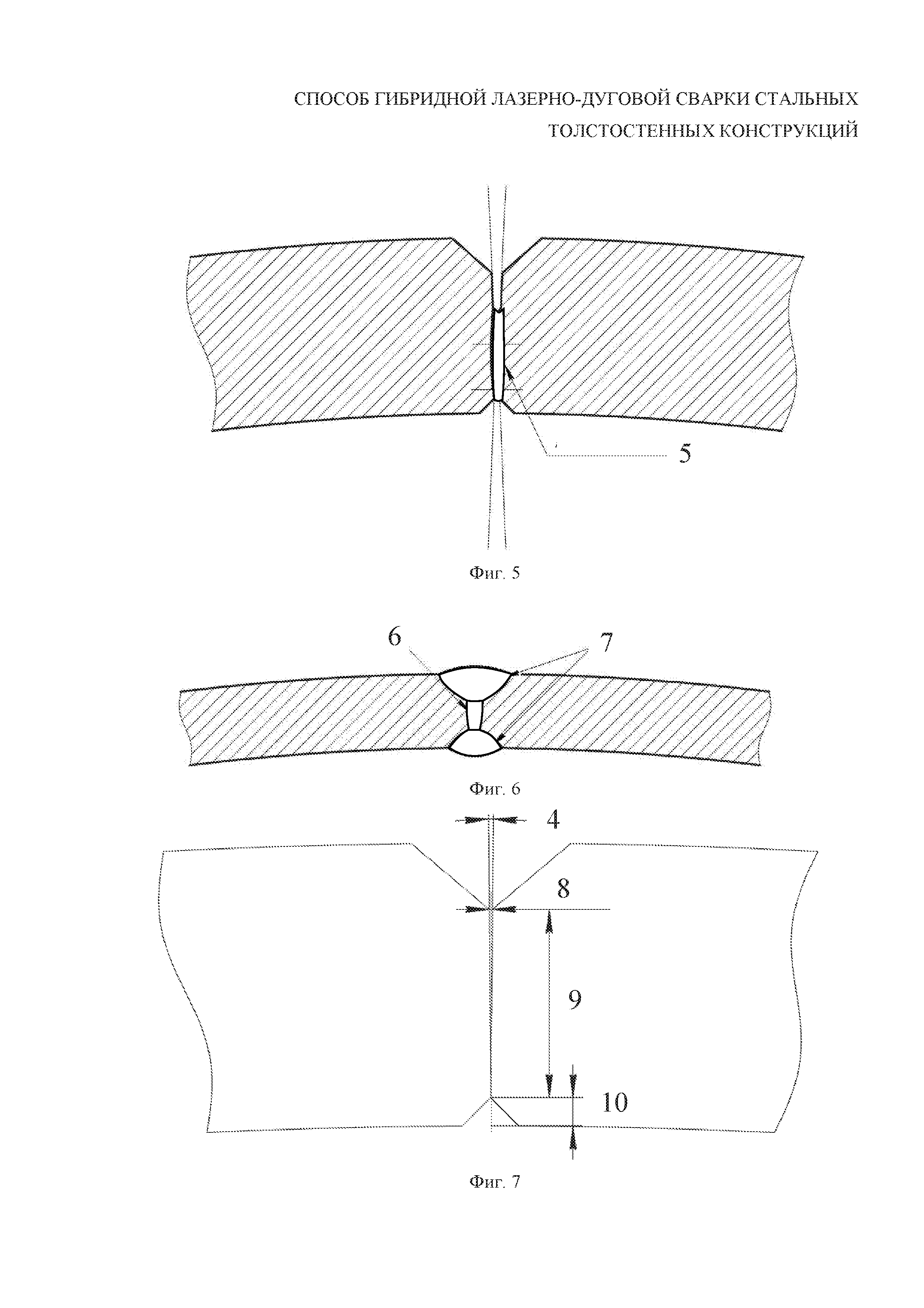 1. Способ гибридной лазерно-дуговой сварки стальных толстостенных конструкций, включающий выполнение разделки кромок с притуплением и гибридную лазерно-дуговую сварку рабочего шва, причем электрическую дугу располагают перед лазерным лучом, отличающийся тем, что выполняют симметричную разделку кромок с участками притупления кромок под углом 1-5° друг к другу, лазерную сварку осуществляют расфокусированным лазерным лучом с расположением фокуса луча выше свариваемых поверхностей и диаметром d лазерного луча в области его падения на свариваемые поверхности, который рассчитывают по следующему соотношению: d=2h⋅tg(α/2)-k, где α - угол между участками притупления кромок друг к другу, равный 1-5°; d - диаметр расфокусированного лазерного луча в области падения лазерного луча на свариваемые поверхности металла, мм; h - высота участка притупления, мм; k - коэффициент, равный 0-0,3, мм. 2. Способ по п. 1, отличающийся тем, что перед рабочим швом выполняют сборочный шов. 3. Способ по п. 1, отличающийся тем, что после рабочего шва выполняют наружный и внутренний облицовочные швы. 4. Способ по п. 1, отличающийся тем, что выполняют Х-образную разделку с двумя симметричными прямолинейными скосами двух кромок. 5. Способ по п. 1, отличающийся тем, что выполняют Y-образную разделку с прямолинейным скосом двух кромок.