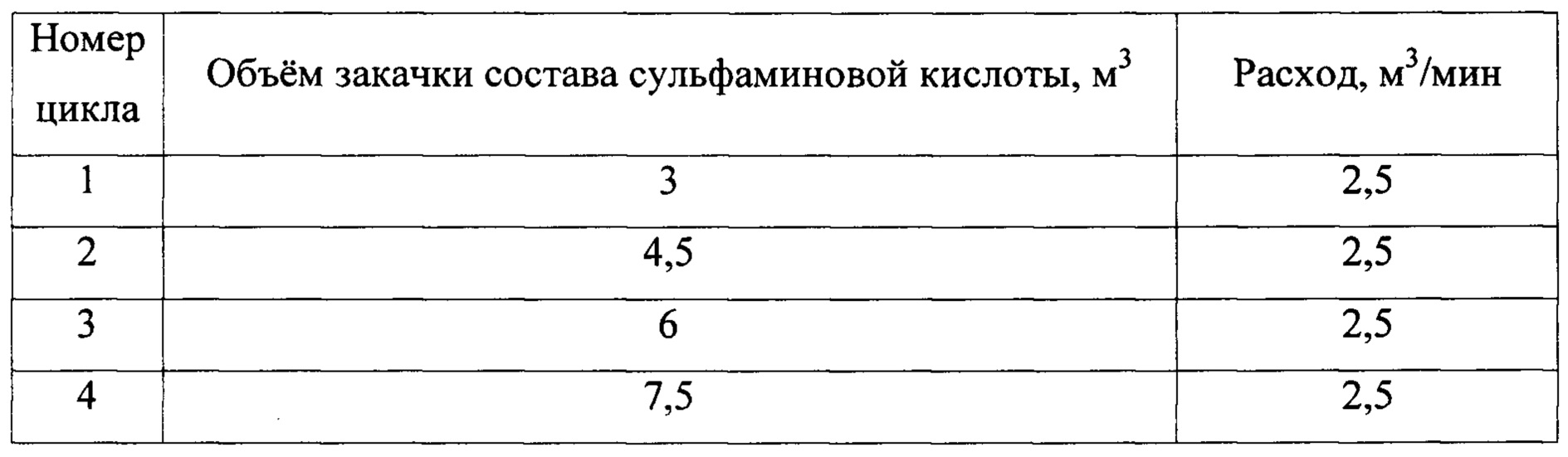 Способ гидравлического разрыва пласта - ГРП в скважине, включающий перфорацию стенок скважины в необходимом интервале скважины каналами глубиной не менее протяженности зоны концентрации напряжений в породах от ствола скважины, спуск колонны труб в зону ГРП с герметизацией межтрубного пространства пакером выше интервала перфорации, закачку порциями по колонне труб в скважину гелеобразной жидкости разрыва и кислоты, выдержку, удаление продуктов реакции кислоты с породой, распакеровку пакера и извлечение его с колонной труб из скважины, отличающийся тем, что закачивают гелеобразную жидкость разрыва с 1 т кварцевого песка со ступенчатым увеличением концентрации кварцевого песка в процессе закачки гелеобразной жидкости разрыва, далее производят циклическую закачку состава сульфаминовой кислоты в 4 цикла с увеличением порции закачиваемого состава сульфаминовой кислоты на 1,5 м3 с каждым циклом, по окончании закачки последней порции состава сульфаминовой кислоты в скважину закачивают СО2 в жидком состоянии в объеме 10% от общего объема состава сульфаминовой кислоты, затем продавливают 2%-ный водный раствор KCl в объеме 1,1 от объема скважины, при этом в процессе ГРП все компоненты закачивают с одним значением расхода, останавливают процесс ГРП, осуществляют выдержку в течение 24 ч, ступенчато стравливают давление до нуля по 5,0 МПа с выдержкой 10 мин, удаляют продукты реакции кислоты с породой пласта свабированием, распакеровывают пакер и извлекают его с колонной труб из скважины.