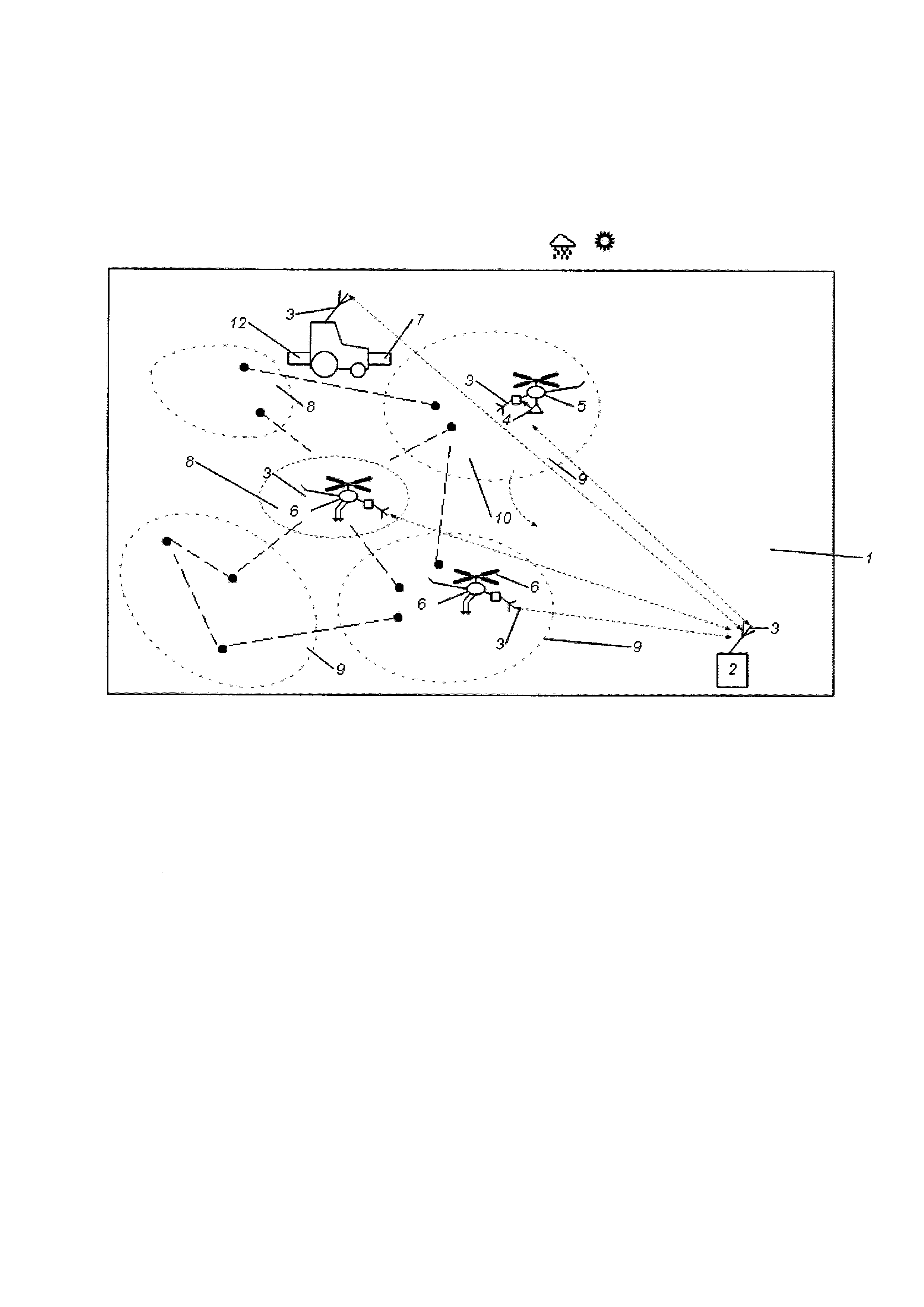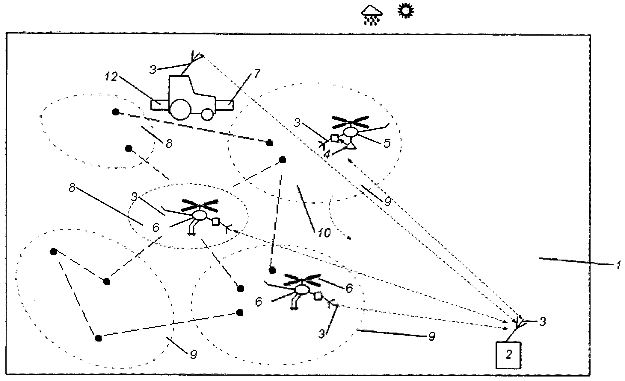 Изобретение относится к области полевого растениеводства и может быть использовано при производстве сельхозпродукции. Известны способ и устройство управления агрообъектами, предусматривающие для оценки состояния и потенциала плодородия почвы, получения информации о состоянии посевов и почвы при возделывании агрокультур, использование данных аэрофотосъемки агроугодий и забор проб почвы в различных частях угодья (Якушев В. П. Информационные технологии точного земледелия в России: практический опыт, экономическая эффективность и перспективы развития / Материалы Всероссийской конференции (с международным участием) «Математические модели и информационные технологии в аграрной биологии: итоги и перспективы», 14-15 октября 2010 г., Санкт-Петербург.- СПб.: АФИ, 2010. с 62-68). Известны способ и устройство управления агрообъектами, предусматривающие контроль состояния развития агрокультур и техногенные воздействия на технологические процессы в зонах депрессивного развития агрокультур на сельхозугодье. Известное устройство автоматического управления процессами возделывания агрокультур содержит лабораторно-управляющий комплекс, модуль визуального контроля состояния агрокультур на возделываемом угодье, модуль доставки фрагментов агрокультур с сельхозугодья в лабораторно-управляющий комплекс (патент РФ №2538997). Недостатками известных технических решений является то, что увеличение урожайности агрокультур проявляется в зонах, где эти воздействия осуществляют. На остальной части сельхозугодья урожайность остается прежней или уменьшается из-за влияния агрокультур зон депрессивного развития на агрокультуры в других зонах. При этом общая эффективность технологических процессов на сельхозугодье возрастает незначительно, а материальные затраты и затраты технологических и энергетических ресурсов высоки. Наиболее близкими к предлагаемому изобретению относится способ и устройство автоматического управления агрообъектами, включающие ускорение развития агрокультуры в зонах депрессивного развития и зонах удовлетворительного развития за счет выполнения специализированными рабочими машинами технологических воздействий на агрокультуры в зонах опережающего развития. Кроме этого на сельхозугодьях создают зоны опережающего развития агрокультур, которые сопрягают с зонами депрессивного и удовлетворительного развития агрокультур, а негативное влияние кооперативного биоинформационного взаимодействия агрокультур зон депрессивного развития на агрокультуры в пограничных зонах опережающего и удовлетворительного развития ослабляют, ограничивая миграцию зон депрессивного развития по сельхозугодью. Известное в устройство автоматического управления агрообъектами содержит лабораторно-управляющий комплекс, модуль визуального контроля состояния агрокультур на сельхозугодье, блок передачи информации, беспилотный летающий аппарат с размещенными на его борту рабочими органами, наземные технологические рабочие агрегаты (Патент РФ 2617340). Недостатком известного технического решения является не учет в реализации управления агрообъектами постоянного изменения характеристик агрокультур в зонах сельхозугодья. Выполнение стимулирующих воздействий на агрокультуры осуществляют после однократной оценки их параметро